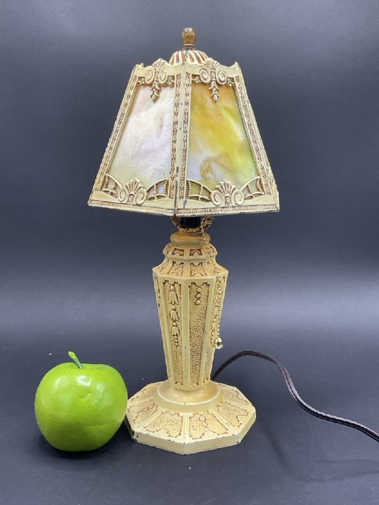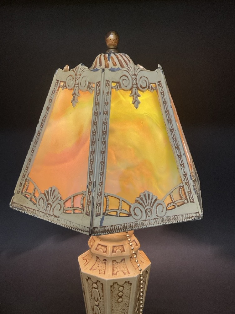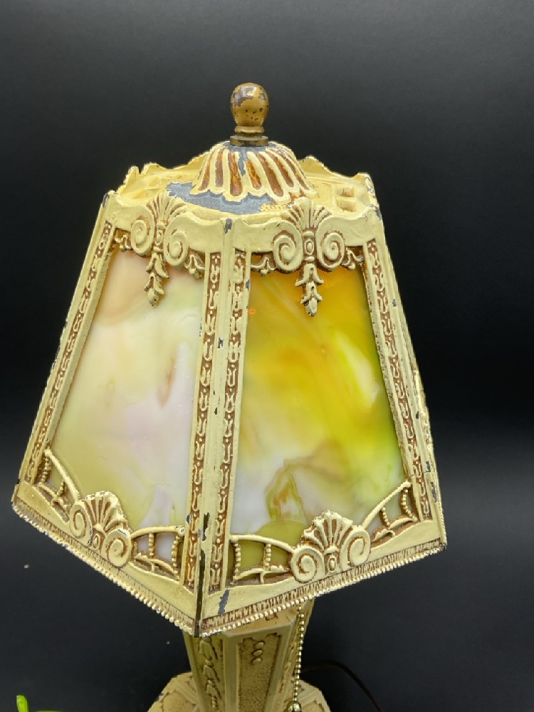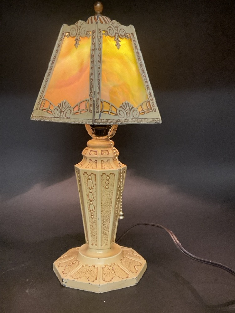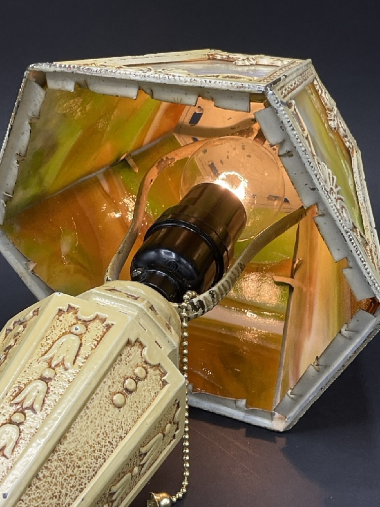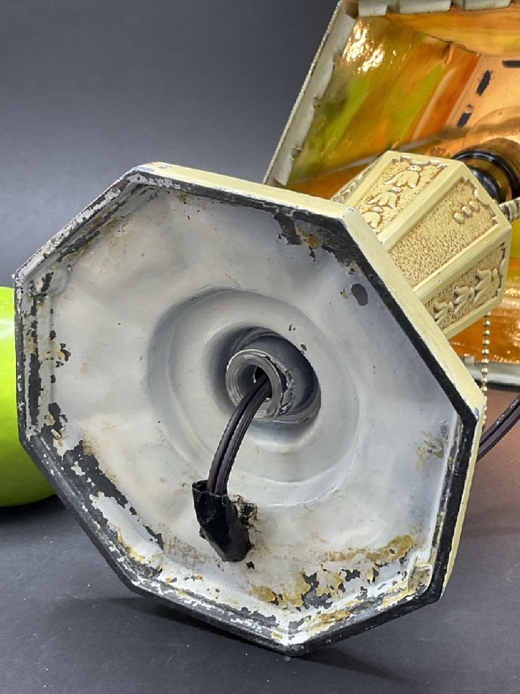 Working order. No damage to slag glass. Some paint loss consistent with age.
