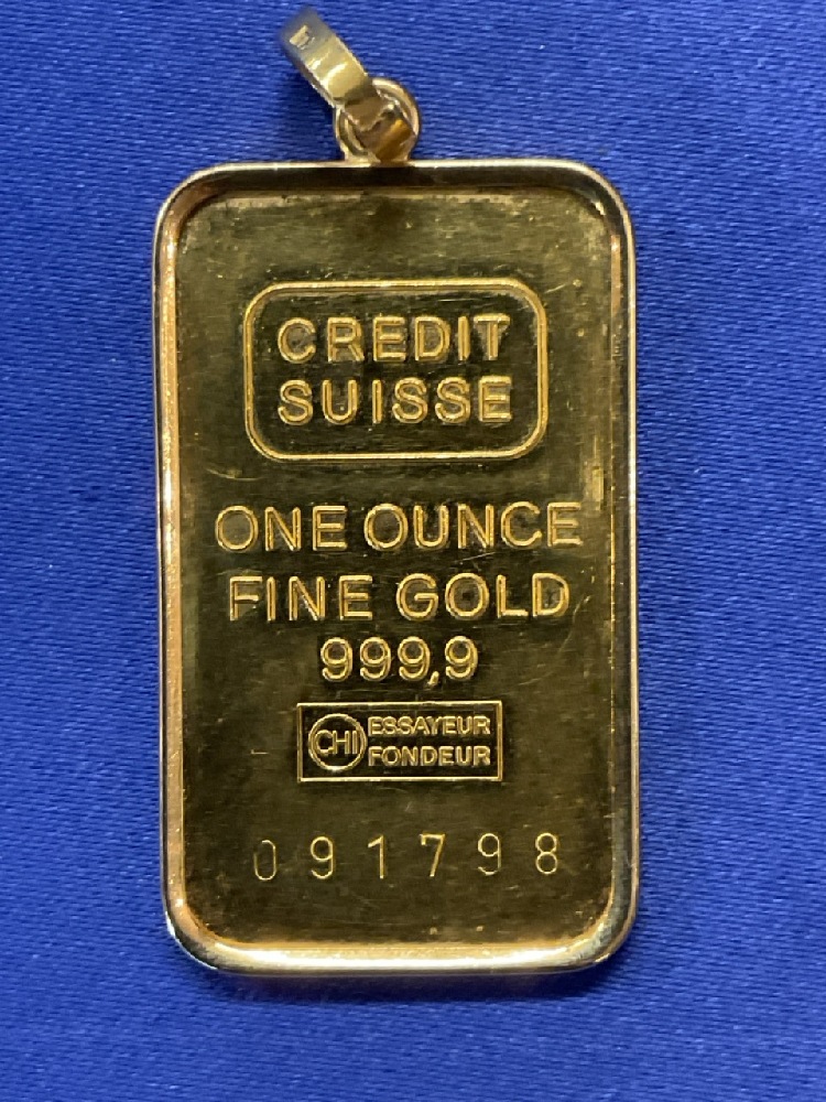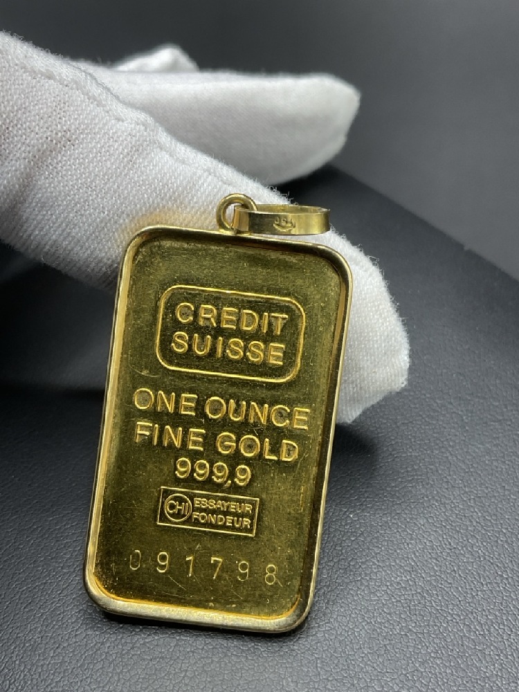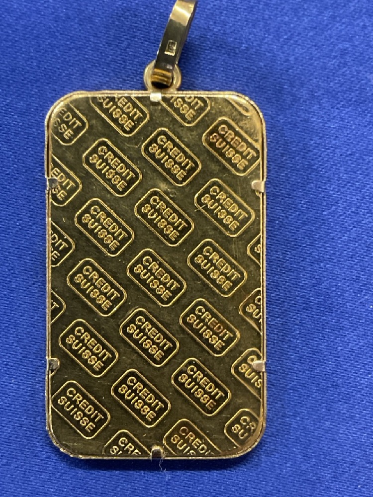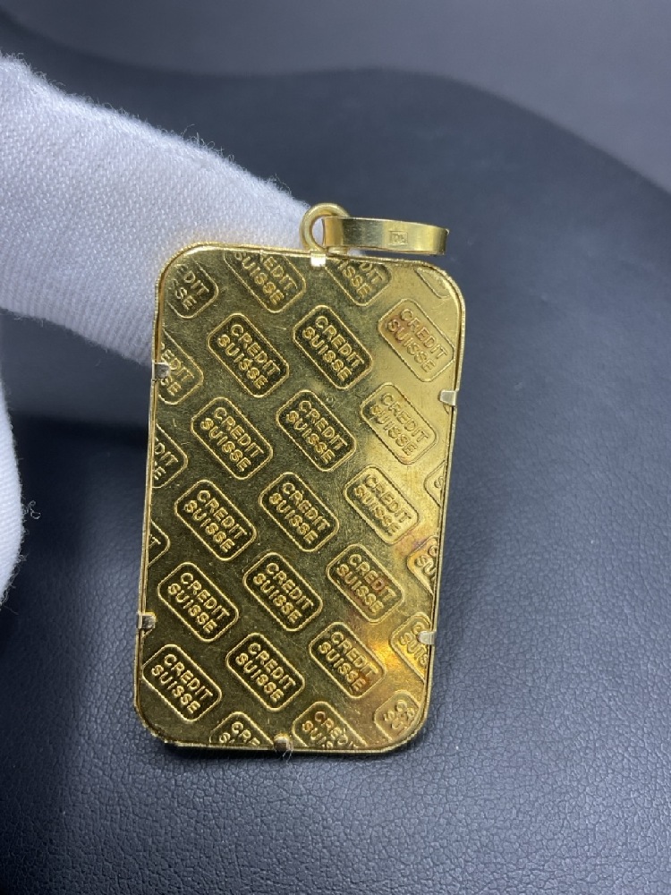 1oz. Credit Suisse .999 Gold Bullion Bar Jewelry Pendant. 18K Gold Frame.