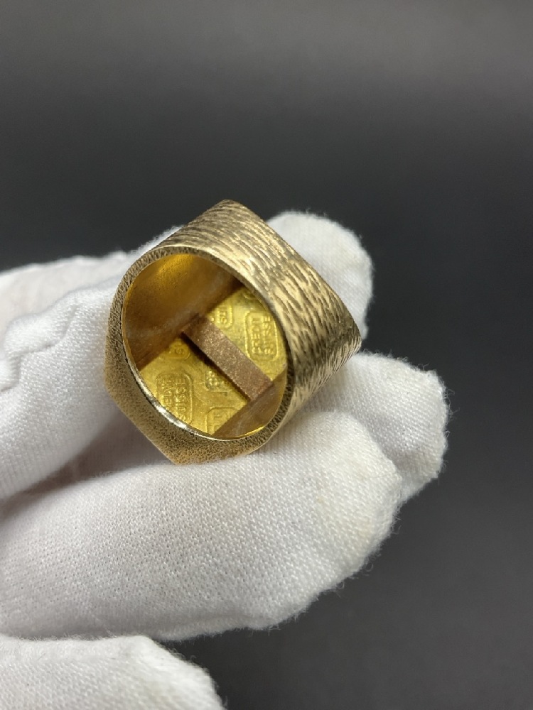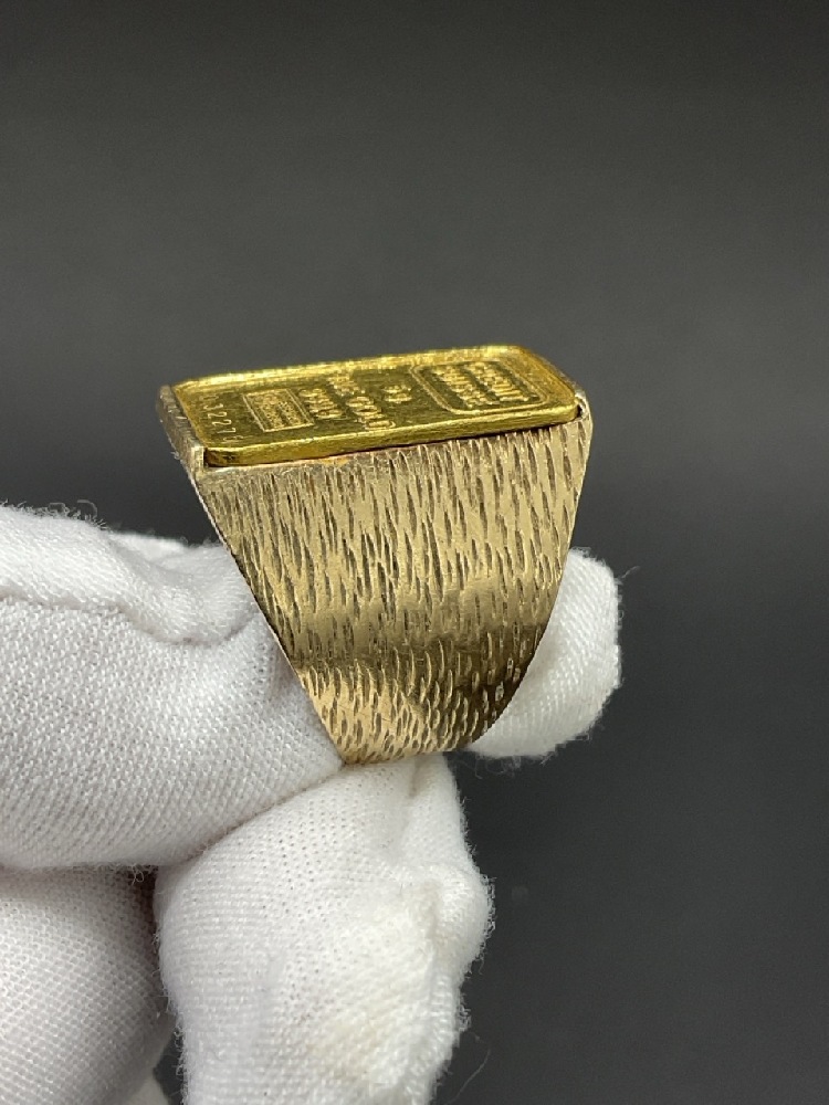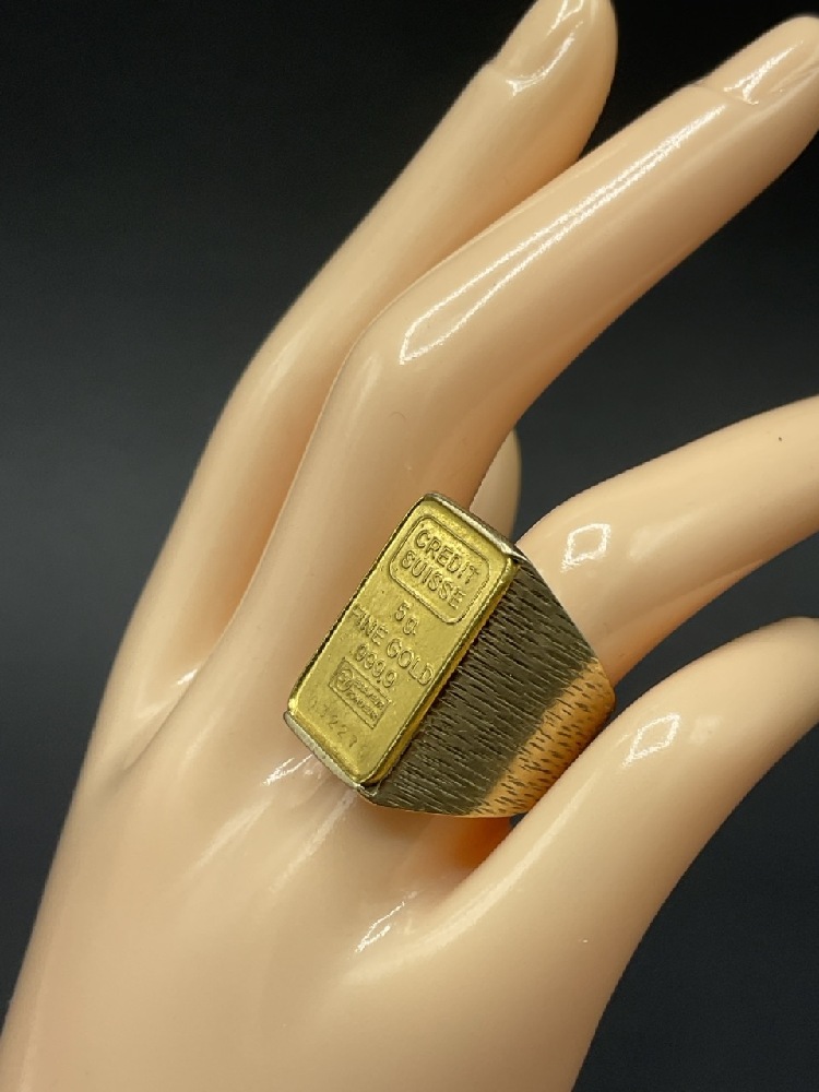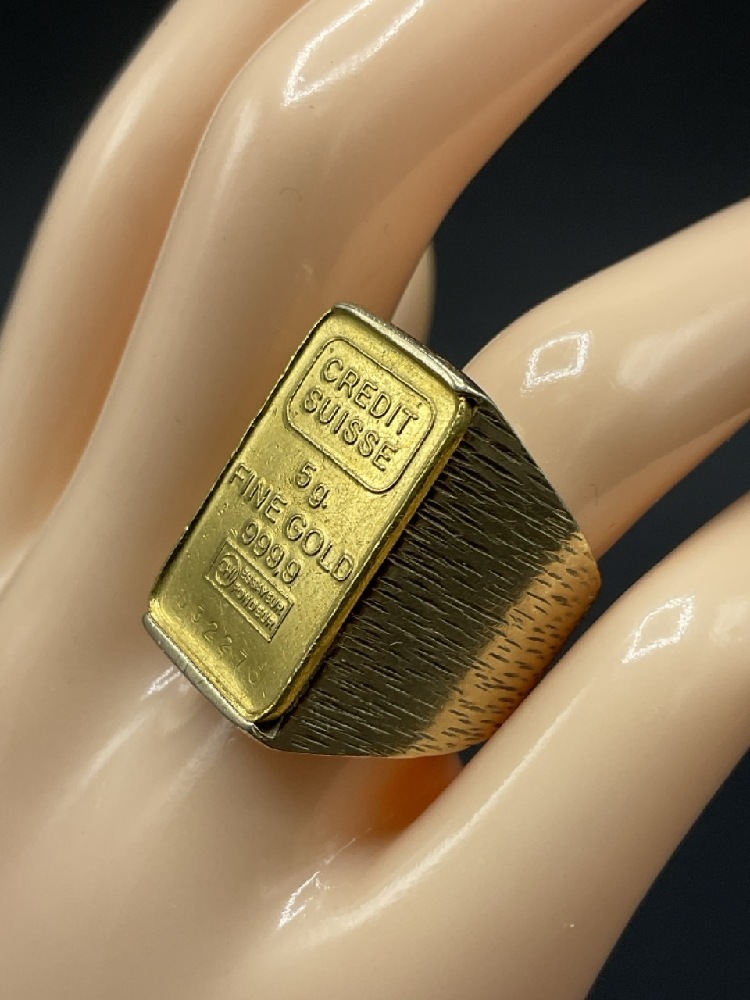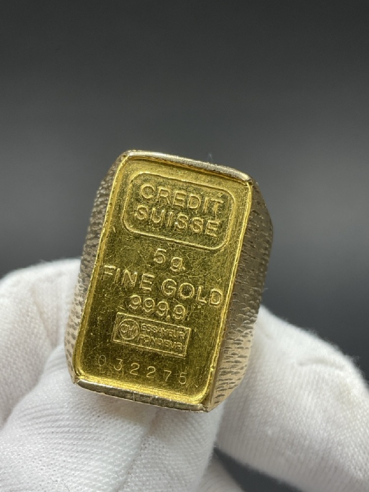 .999 Credit Suisse 5g Gold Ring set in 14K yellow gold.