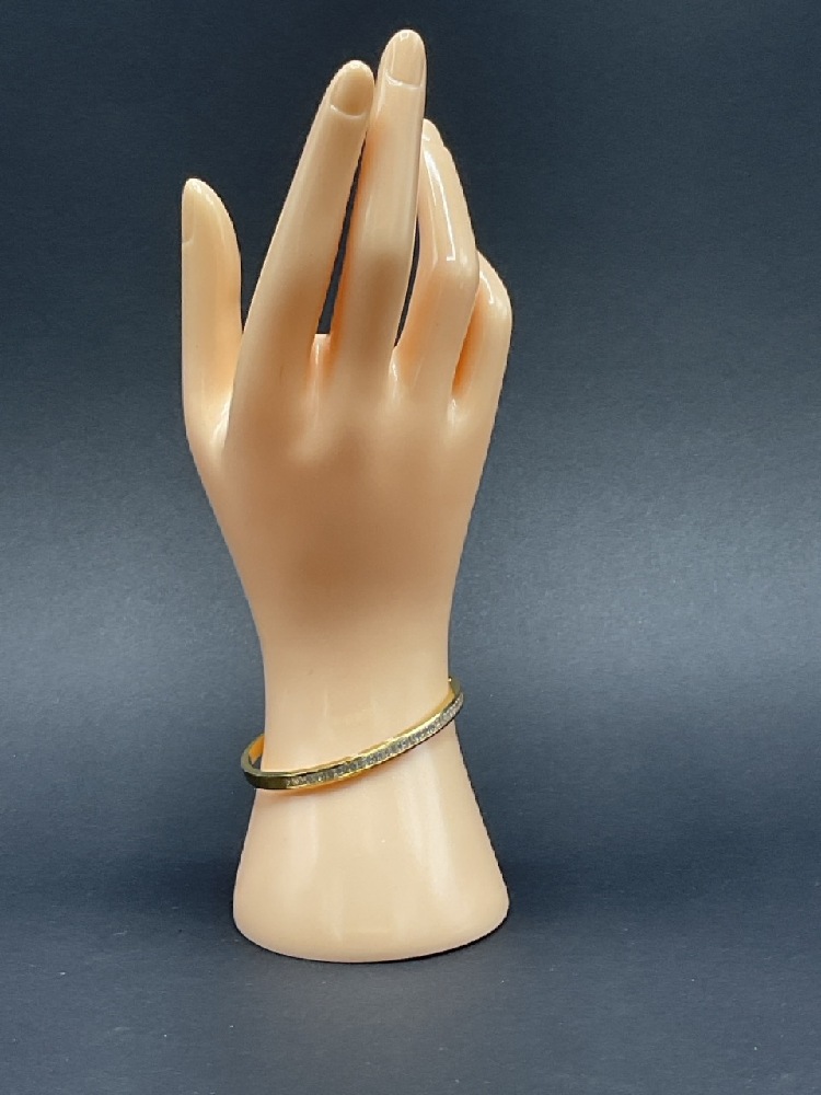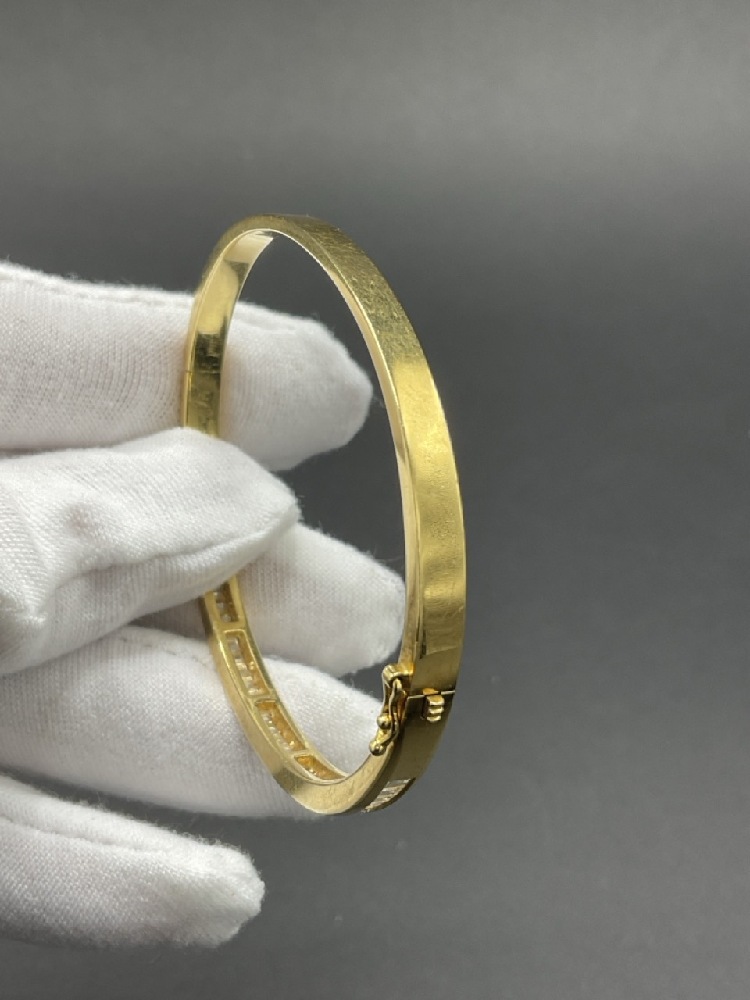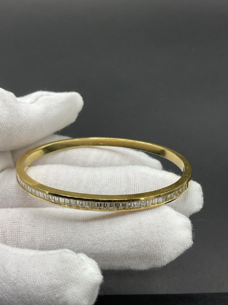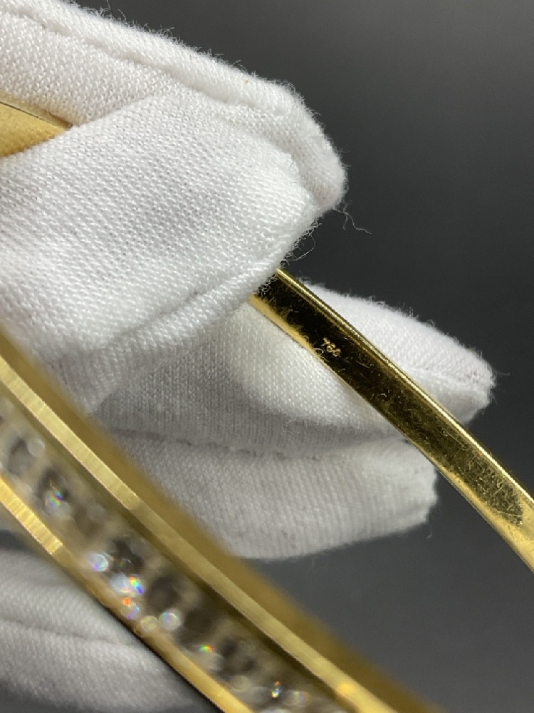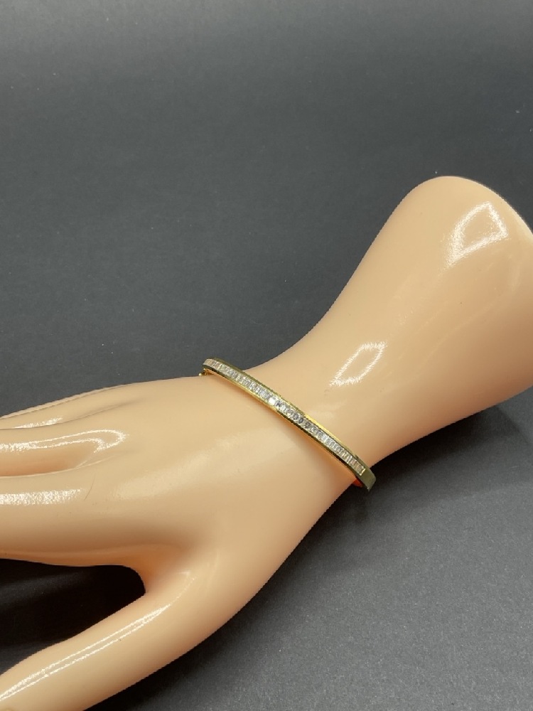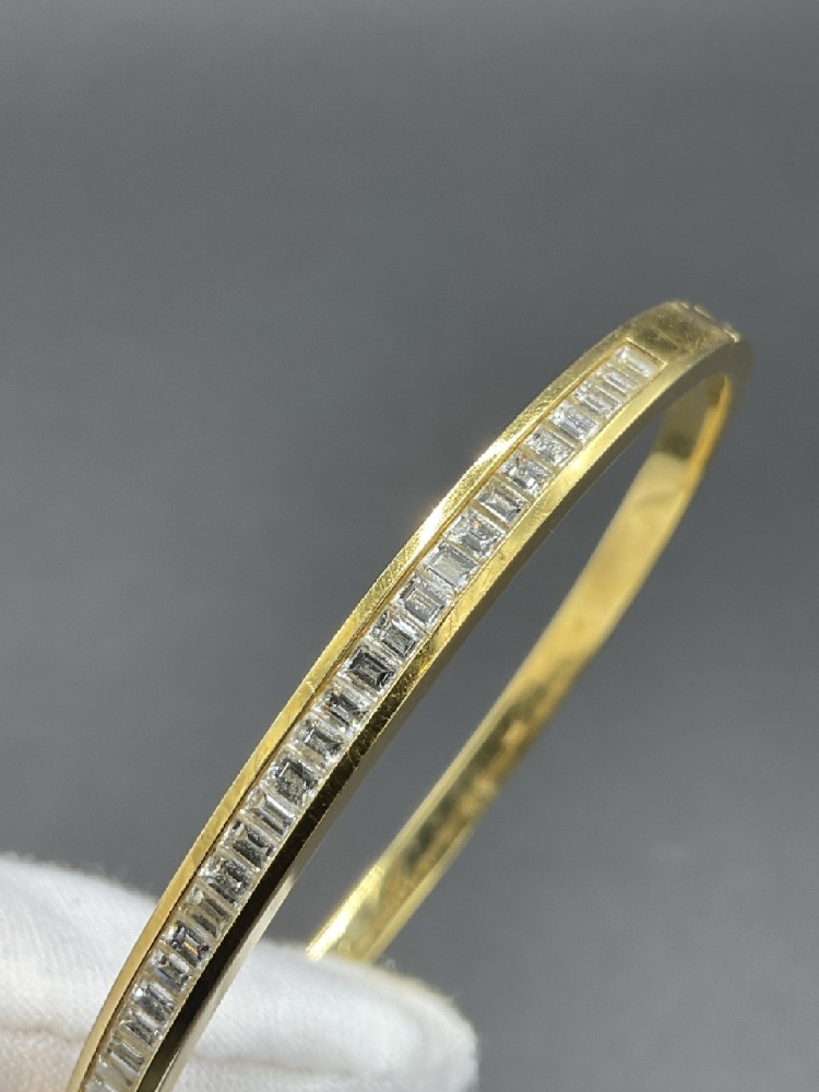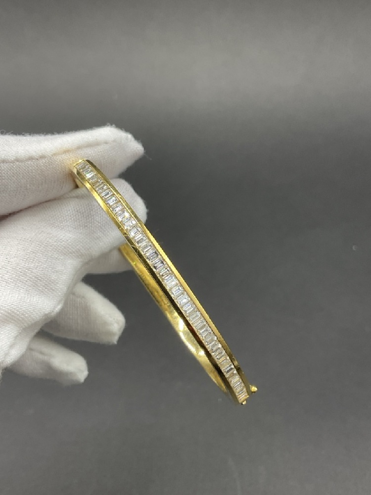 18K Yellow Gold Diamond Baguette Hinged Bracelet. A total of 38 diamond baguette stones. Marked 750.