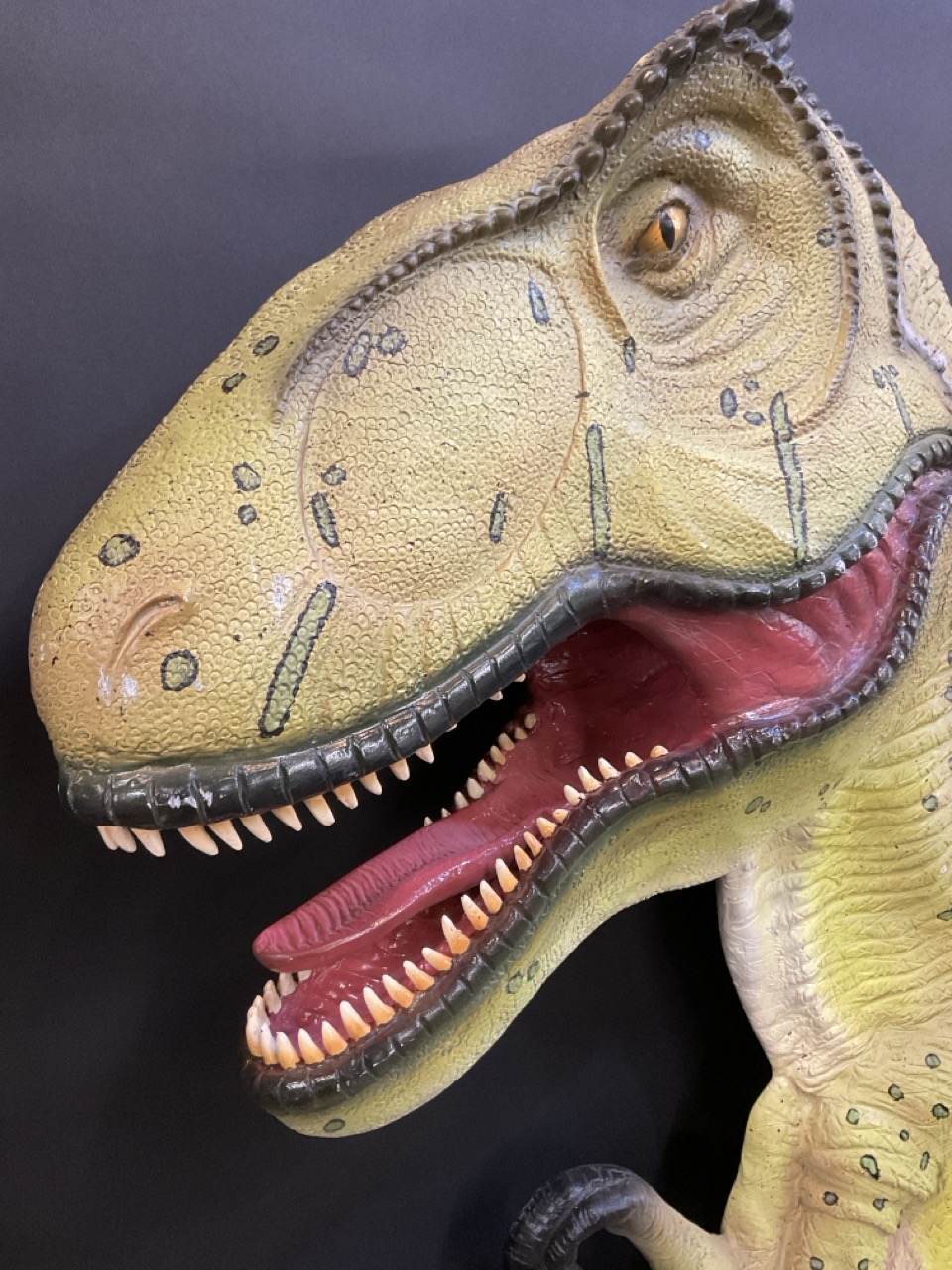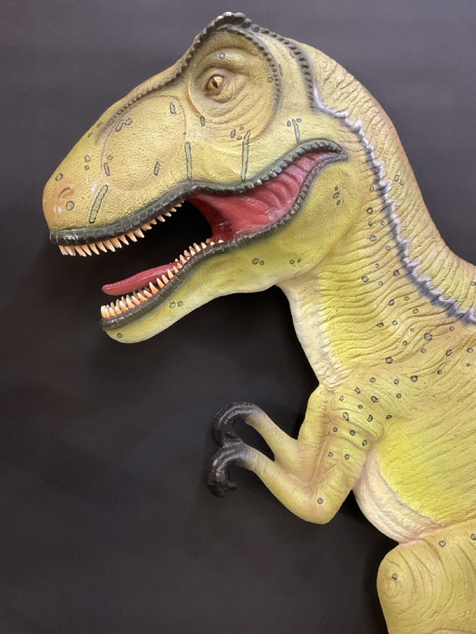 Huge T-Rex Wall Mount Sculpture. Made of fiberglass and resin. Handpainted. Very detailed contemporary sculpture. Some wear noted. Please see photograph preview.
