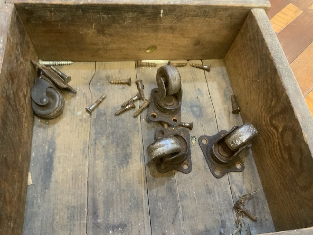 There are paint splatters on the left side as noted in the picture also there are small surface scratches. The wheels are in the drawer one is bent at the plate.