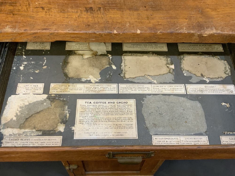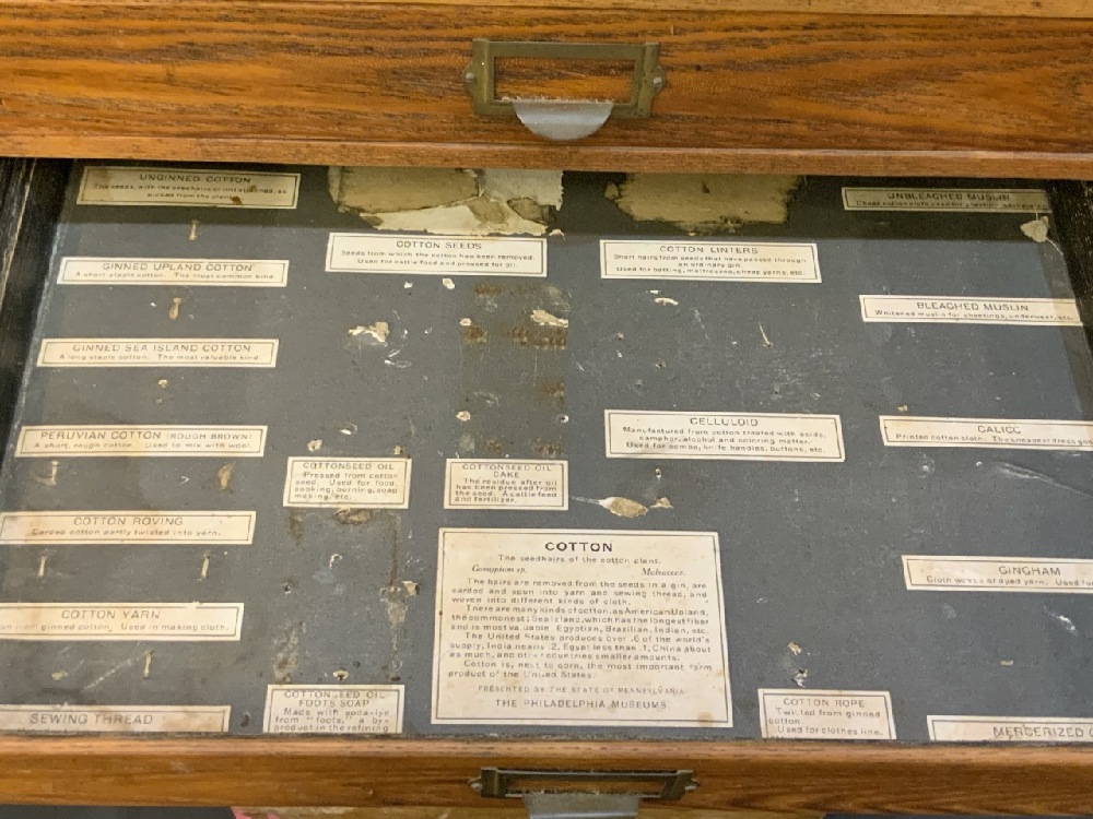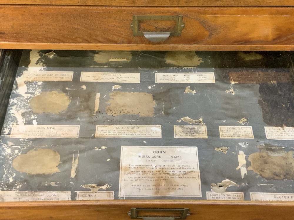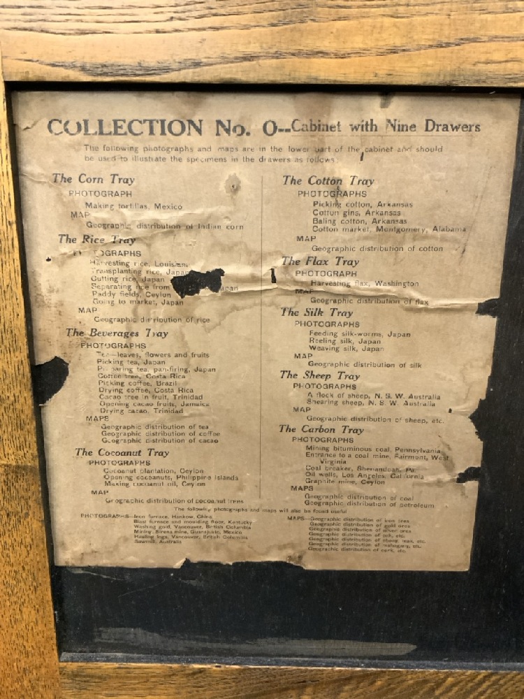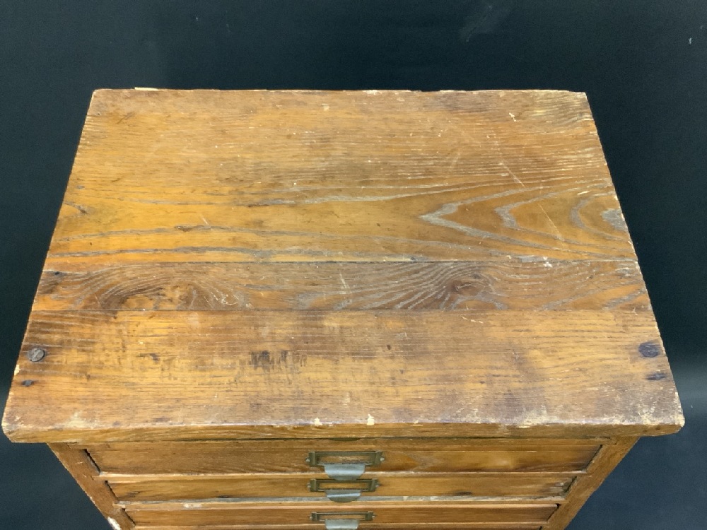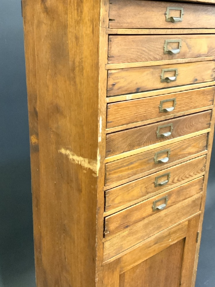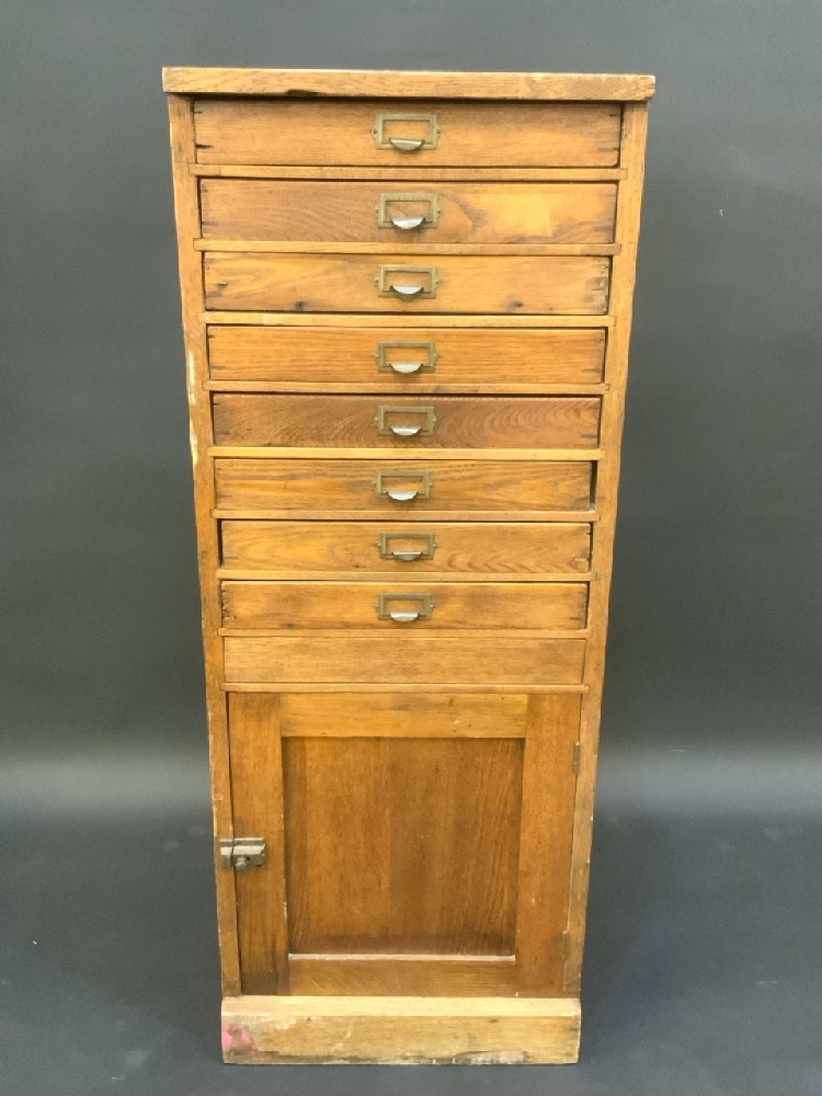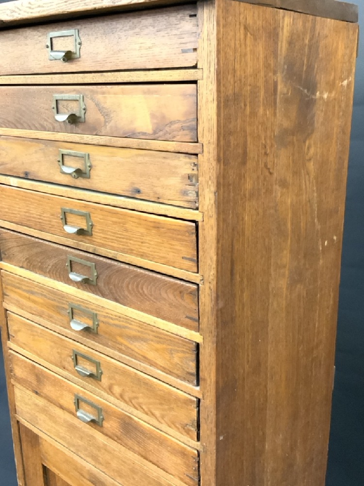 Antique Oak Seed Cabinet. Old labels still present inside drawers with seed names.