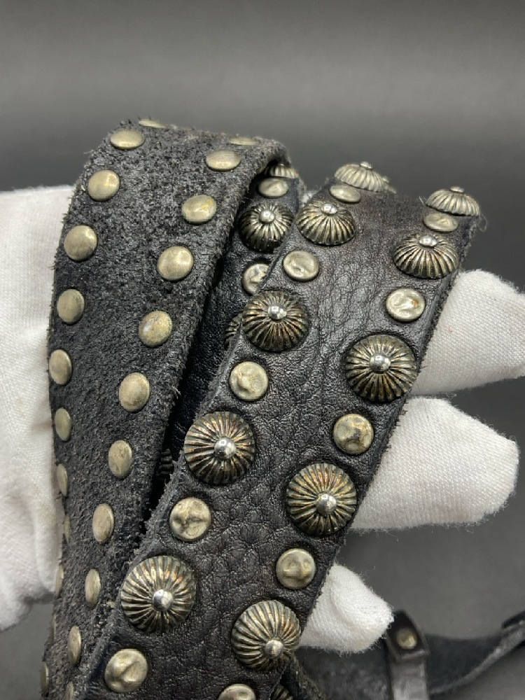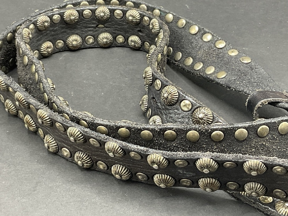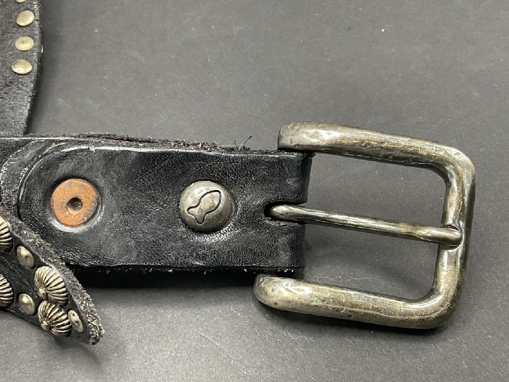Custom 47" leather belt with sterling silver buckle and studs. Good condition.
