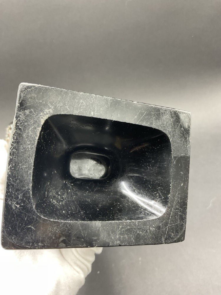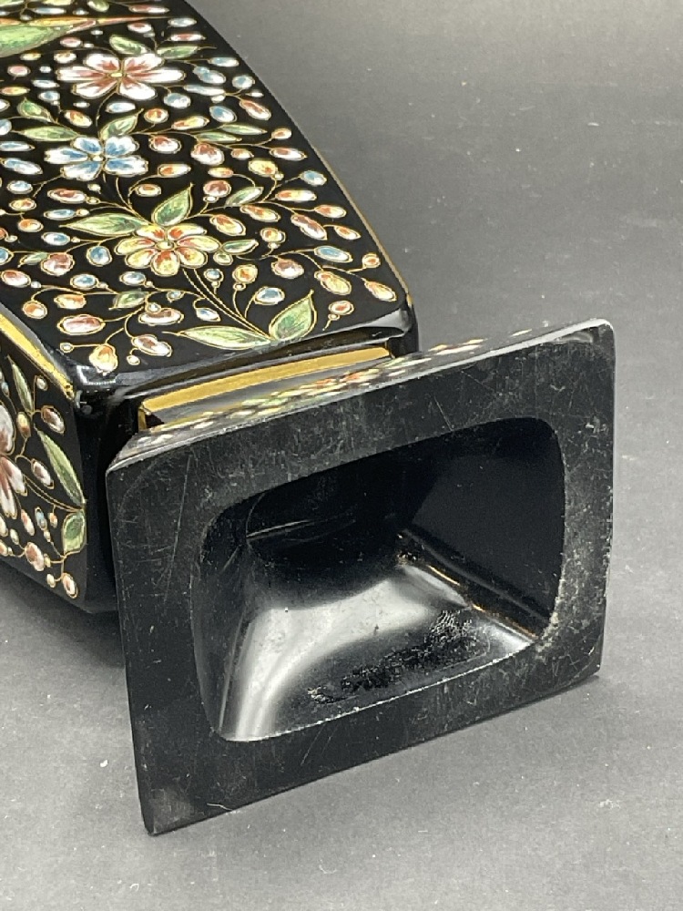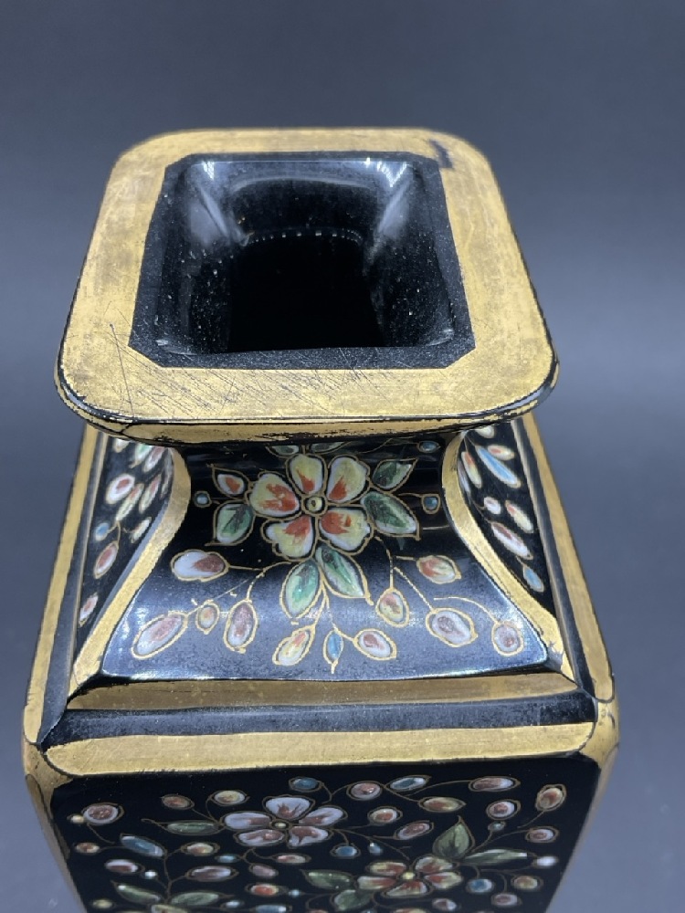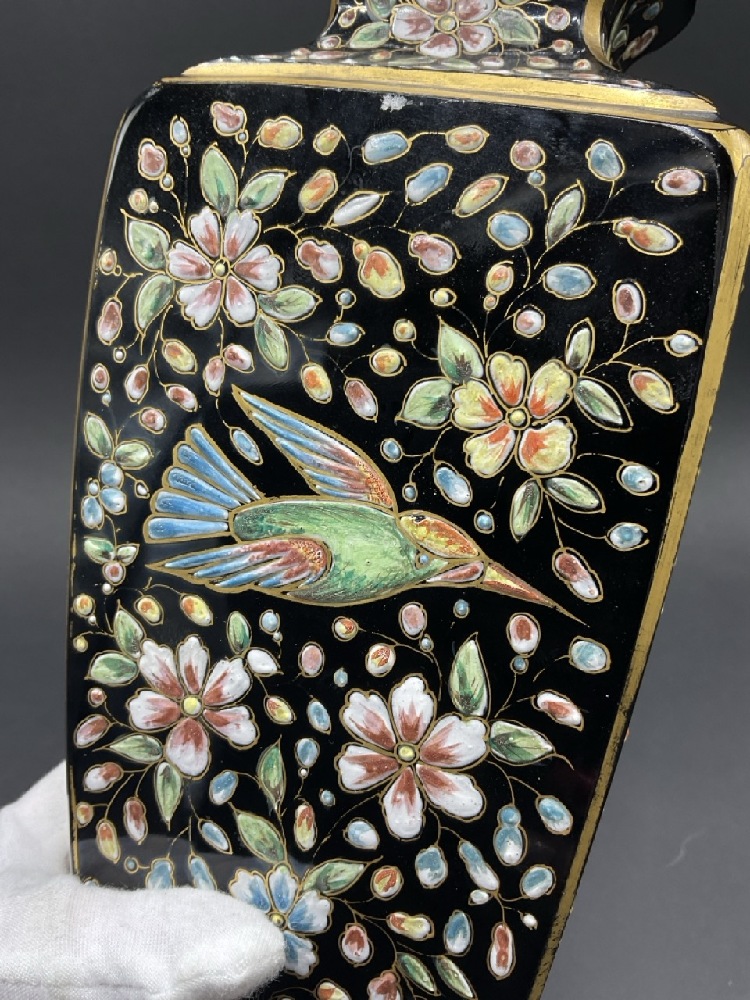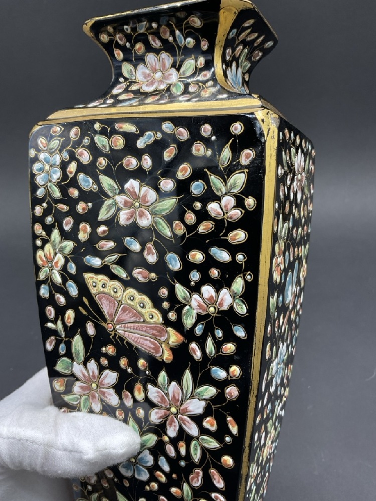 Antique Black Crystal Moser Enameled Glass Vase. Heavily enameled on all four sides with flowers and gold trim. Large panels have bird and butterfly. Gold trim shows slight wear. No chips, cracks or restoration.