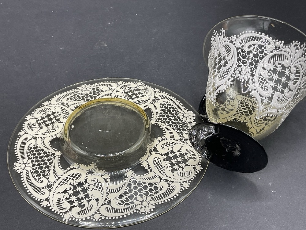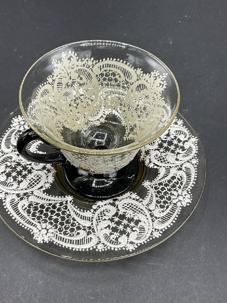 Antique Lace Painted Venetian Glass Cup and Saucer.