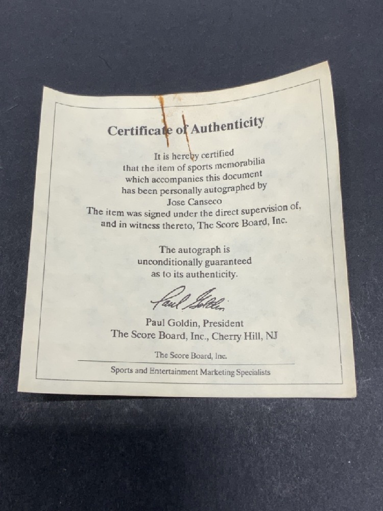 Authentic Jose Canseco Autographed Baseball W/ Certificate Of Authenticity - Paul Goldin, The Score Board, Inc
