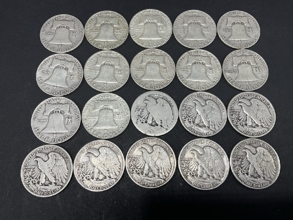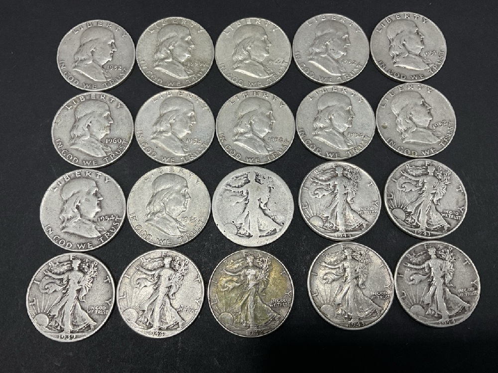 Lot of 20 90% Silver U.S. Half Dollars.