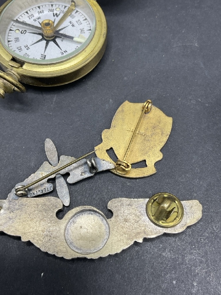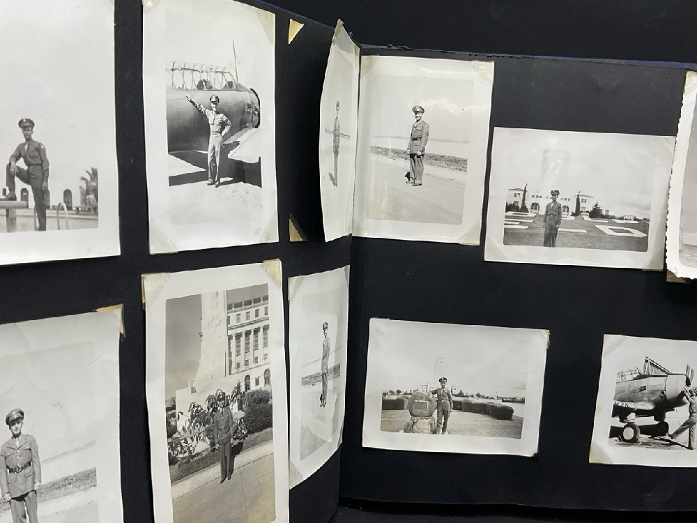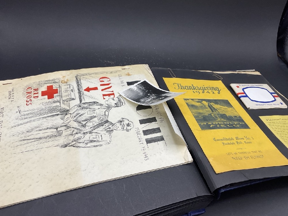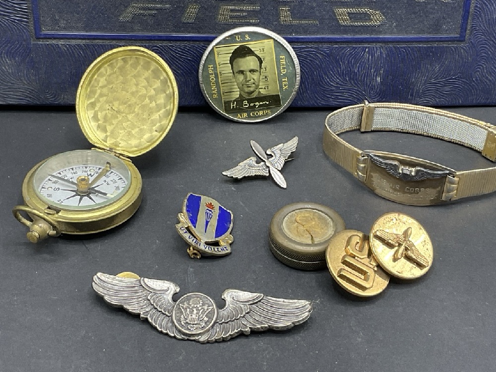 WWII Randolph Field Airforce Base Photo Album and Soldier's Items Includes sterling silver pins, wings, ID badge from base, ID bracelet (gold filled) and compasses. One compass glass broken. Please see photograph preview.
