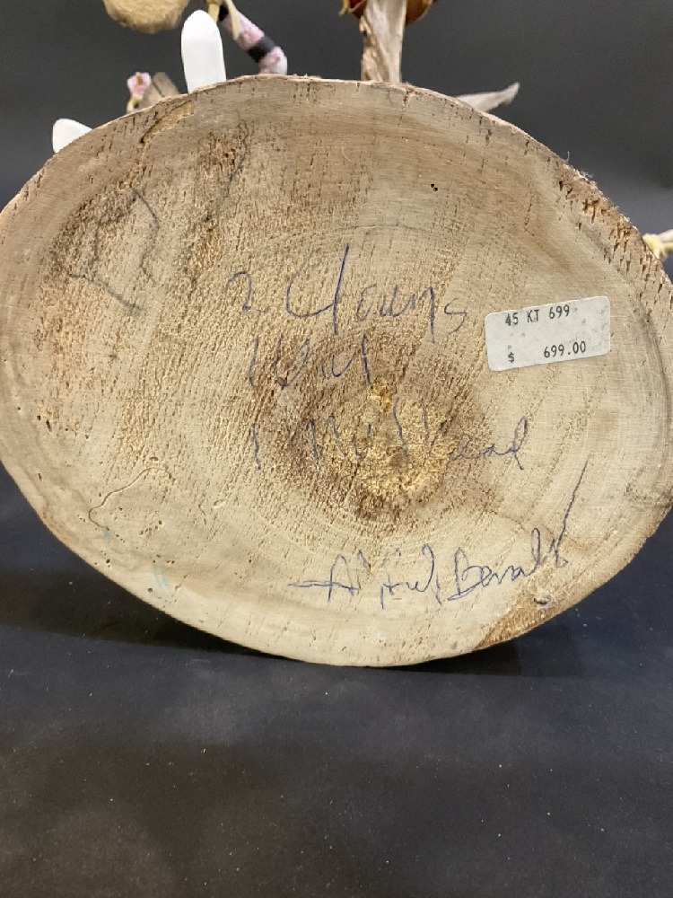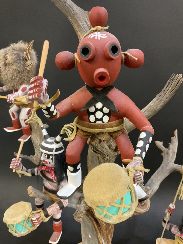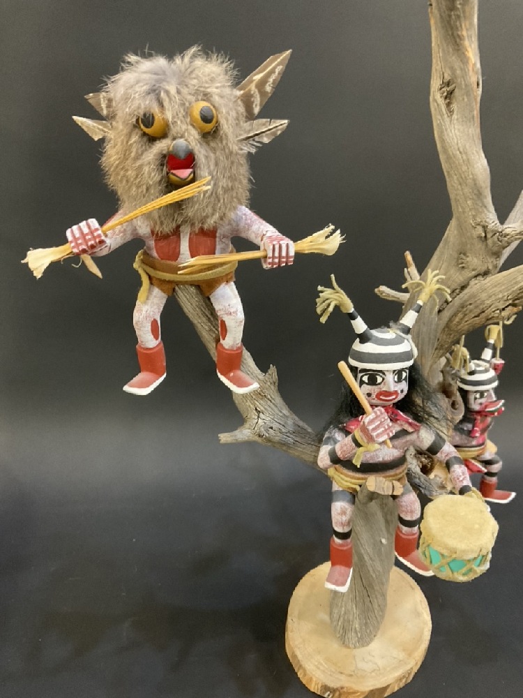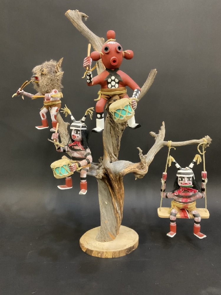 Signed Robert Benally Native American Hand Carved Kachina Dolls in Tree - (2) Clowns, Mudhead & Owl .