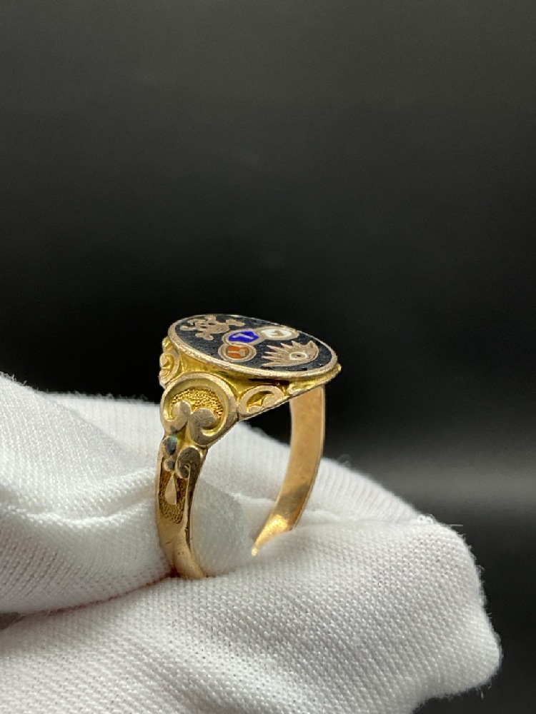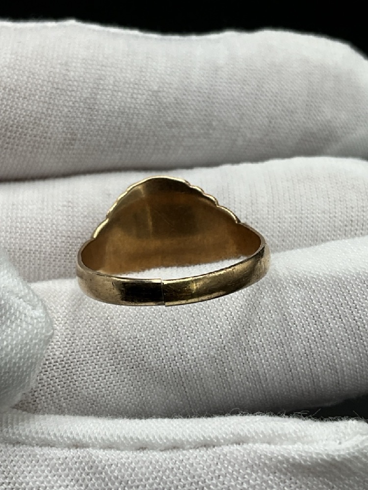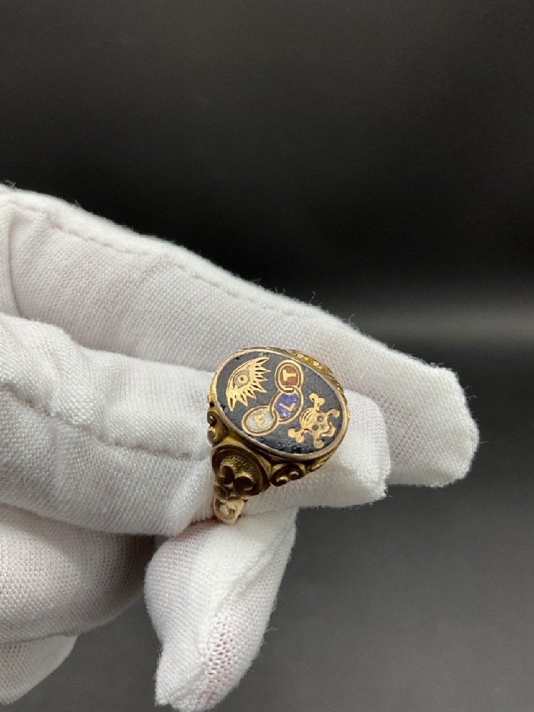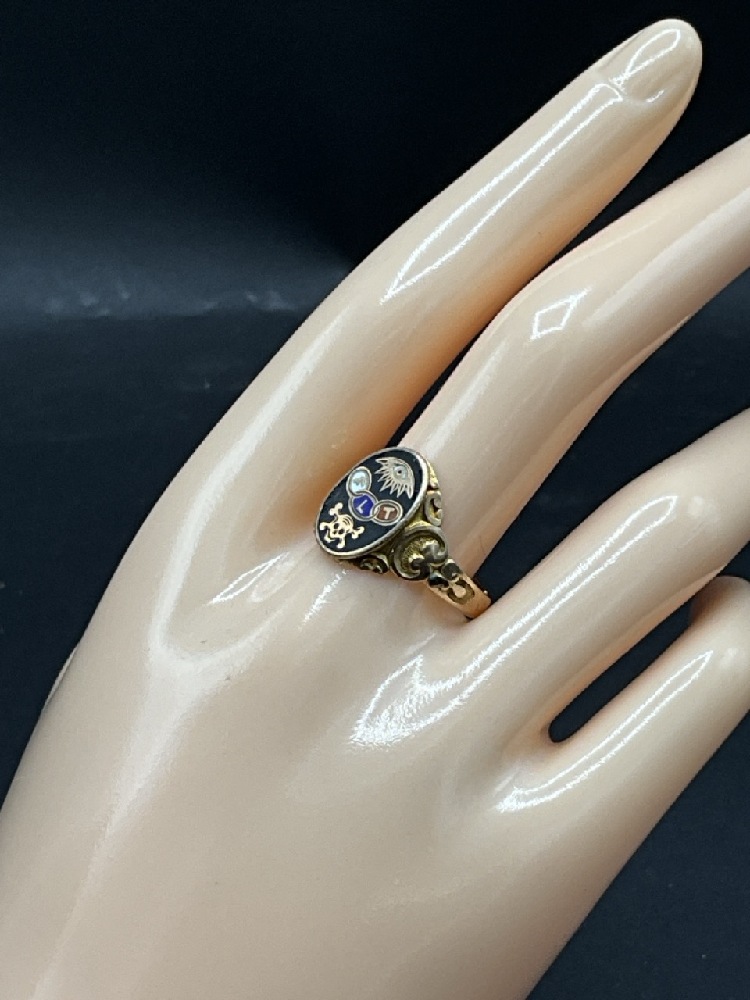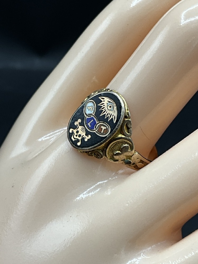 14K Yellow Gold International Order of Oddfellows Skull with Crossbones Signet Ring.