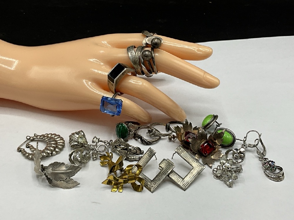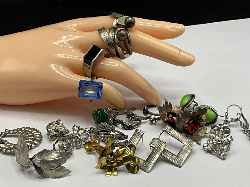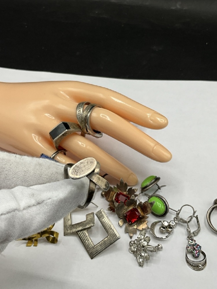 Estate compiled vintage sterling silver jewelry. Several rings and earrings.