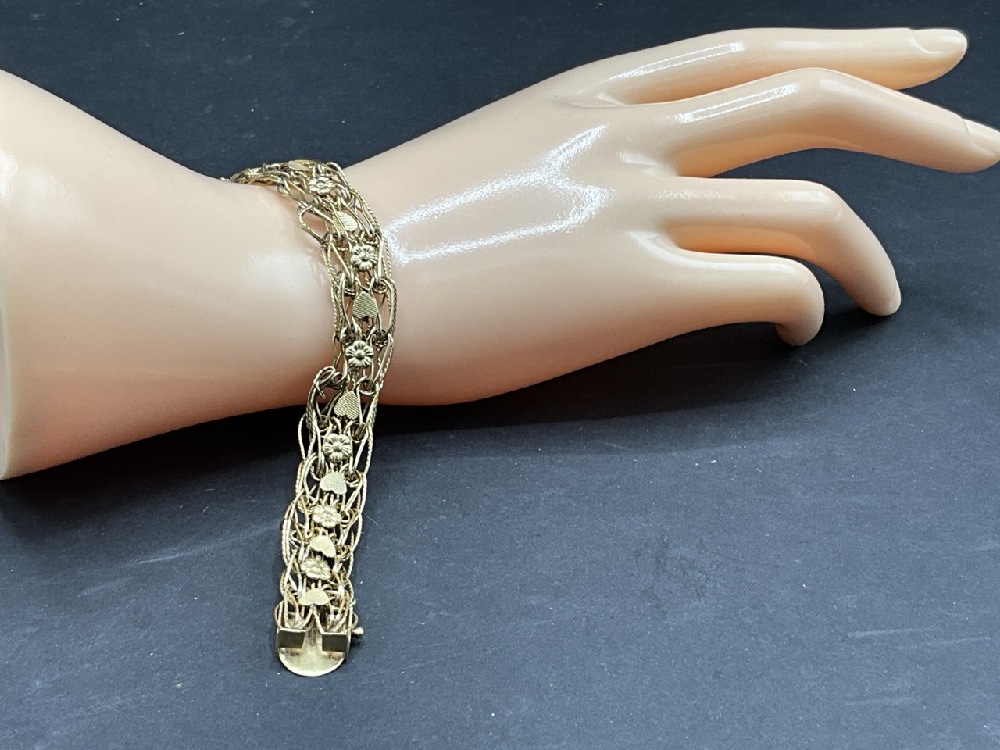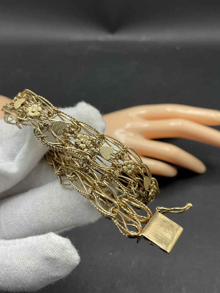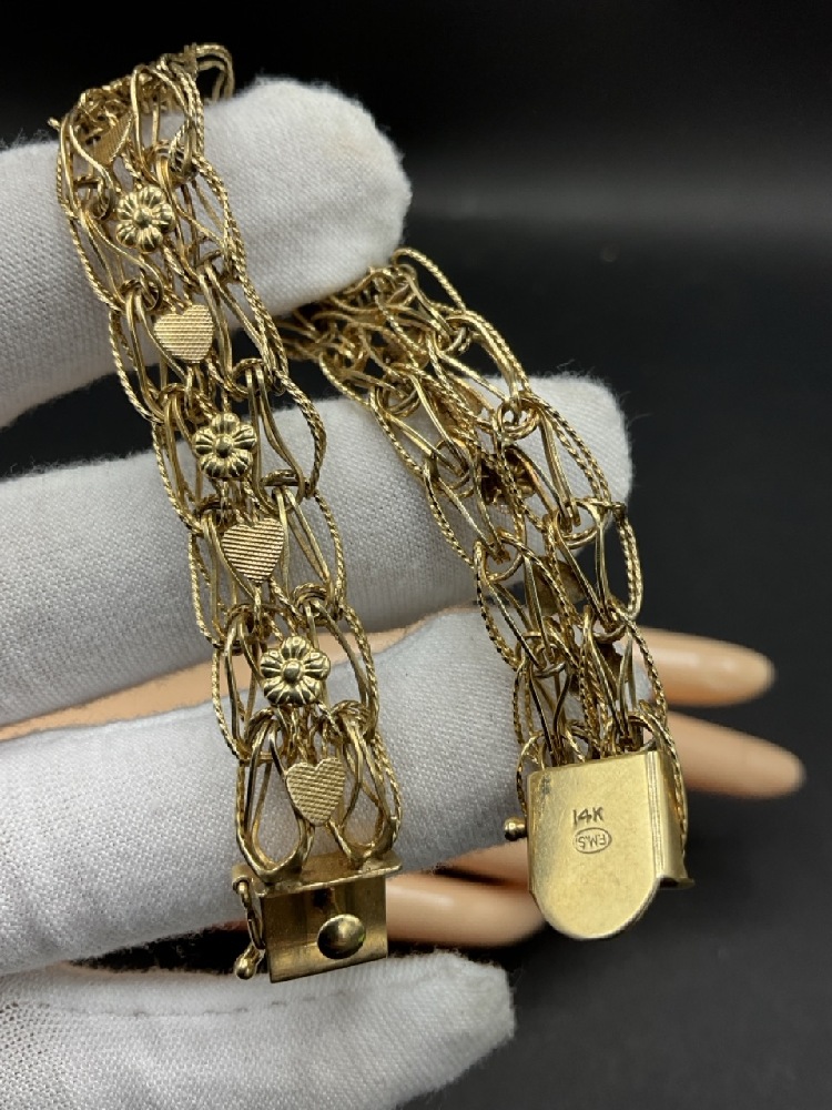 14K Yellow Gold Hearts and Flowers Charm Bracelet.