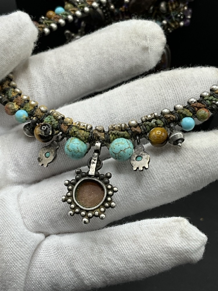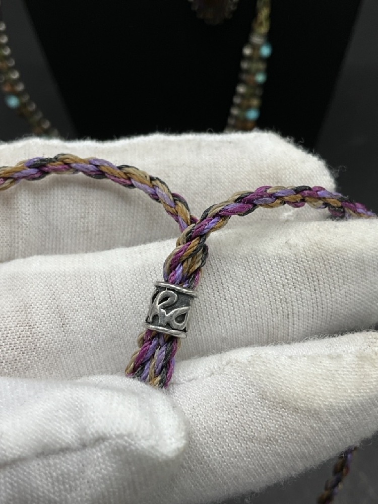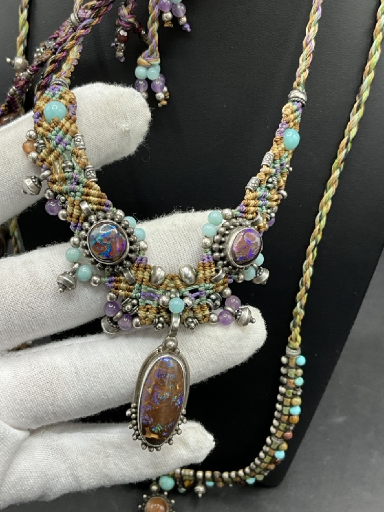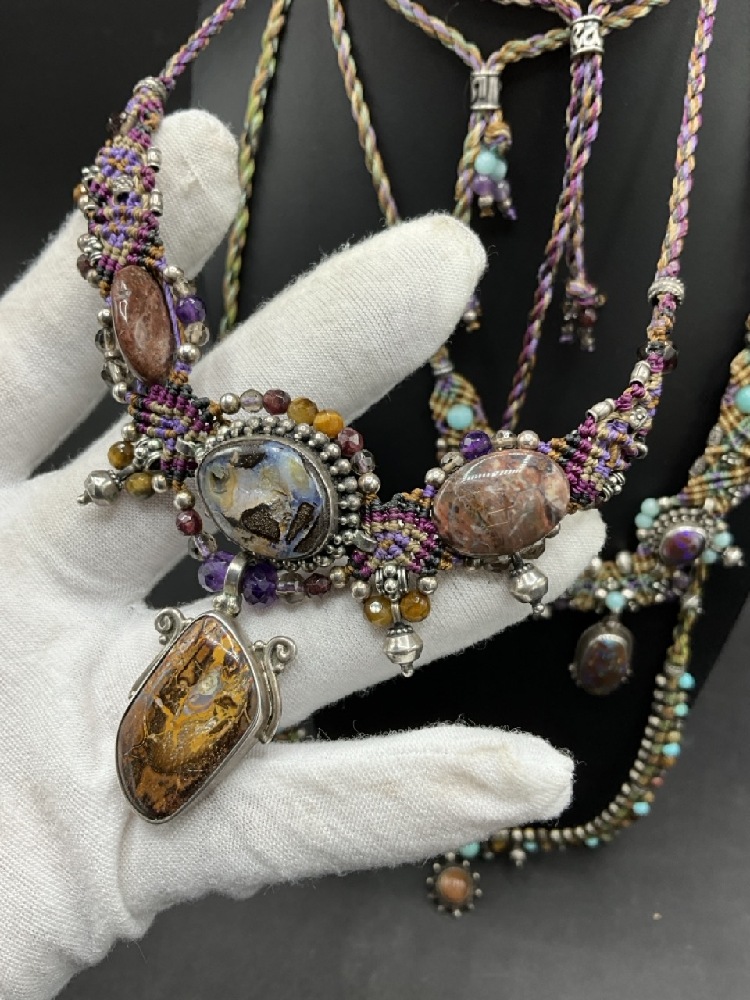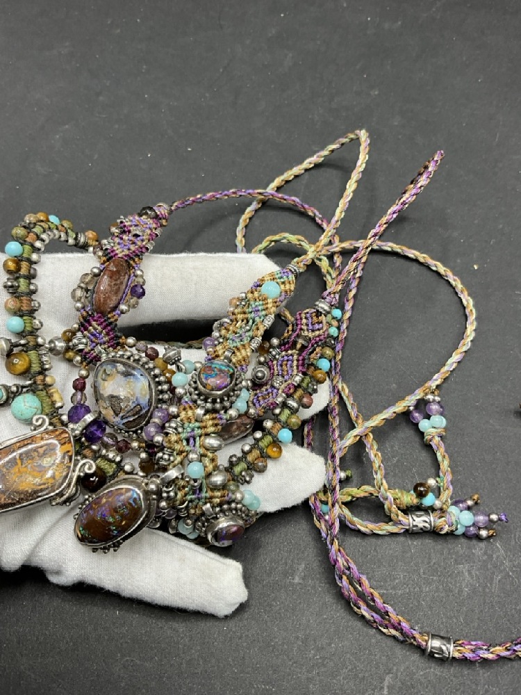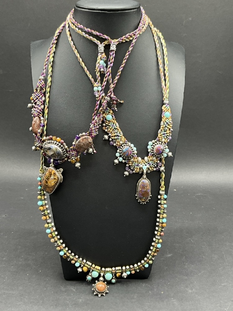 Three (3) Isha Elafi Hand Made Necklaces with Macrame and Gemstones mounted in Sterling Silver. Adjustable lengths.