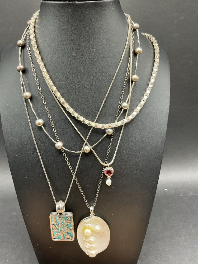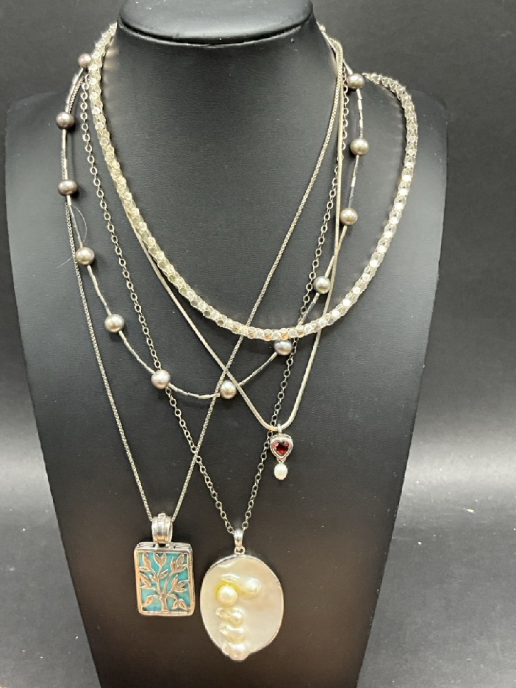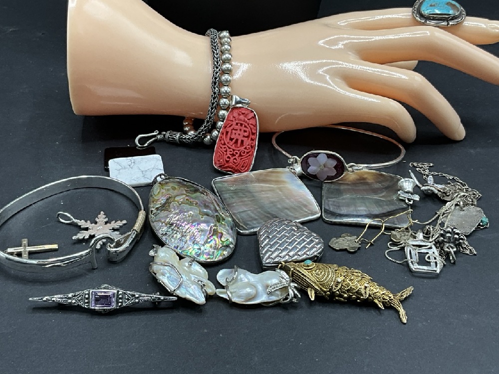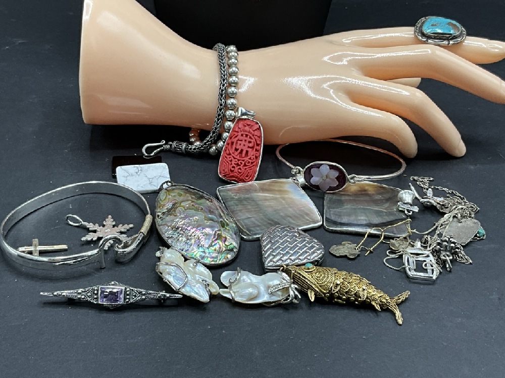 Compiled Sterling Silver Jewelry Group. Including turquoise ring, , bracelets, pendants, pins etc. As seen in photograph preview.