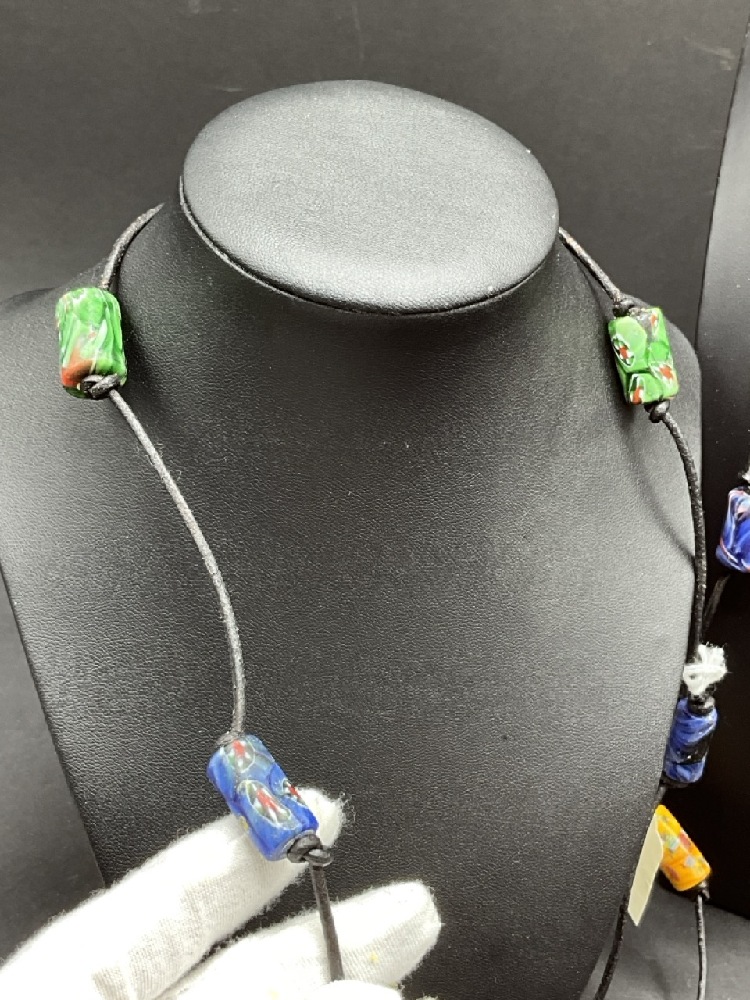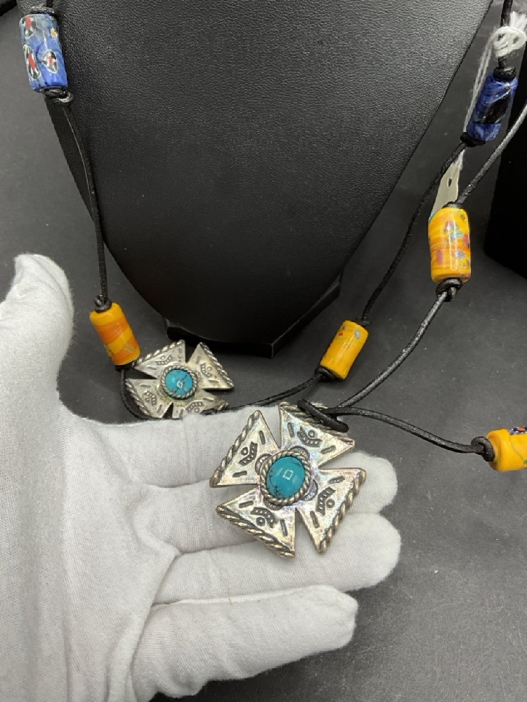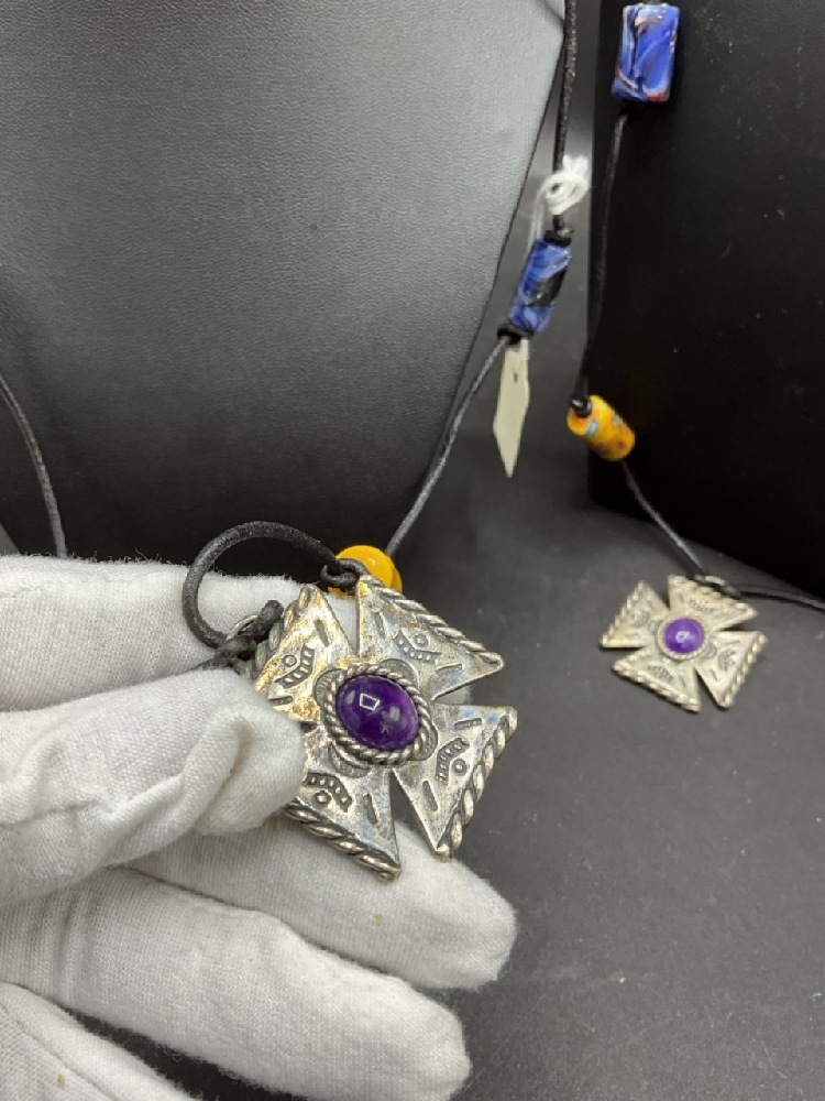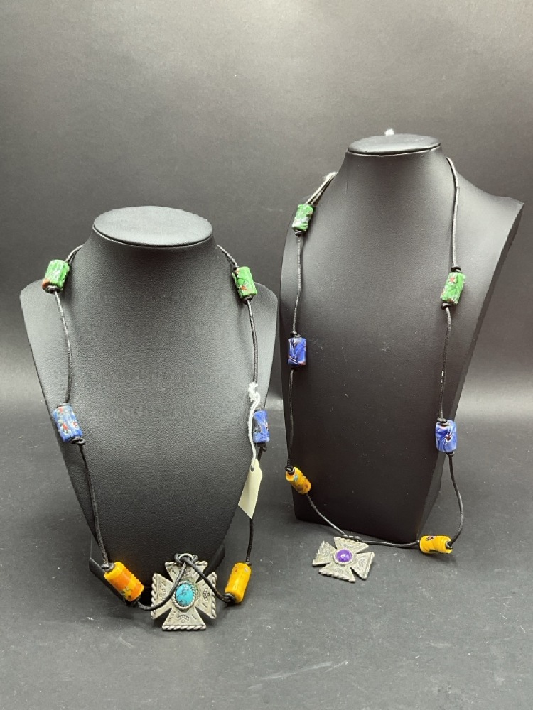 Two (2) Amethyst and Turquoise Cross with Millefiori Trade Beads on Cord. Adjustable Lengths.