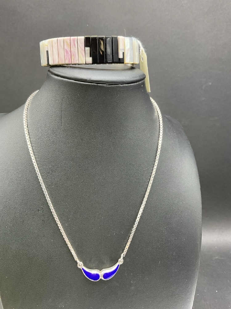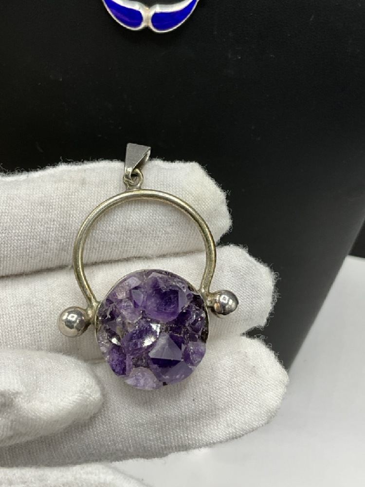 Compiled jewelry group. Amethyst pendant, turquoise and sterling silver cross by Carlisle, lapis and sterling necklace and bracelet with onyx and mother of pearl.