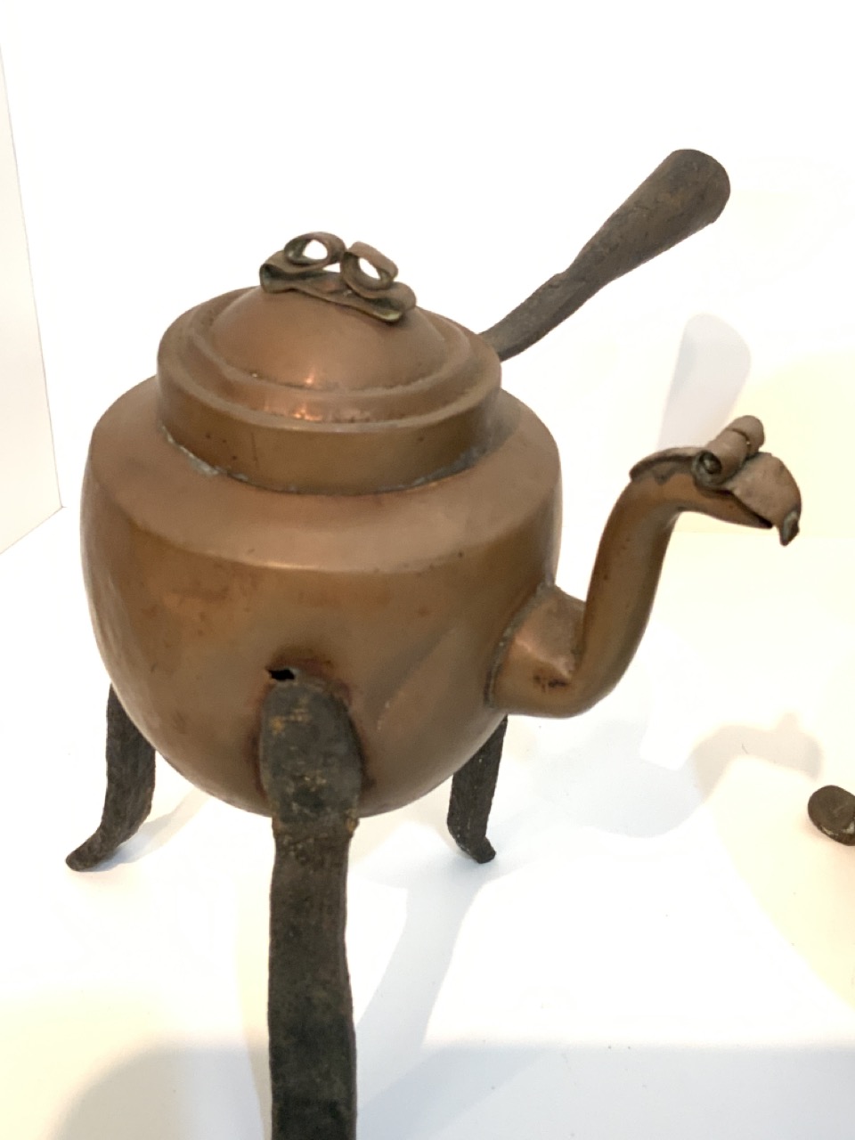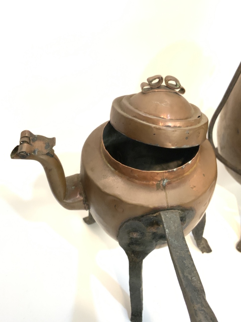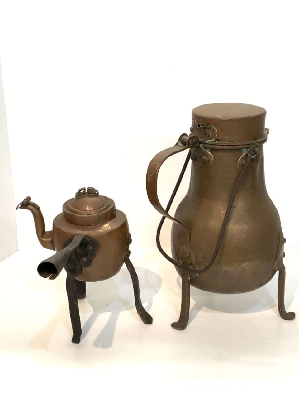 19th century copper pots. One on iron tripod base.