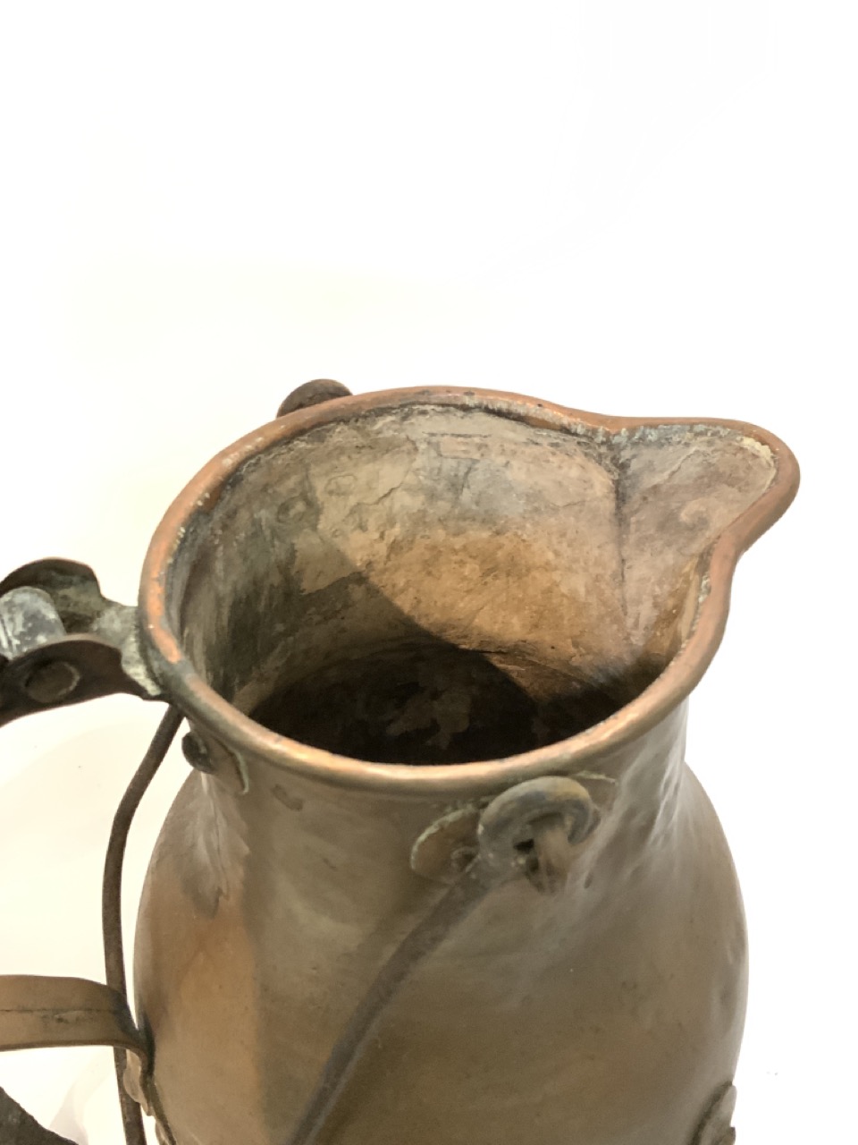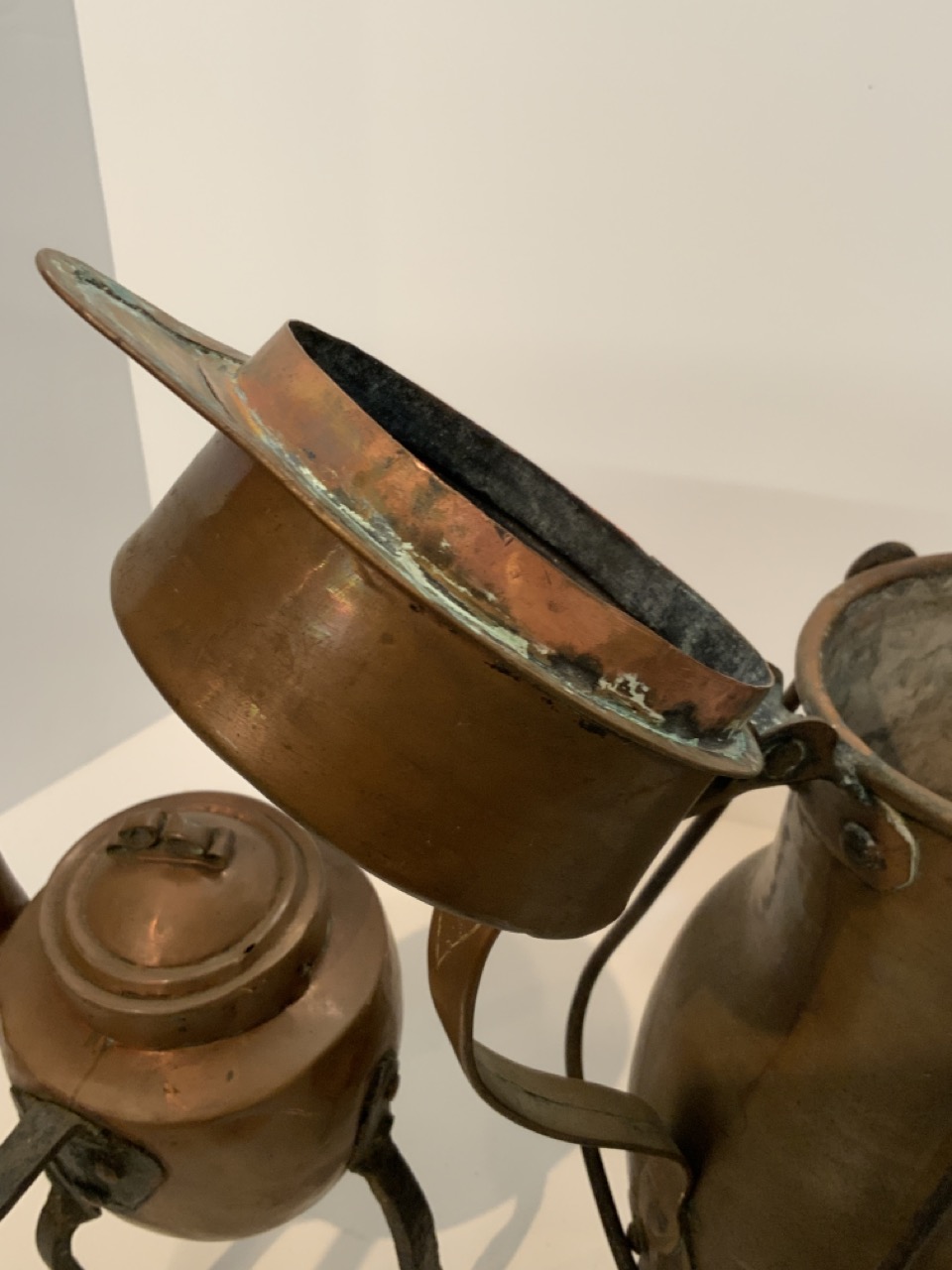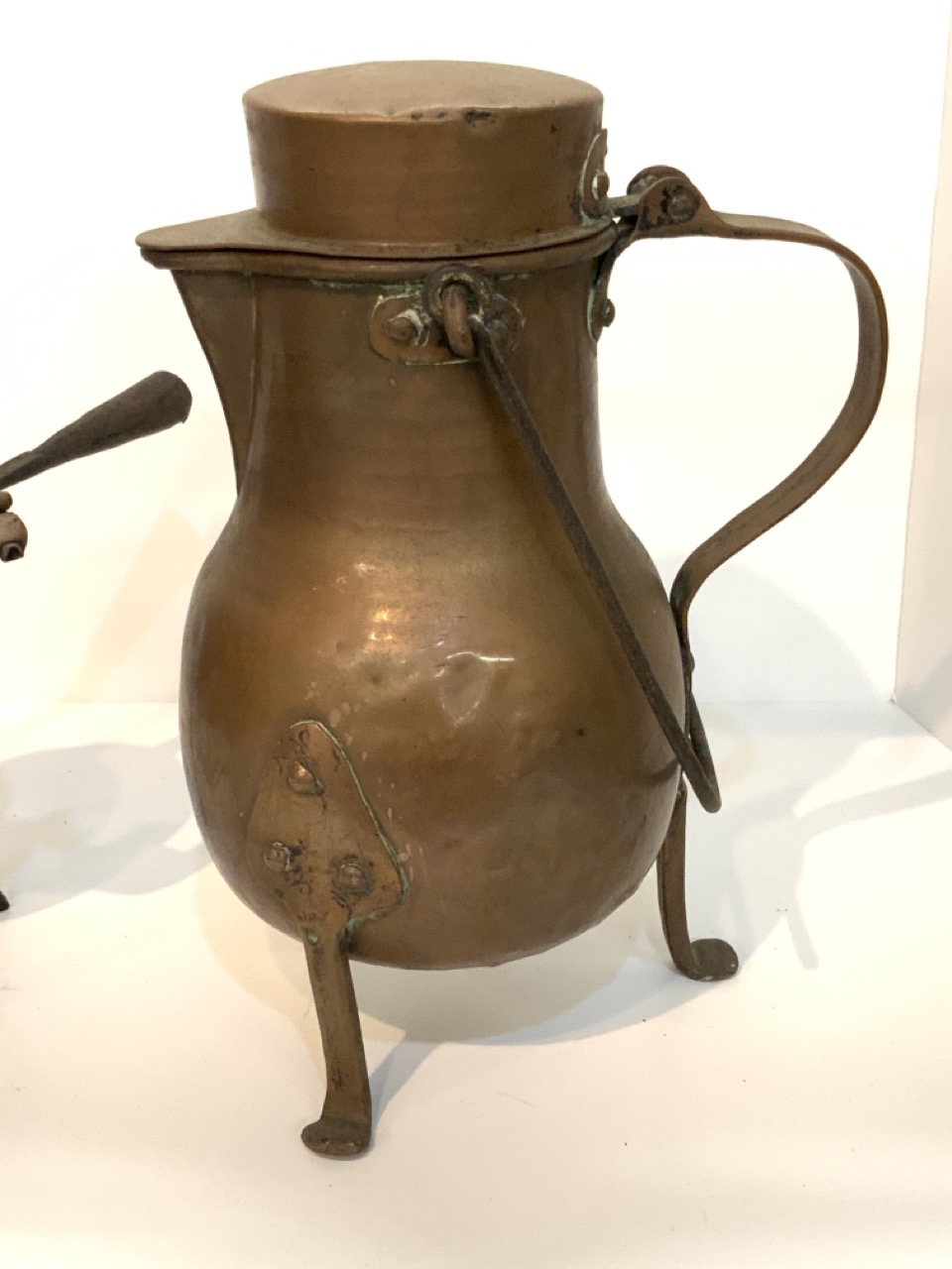 19th century copper pots. One on iron tripod base.