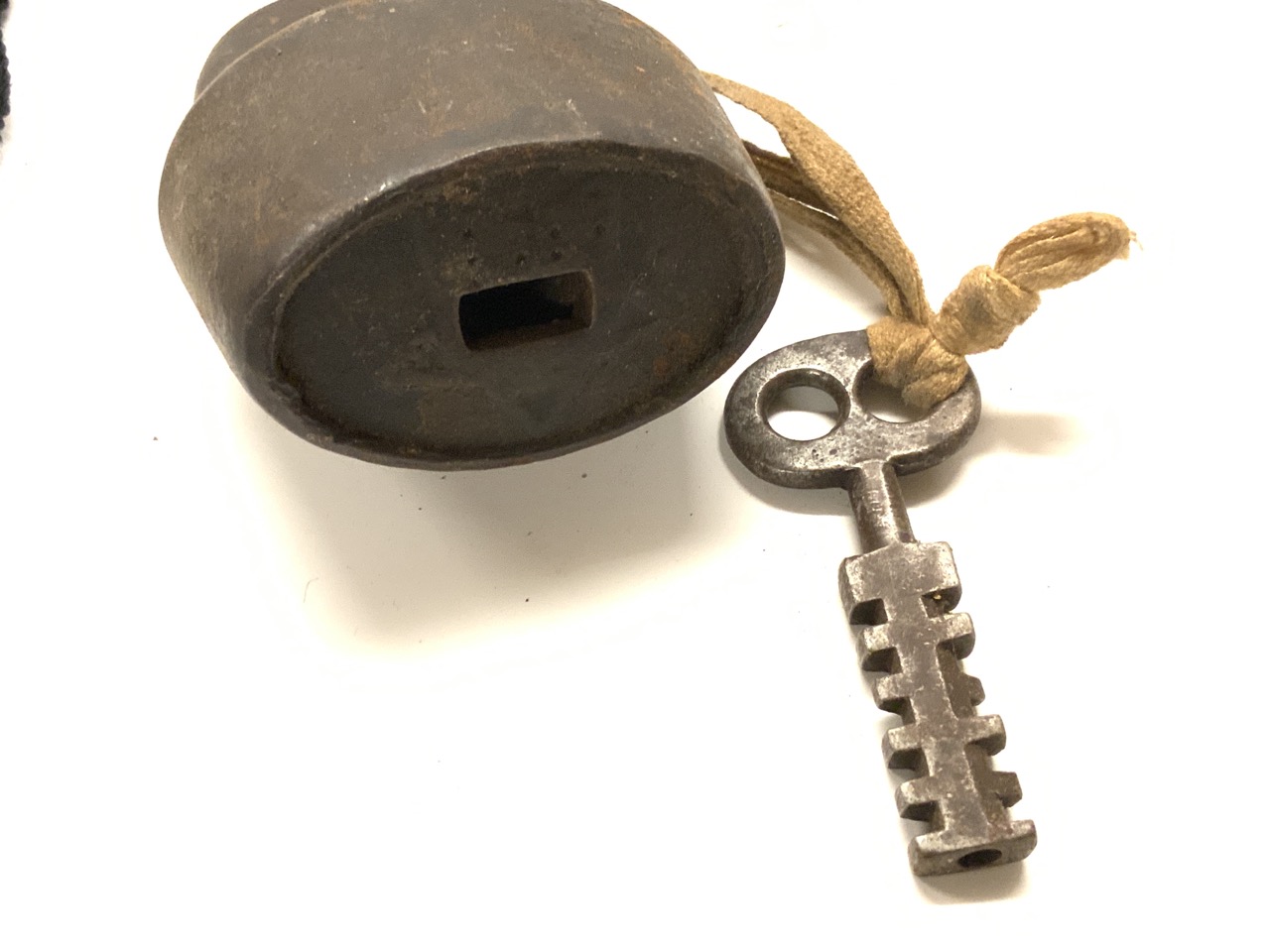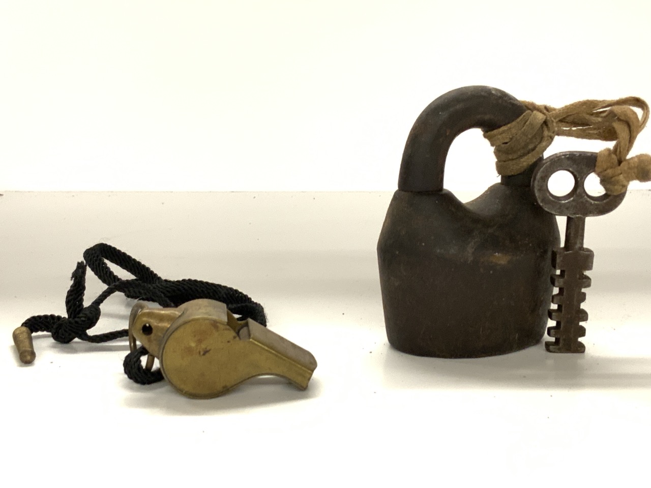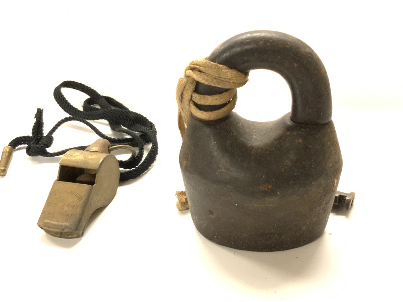 A U.S. Army brass whistle an antique lock with key.