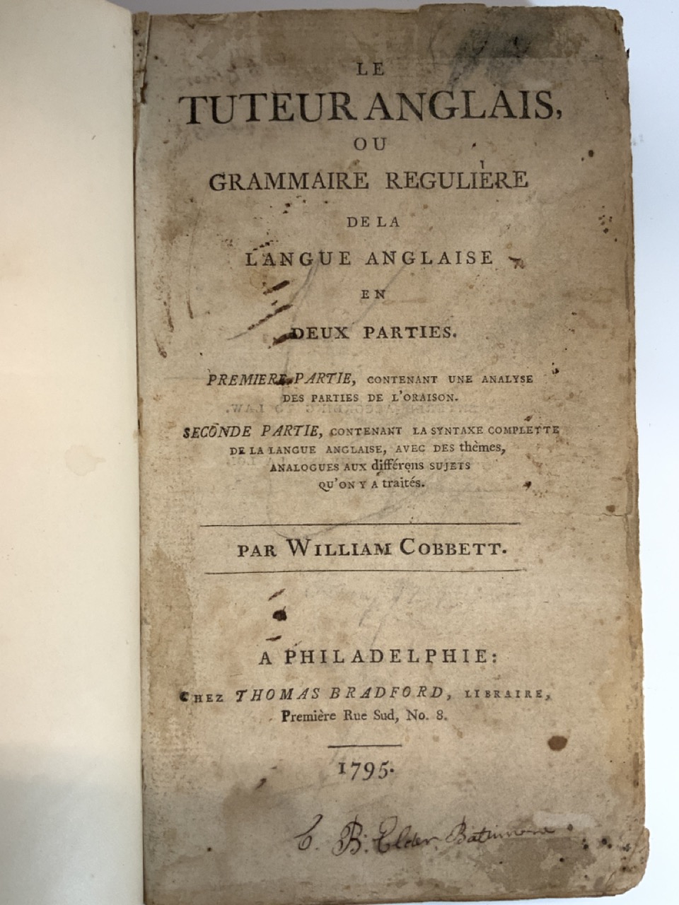 Tuteur Anglais by William Cobbett 1795, Thomas Bradford Philladelphia.1835 Rebound Scarce