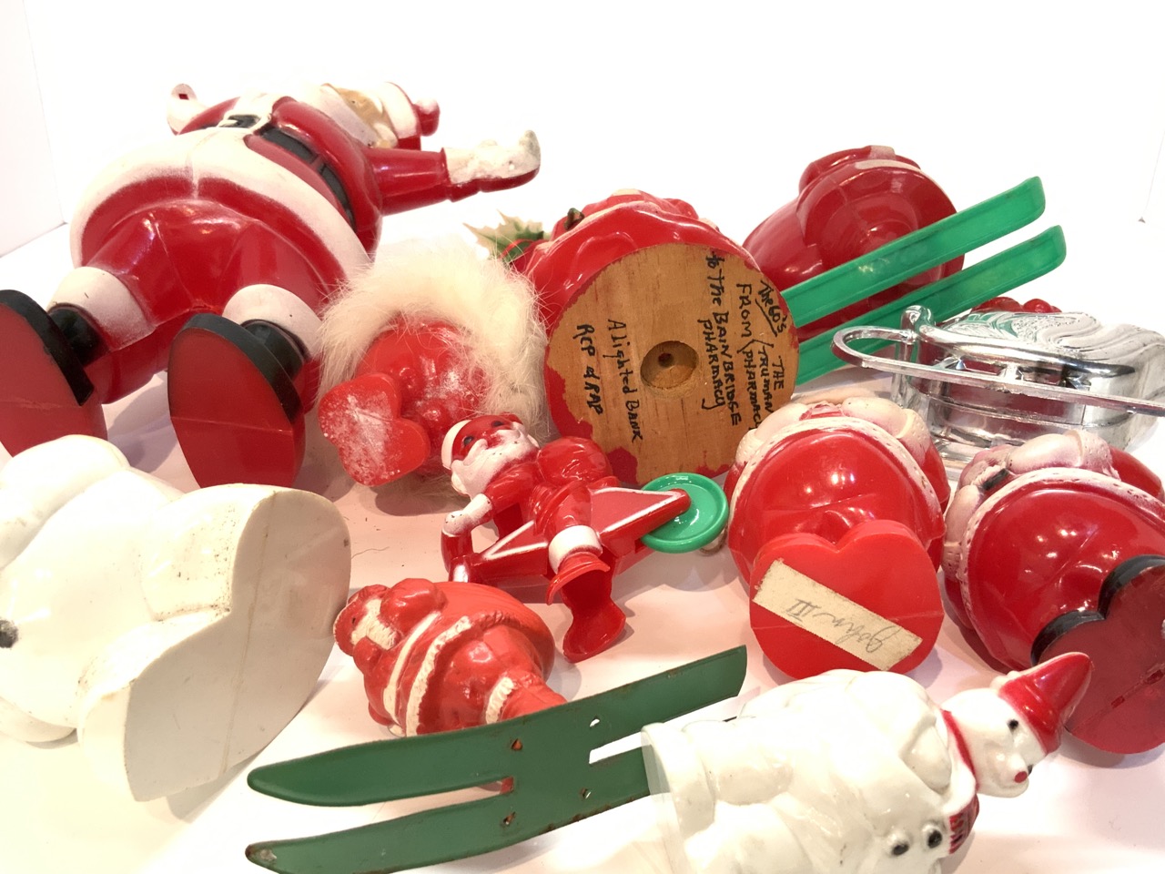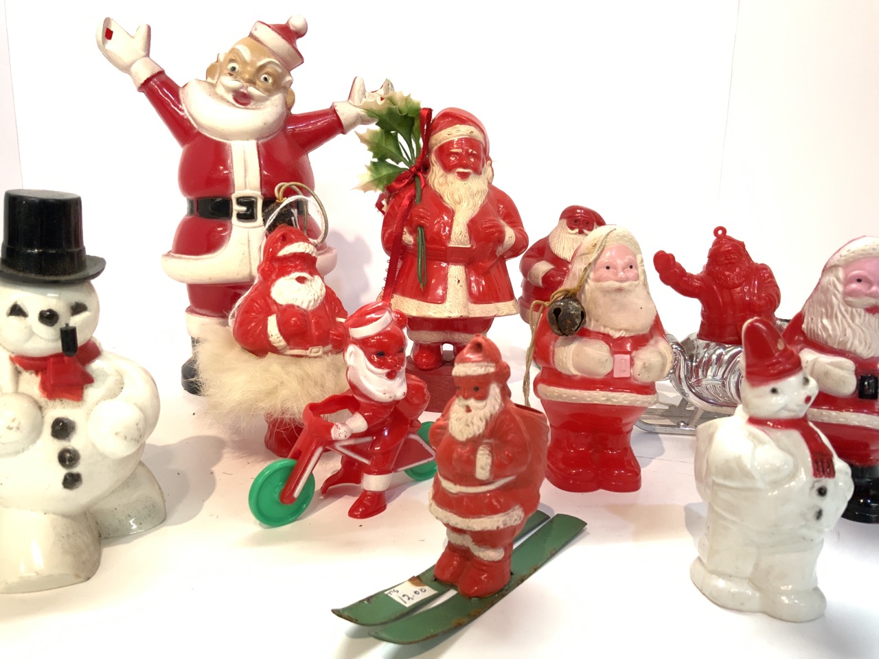 A compiled grouping of vintage plastic candy containers. Santa Claus and Frosty The Snowman.