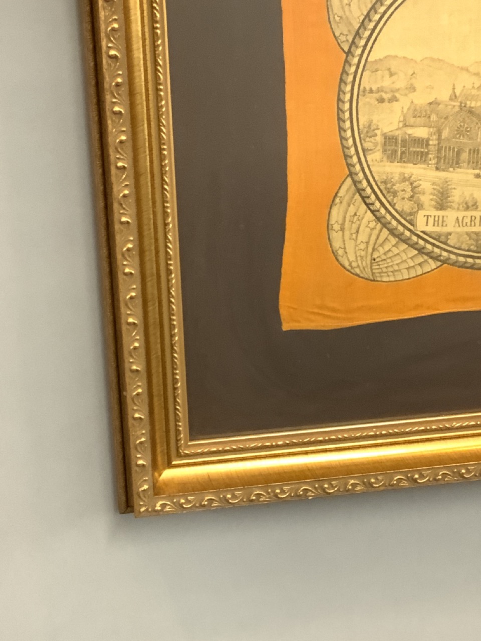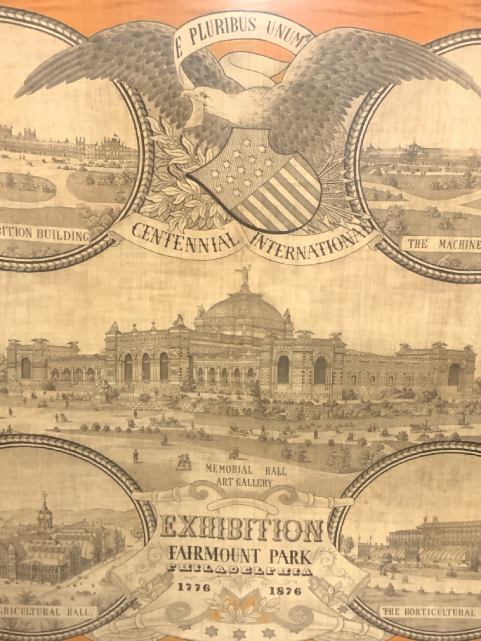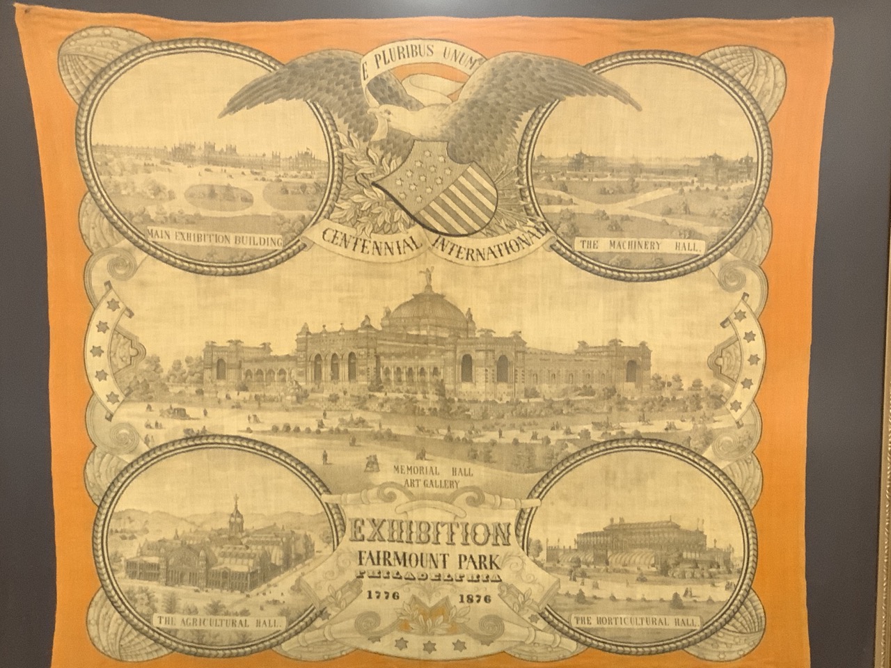 Centennial 1776-1876 International Exhibition at Fairmount Park Philadelphia. A large cotton square housed in giltwood frame with glare proof glass.