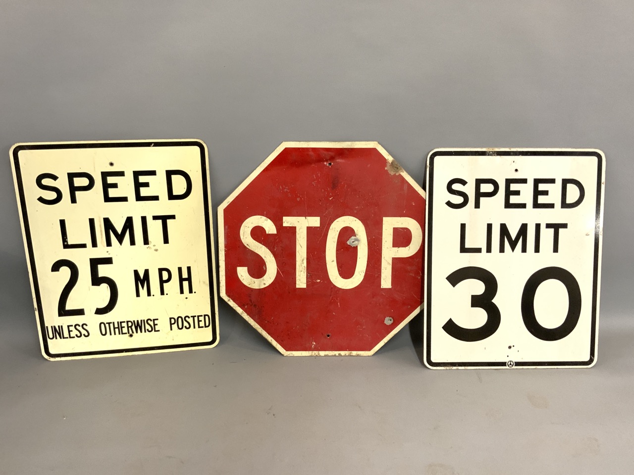 Three (3) Road signs. Speed Limit 25 and 30 along with a Stop sign.