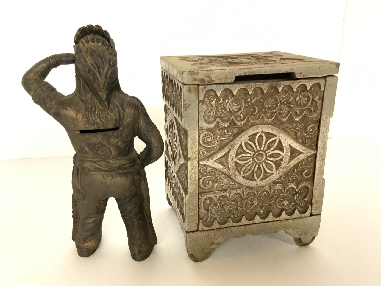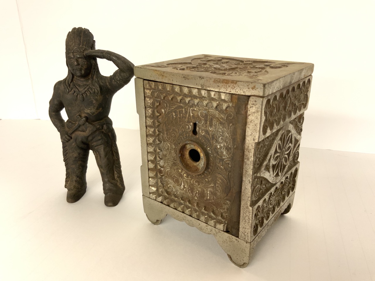 Two (2) antique still banks. The Treasure Safe and Indian Chief.