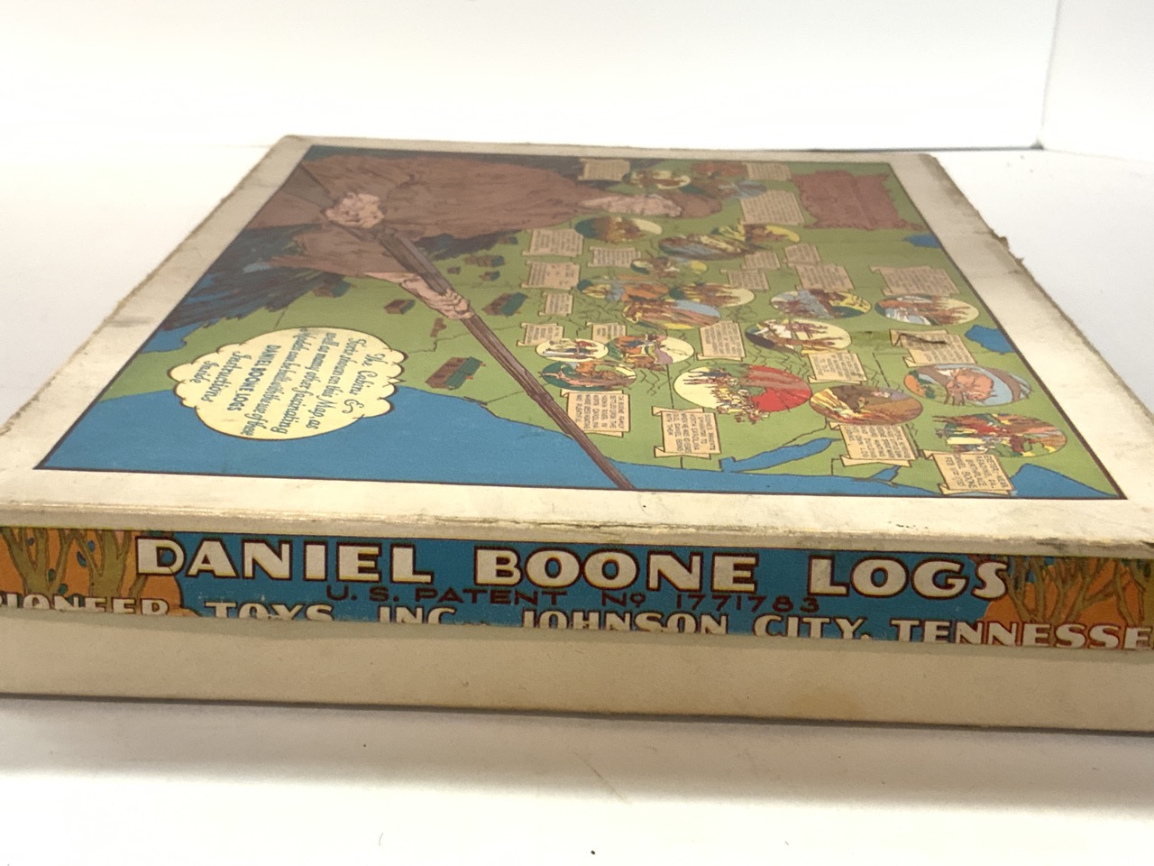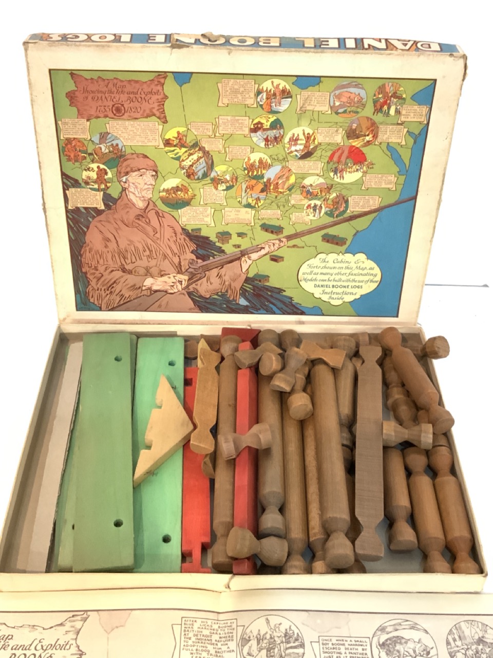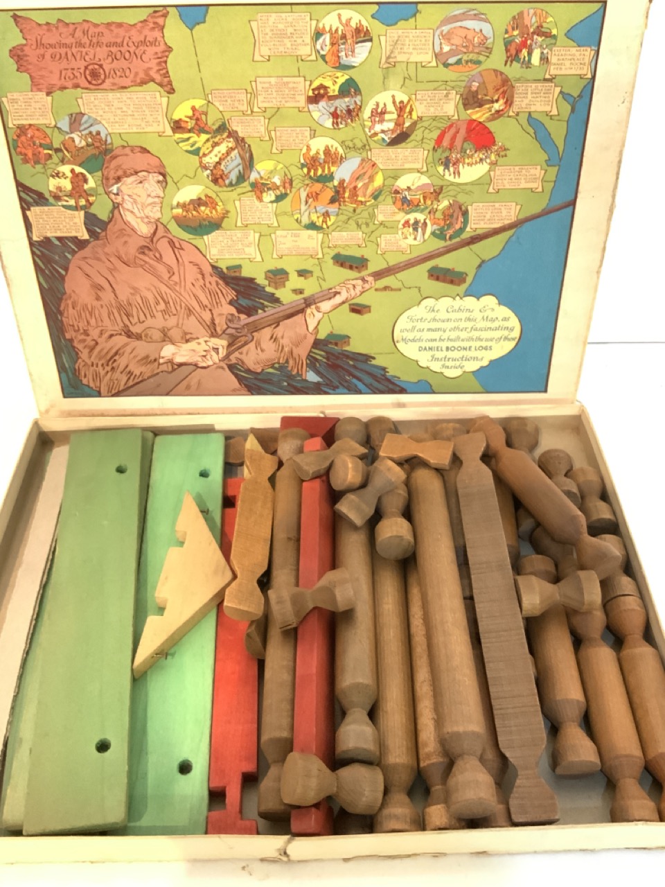 Daniel Boone Logs Playset. 1930's made by Pioneer Toys, Johnson City, Tennessee. With original box and directions.