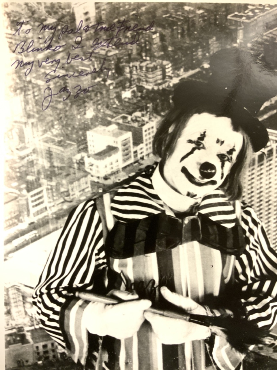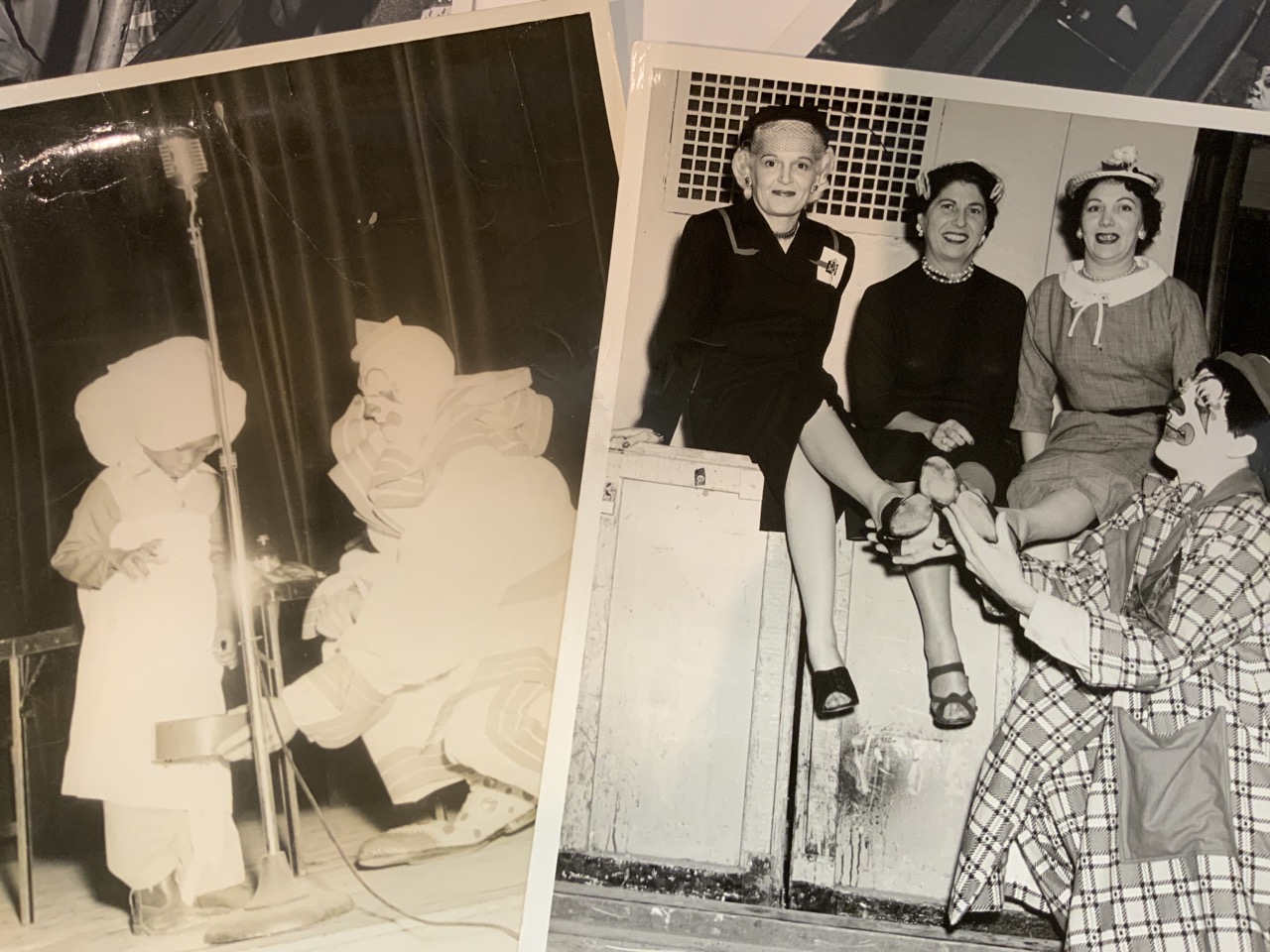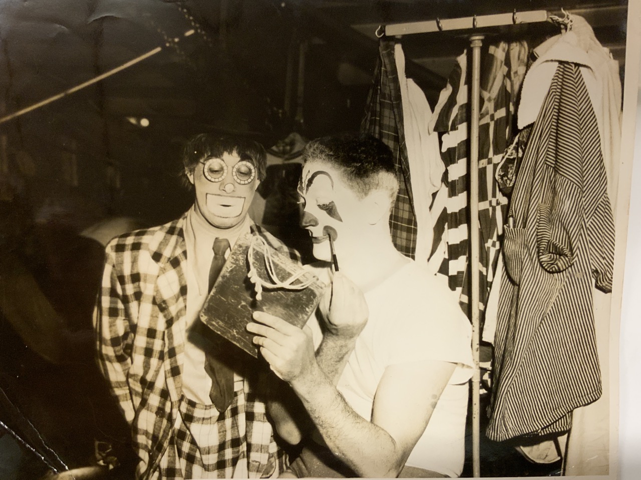 Sixteen (16) black and white original photographs of circus performing clowns 1950's and autographs including Jazzo.