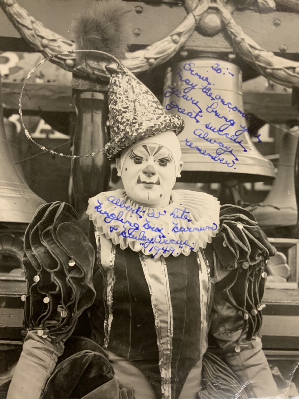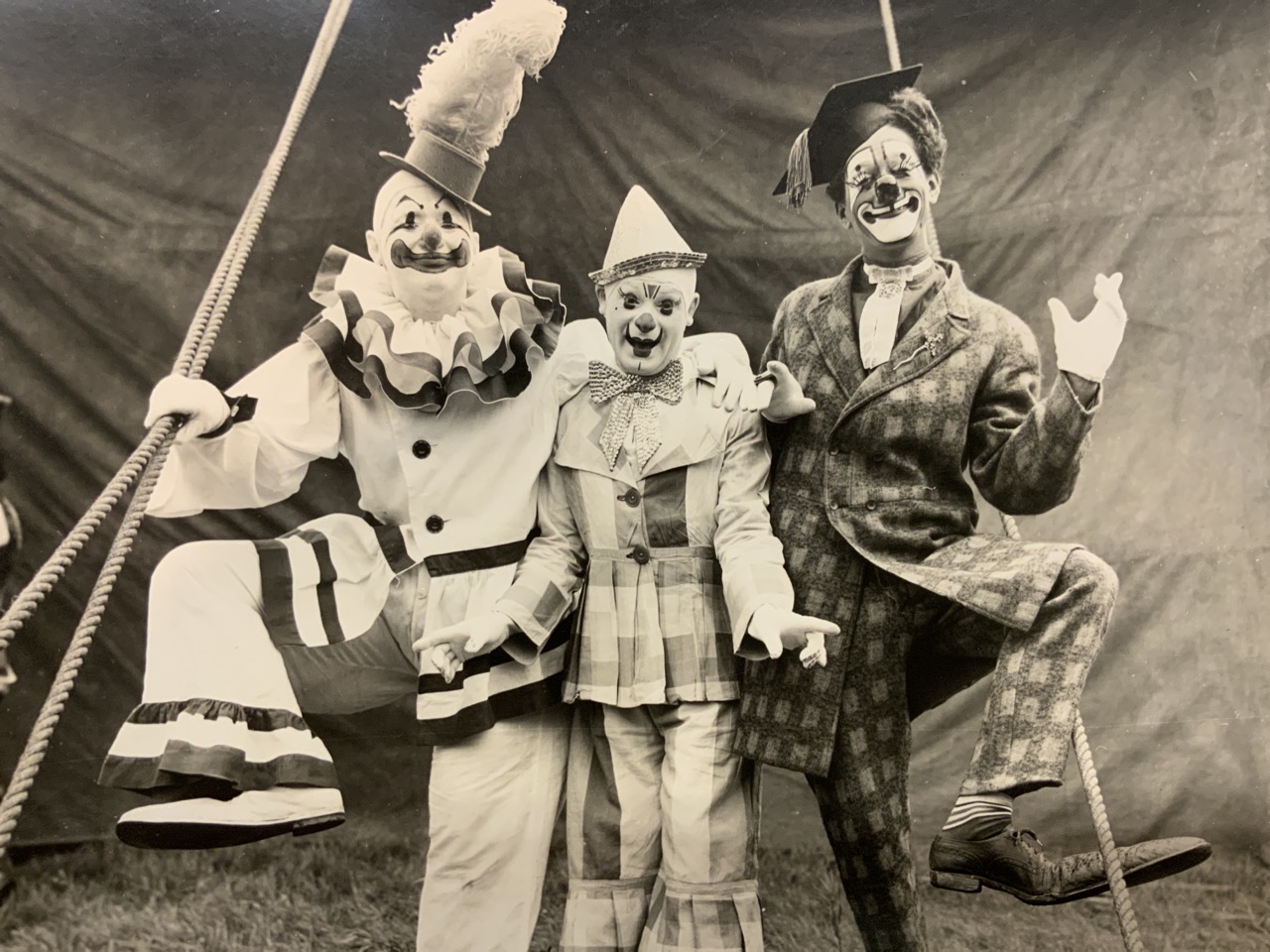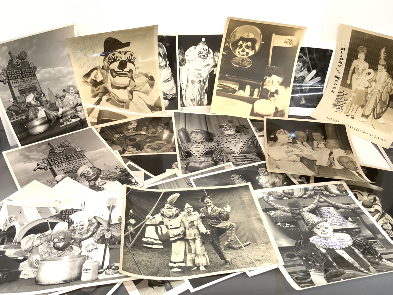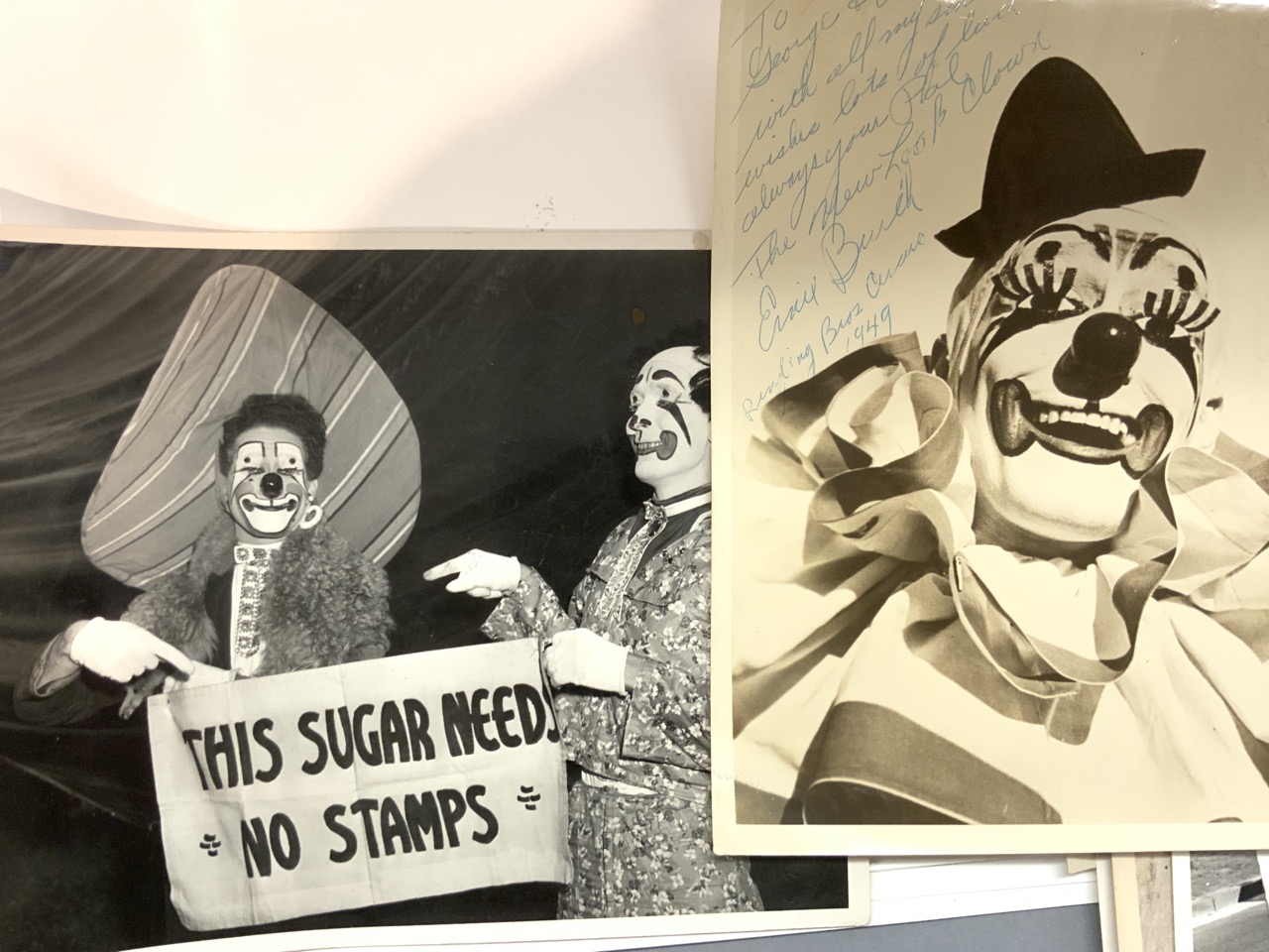 Large lot of thirty (30) black and white circus clown photograph images. Autographs including Ernie Burch, Ringling Bros., Albert White and Blinko etc.