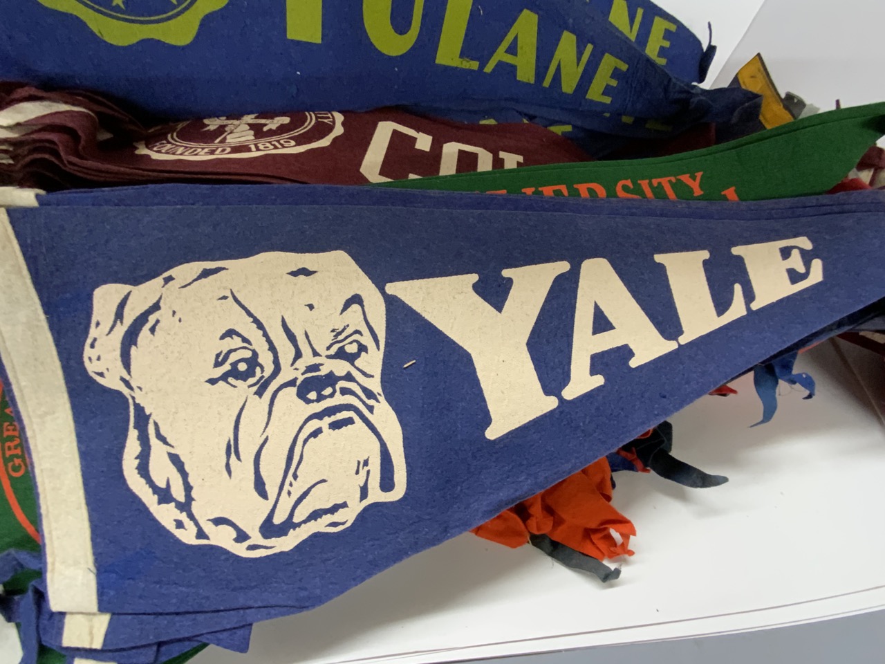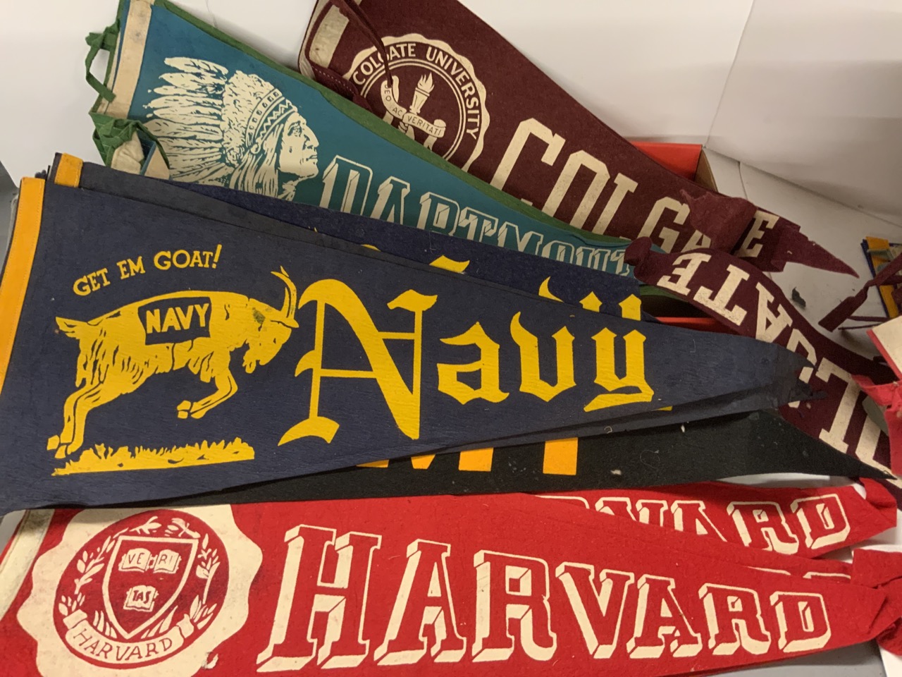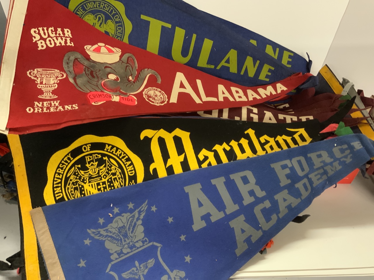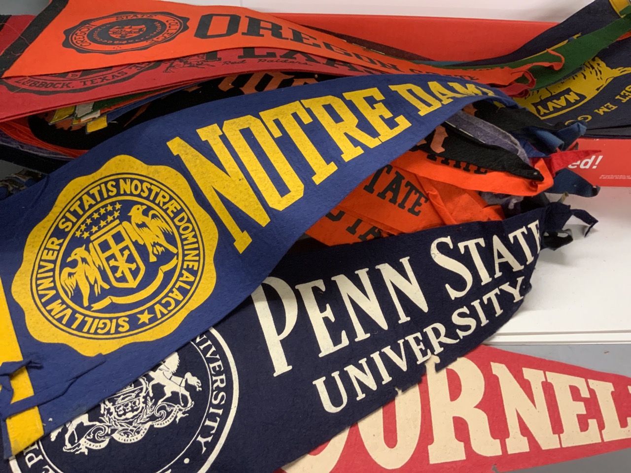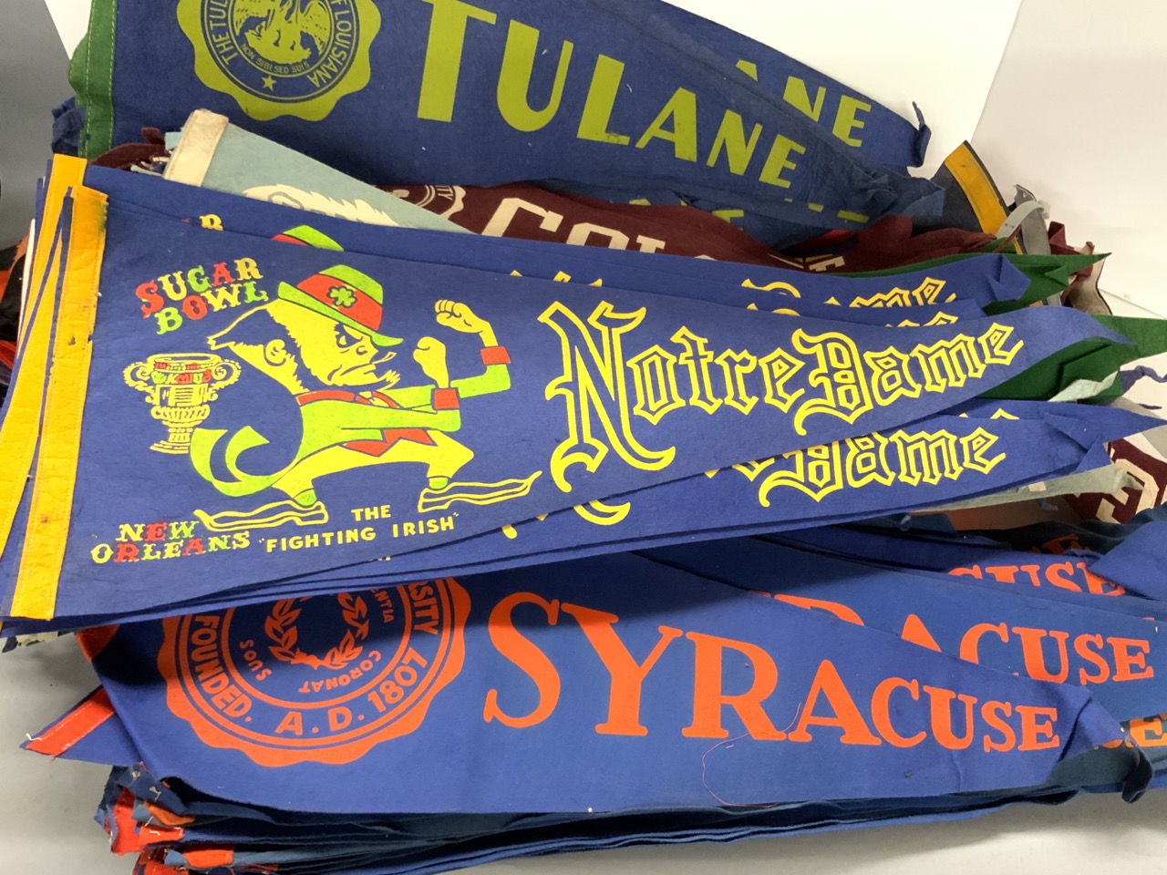 College Pennant Collection. Approx. 80 pieces. Harvard, Notre Dame Sugar Bowl, Northwestern, Colgate, Penn State, Air Force, University of Miami, Tulane, Alabama and More! Some edge wear, most all good.