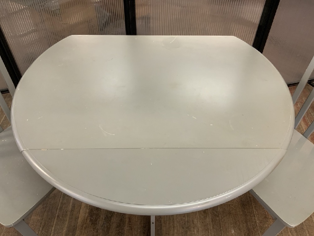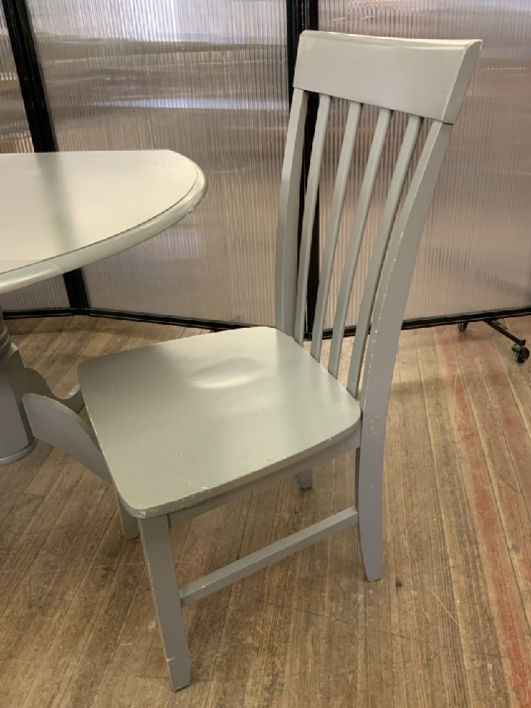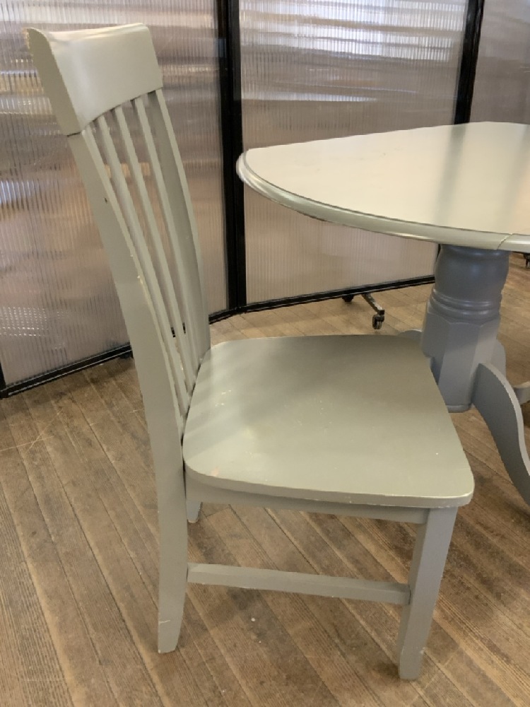 Wood slots for one side of the table that holds the leaf up are missing. The table and chairs both have some minor scratches