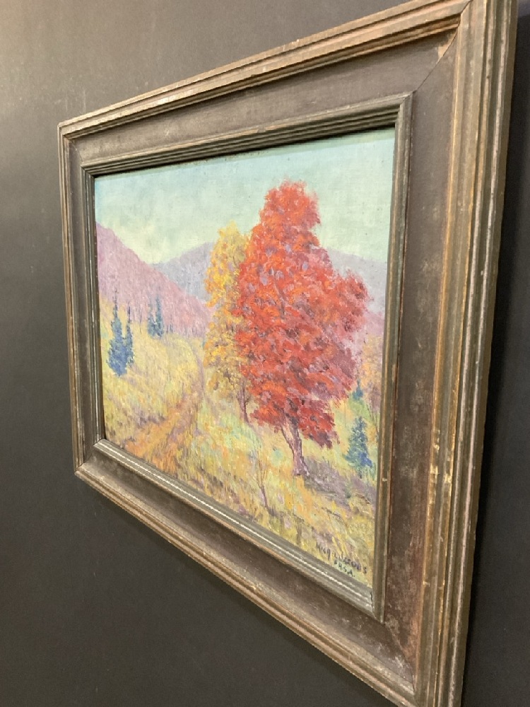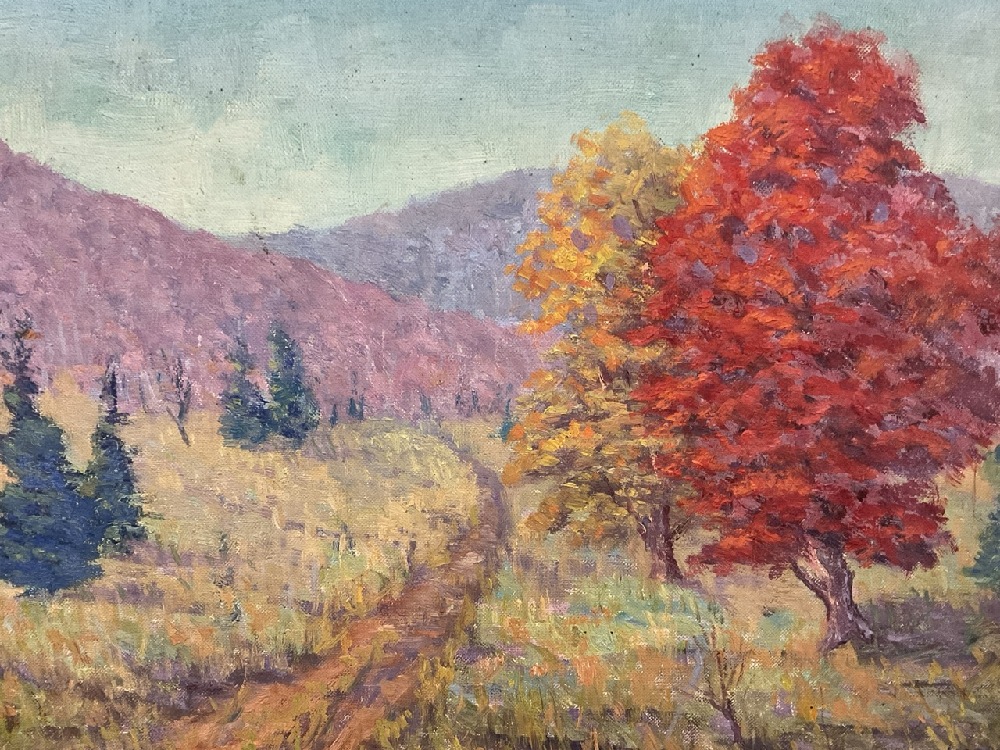 Untitled: Autumn landscape with colorful trees and mountain in distance.