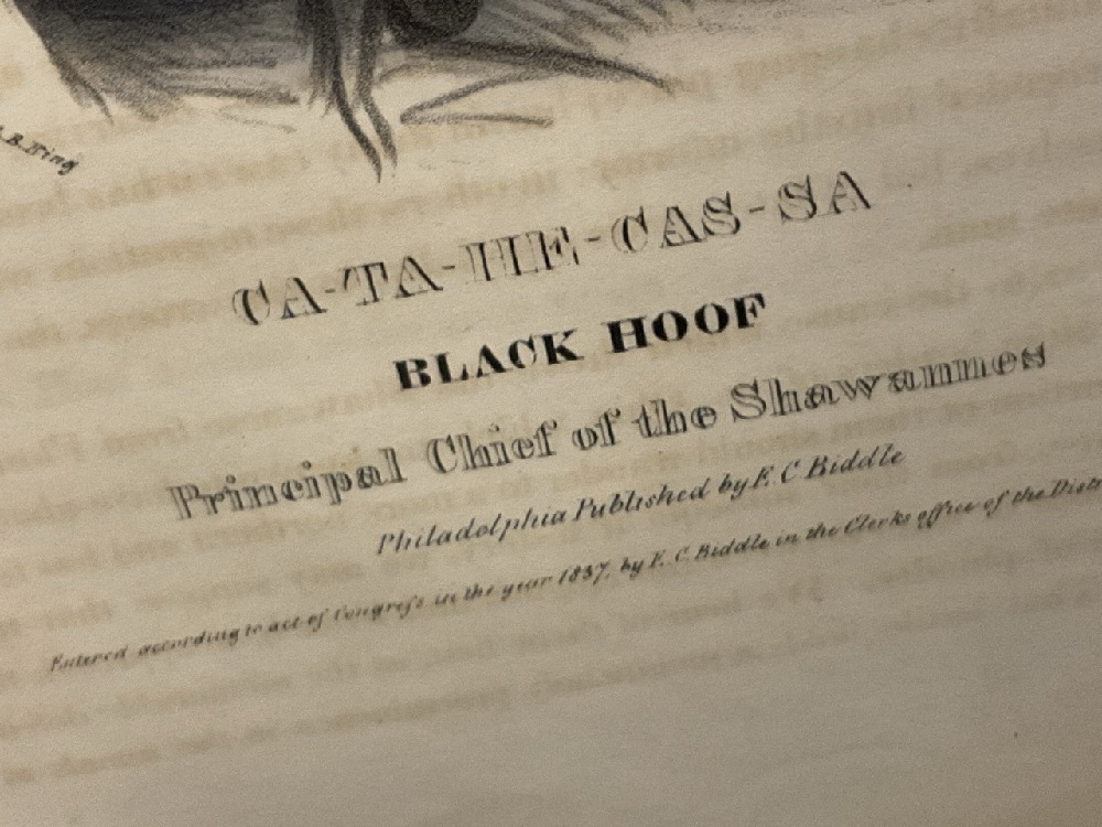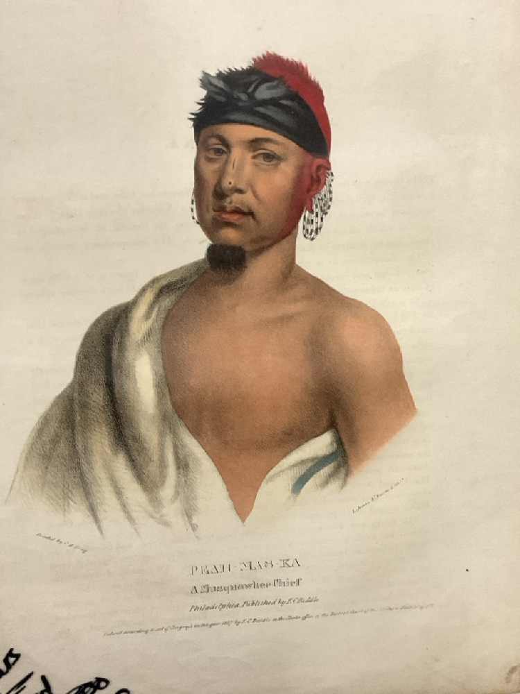 MCKENNEY & HALL, E.C. BIDDLE, 1837, PEAH-MUS-KA / "A MUSQUAKEE CHIEF" and Ca-Ta-He-Cas-Sa "Black Hoof" . Published by E.C. Biddle, Philadelphia, 1837, from McKenney & Hall, History of the Indian Tribes of North America, 1793-1868.