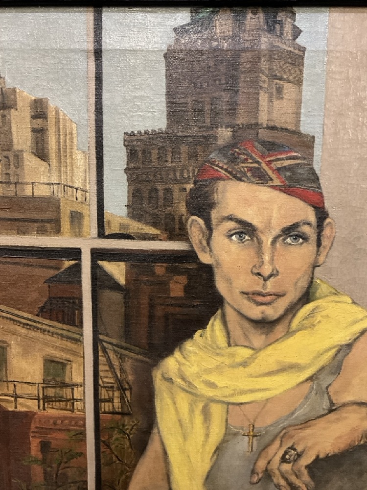 A portrait of Orest seated in a New York City apartment with buildings in view from the window.