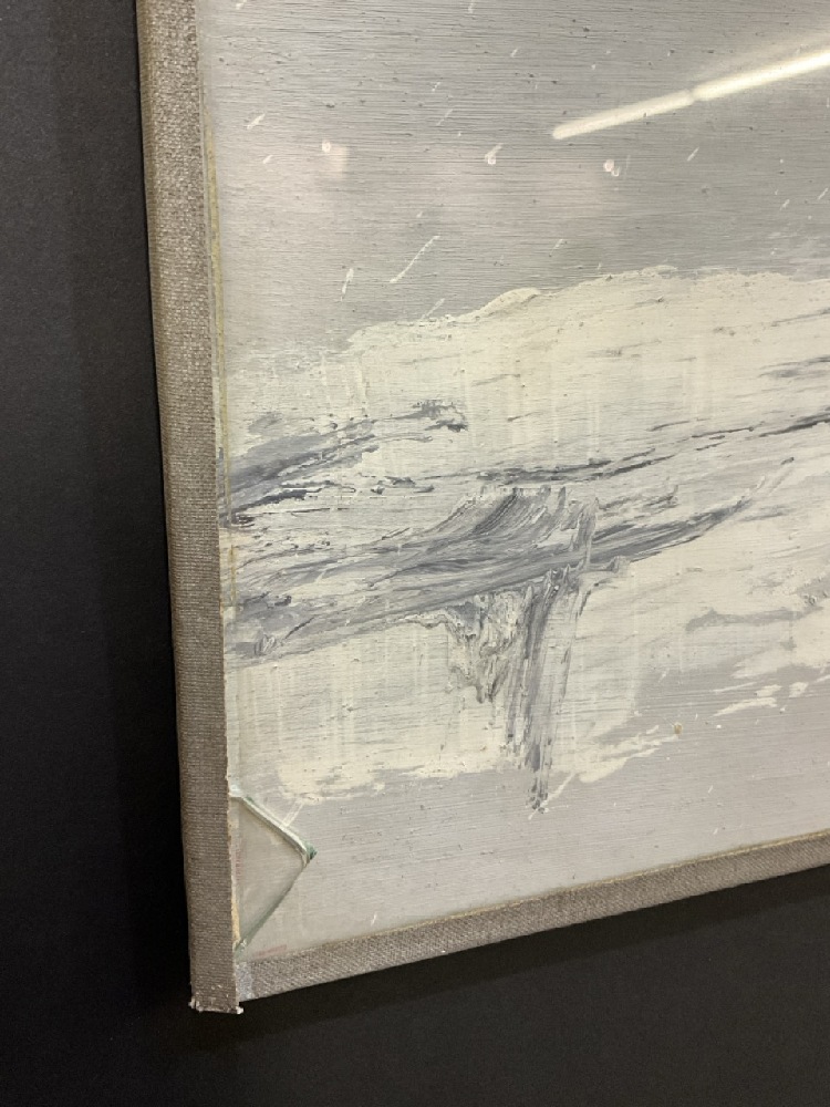 Damage noted at corner of glass. Does not affect painting. Can be removed prior to shipping.