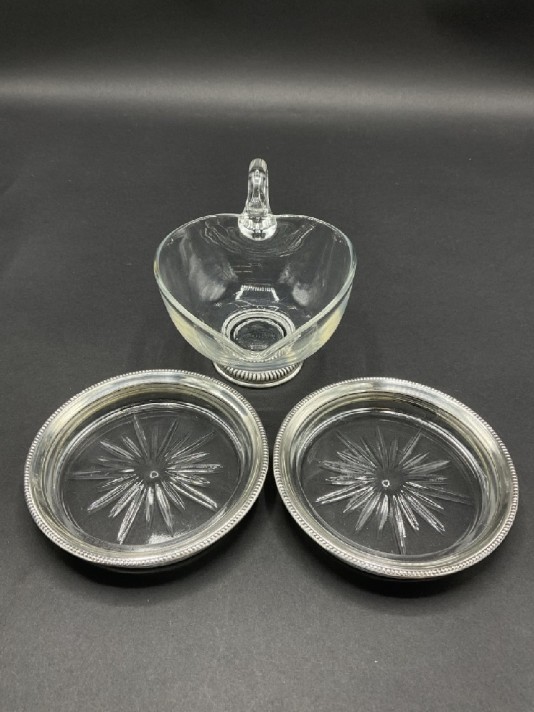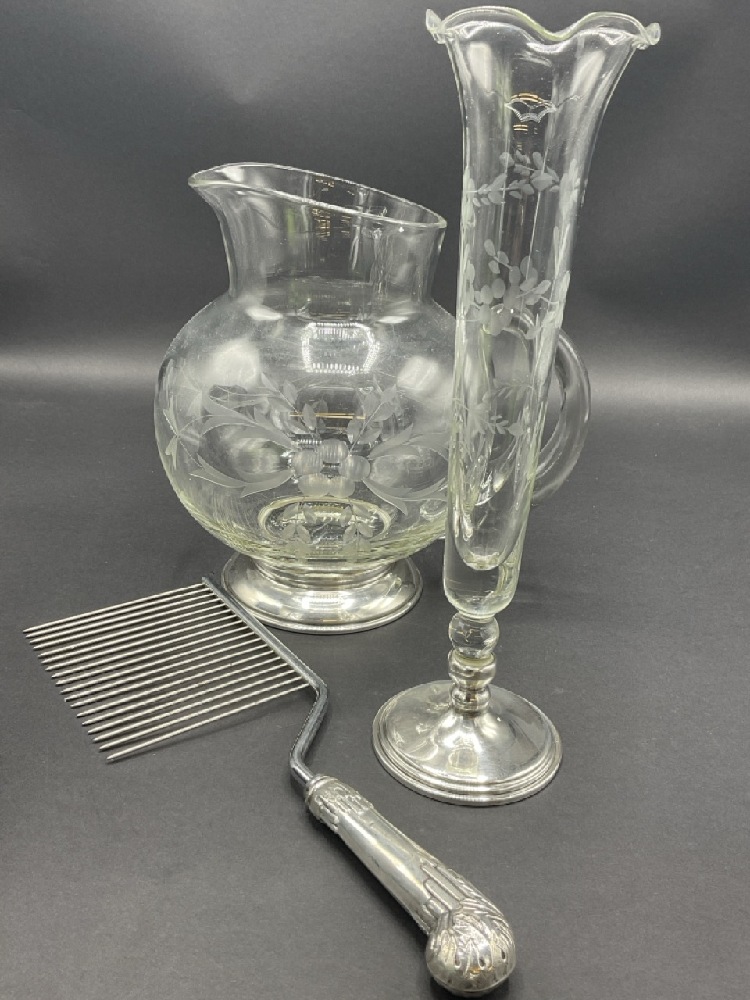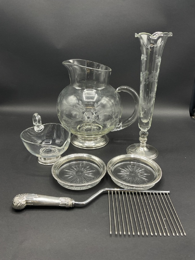 Compiled Etched Glass with Sterling Silver Tablewares.