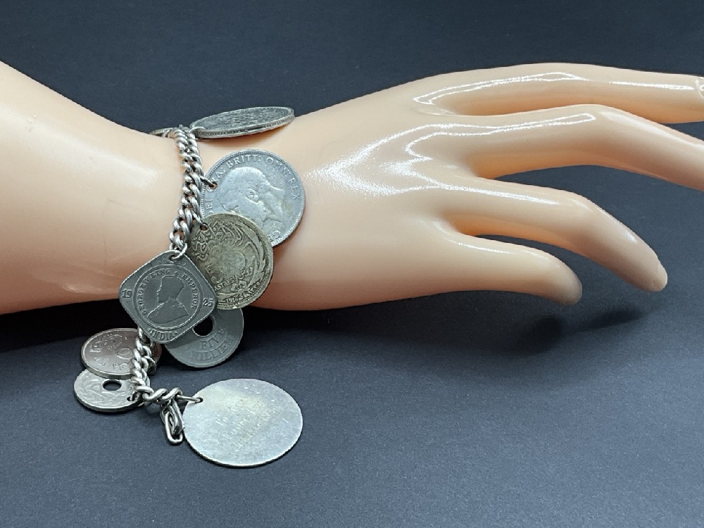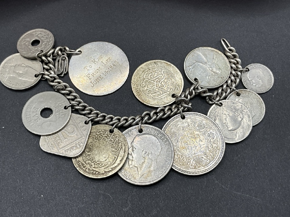 Vintage Foreign Coin Charm Style Bracelet. Some coins having silver content.