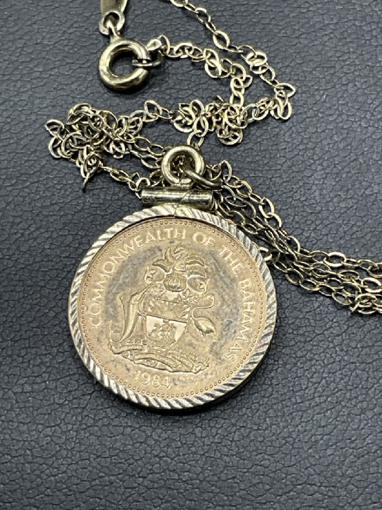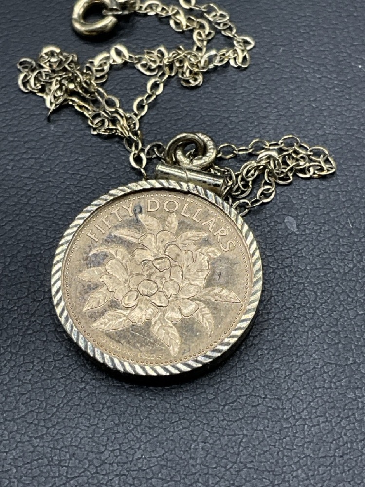 1984 Commonwealth of Bahamas 50 Dollar Gold Coin. Housed in sterling silver vermeil frame with necklace.