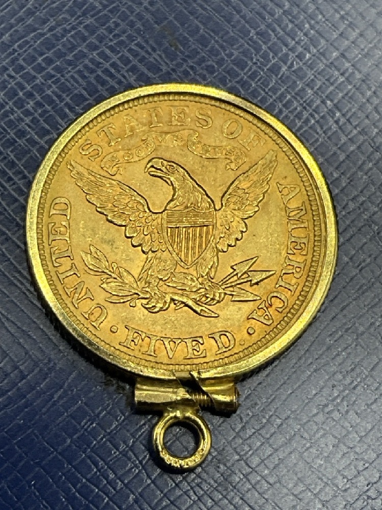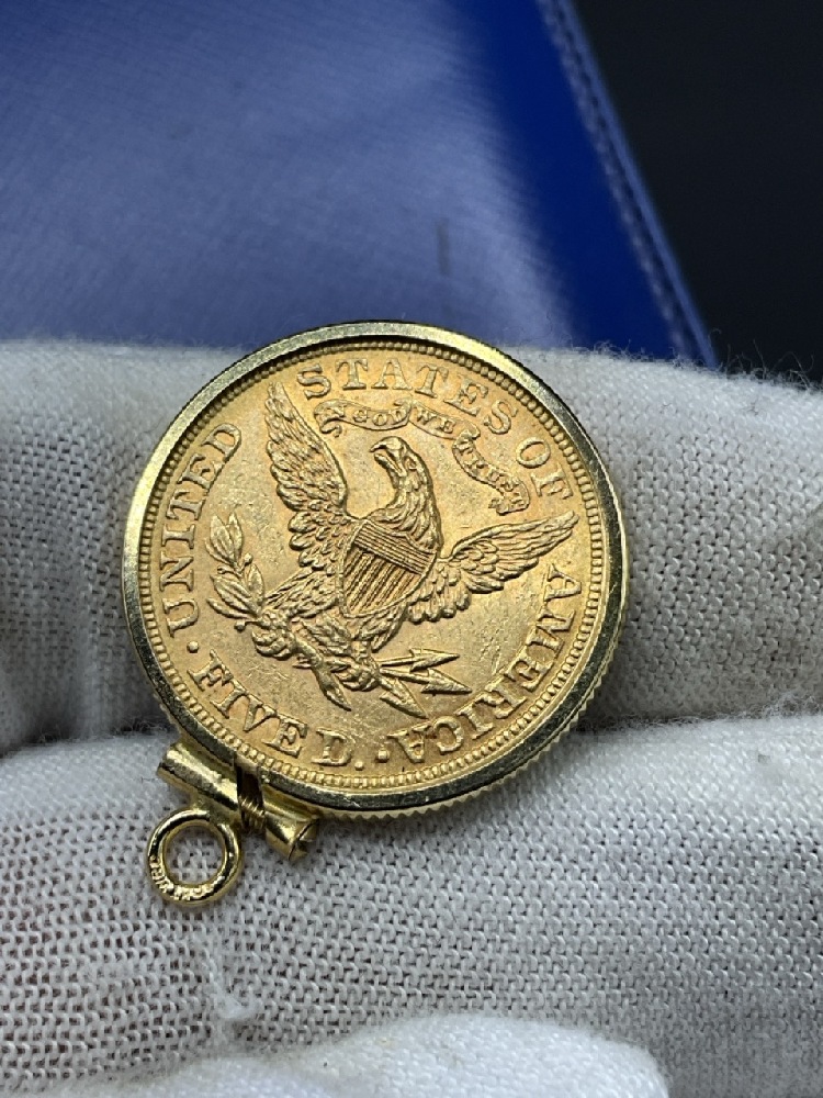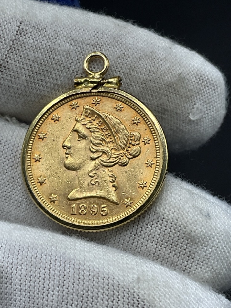 1895 U.S. Liberty Head Eagle $5 Gold Coin. Housed in 14K frame.