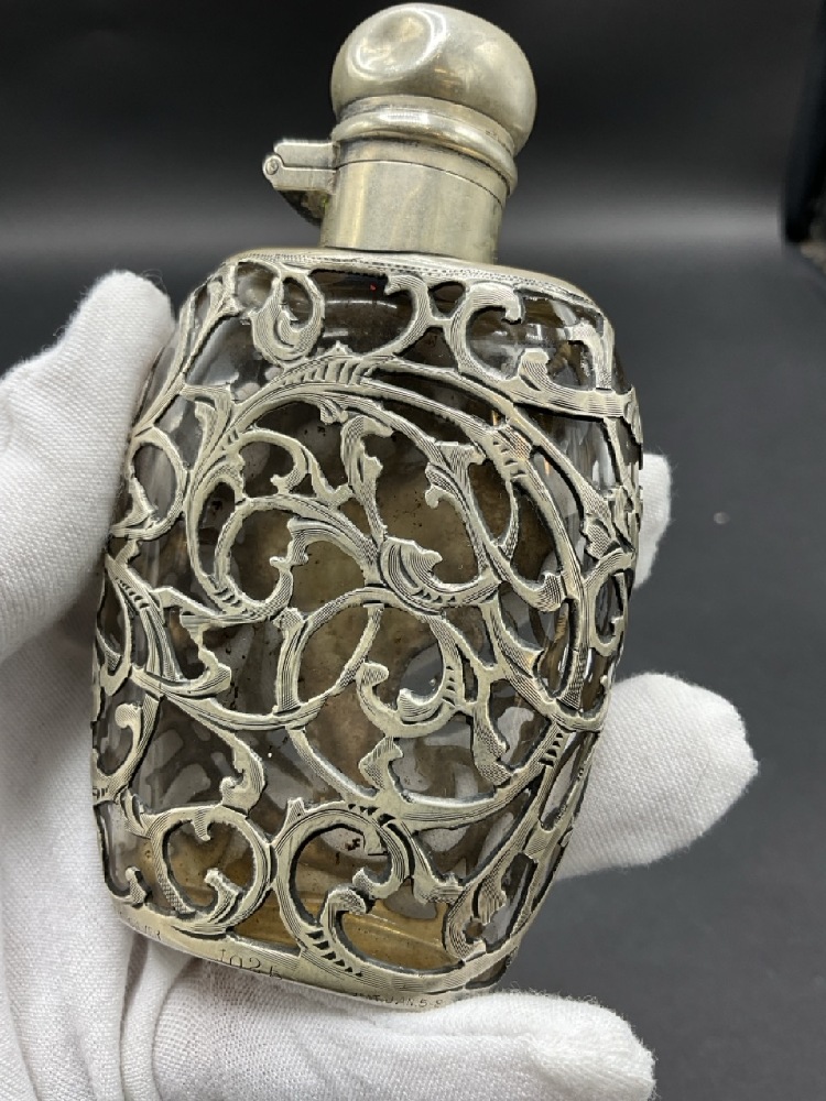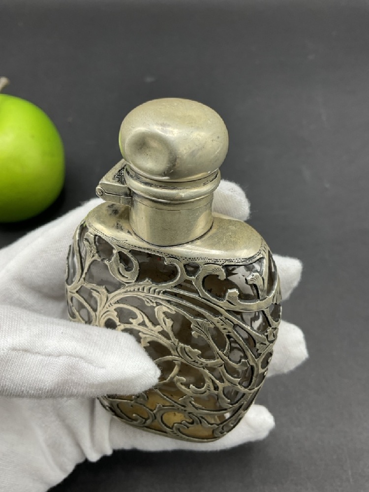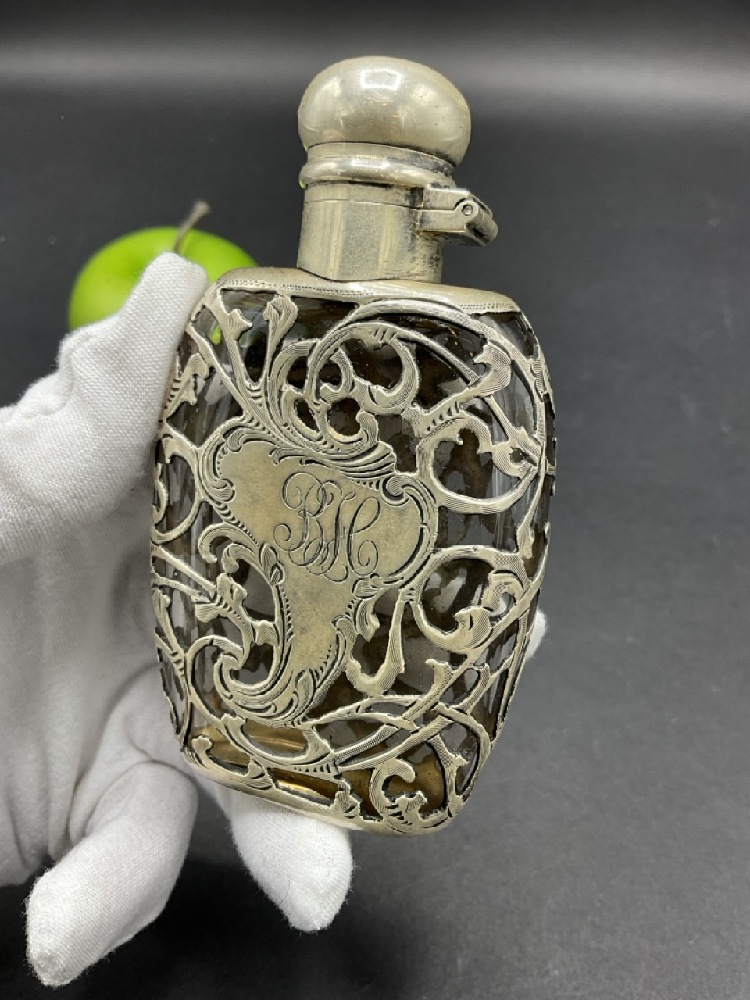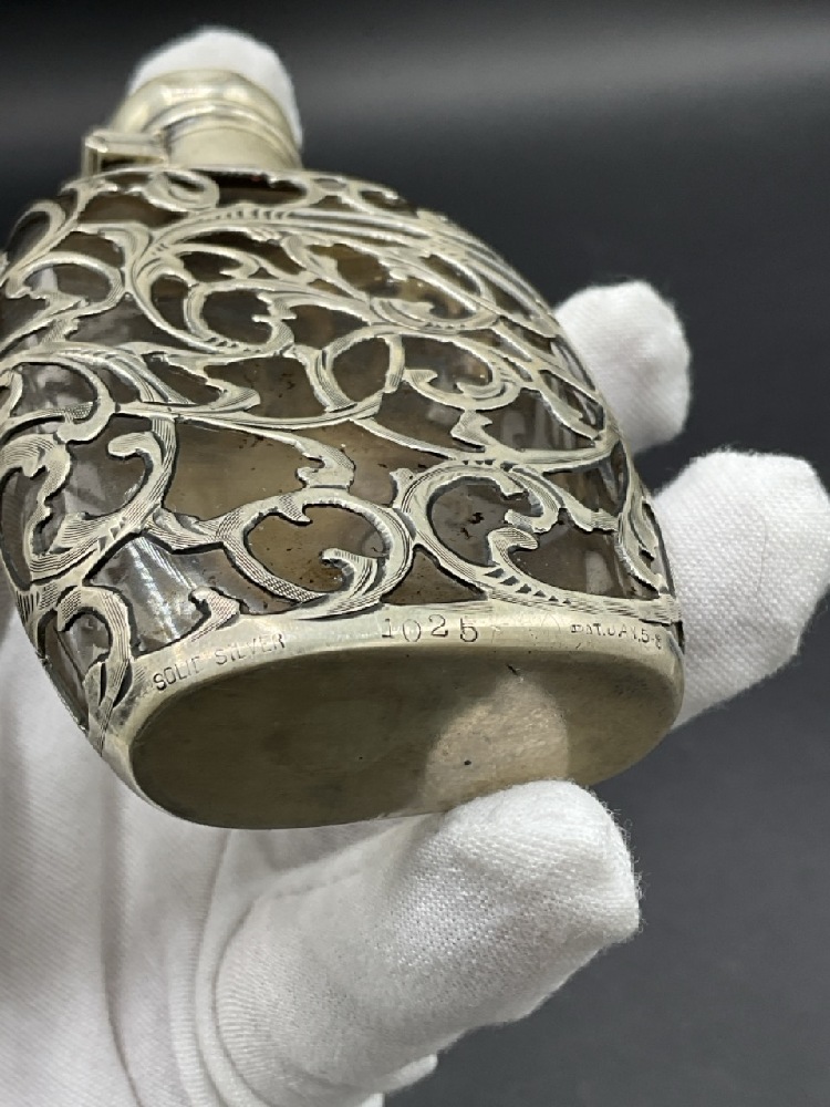 Antique Sterling Silver Flask. Glass flask with sterling silver work. Cap has dimple dent.
