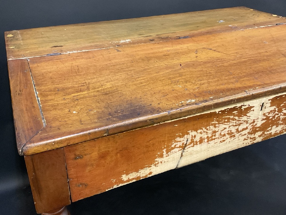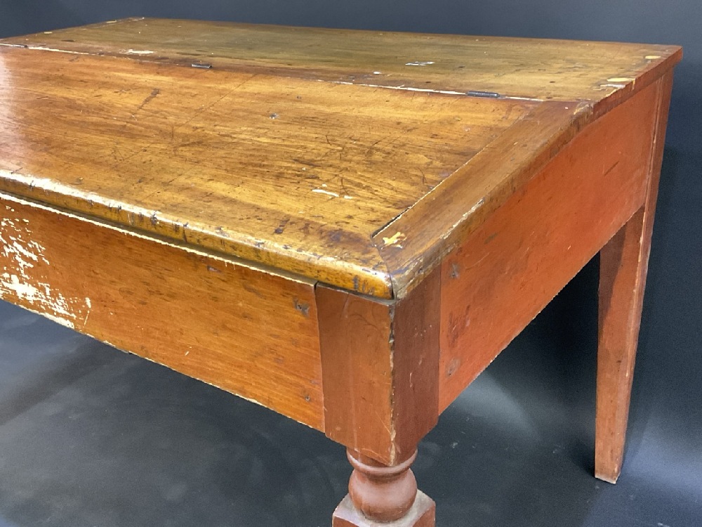 Antique Pine Plantation Desk with large oversized slanted table top flipping up to a large area of storage space.