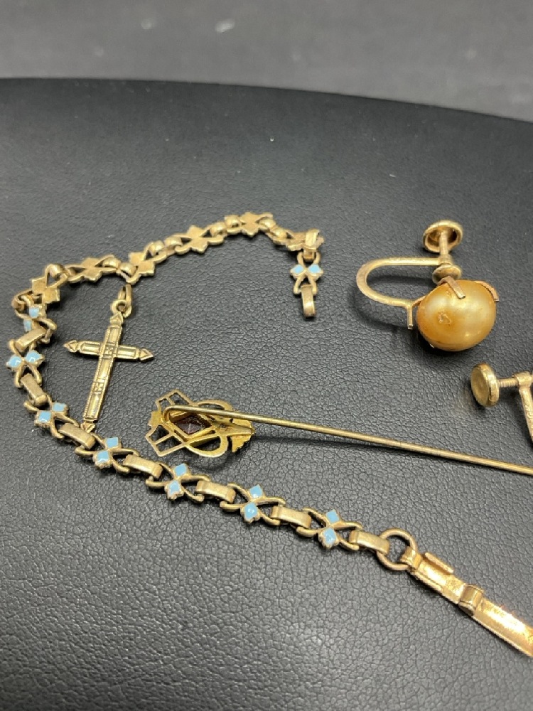 Estate compiled 10K Gold Jewelry. Enameled bracelet needing repair, earrings with faux pearls, cross pendant and Victorian stick pin with ruby stone. As seen in photograph preview.