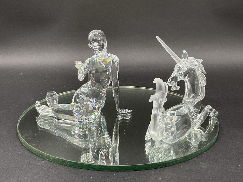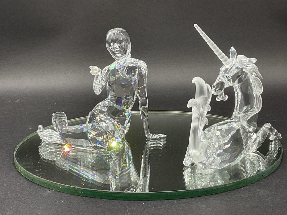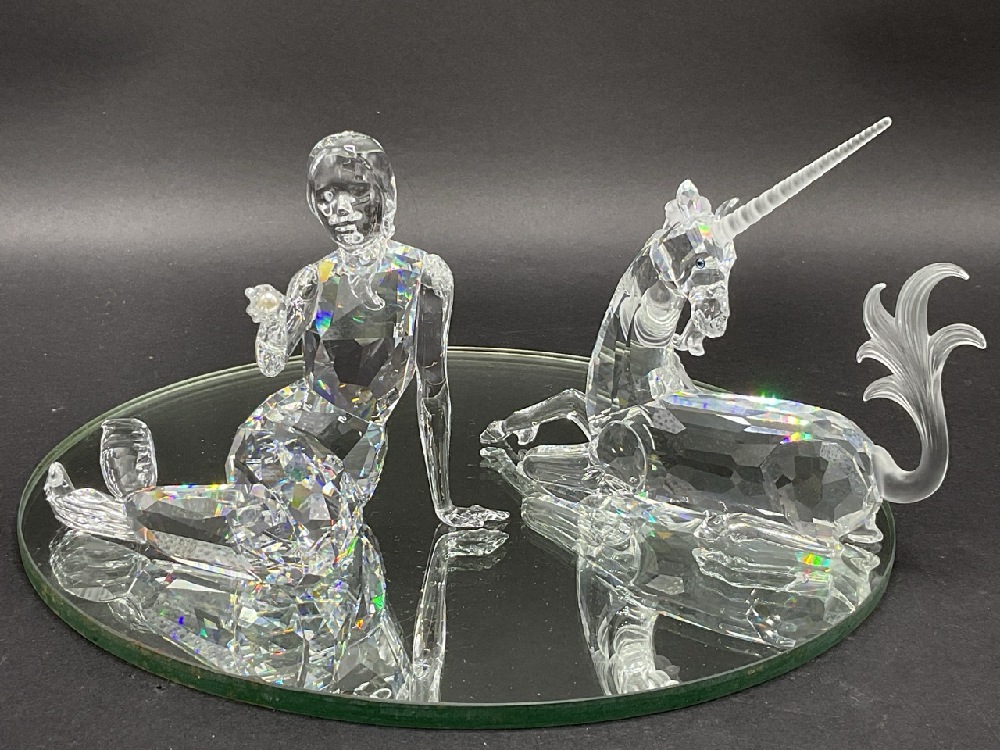 Fables and Fairytales Swarovski Crystal Grouping. Mermaid with pearl and Unicorn with jeweled eyes.