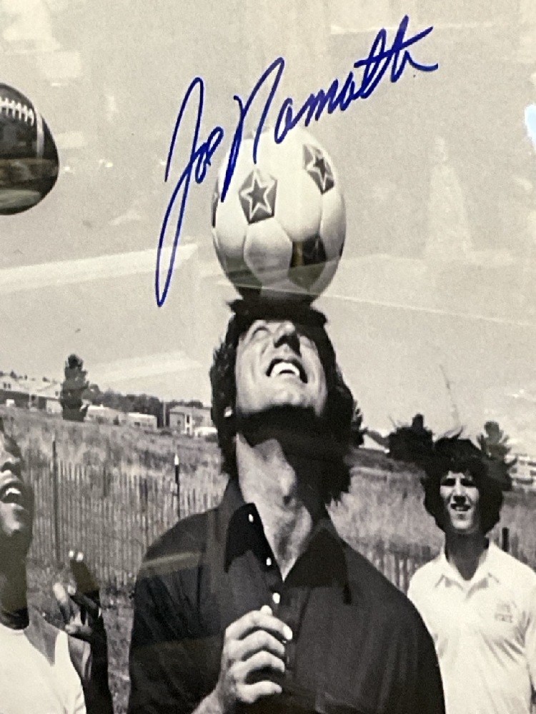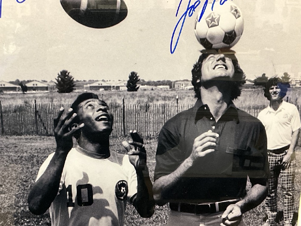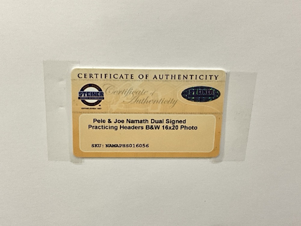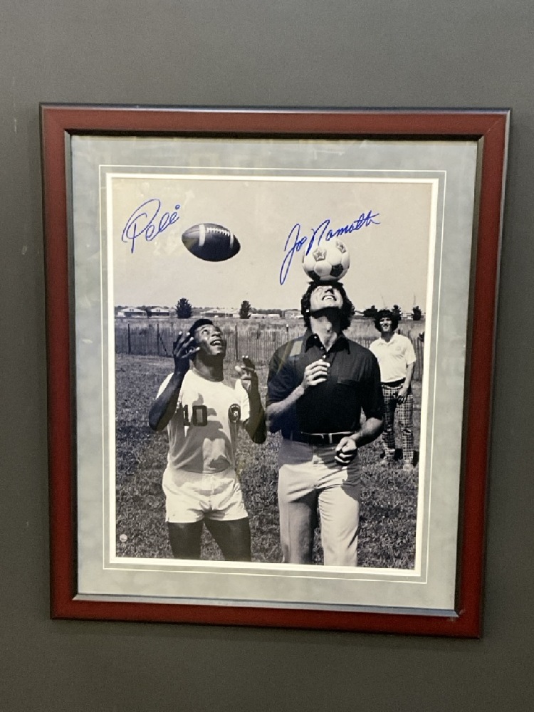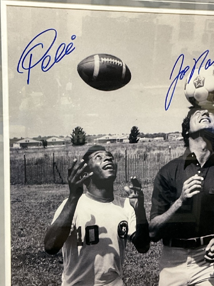 Pele And Joe Namath Dual Signed Practicing Headers Framed Photograph