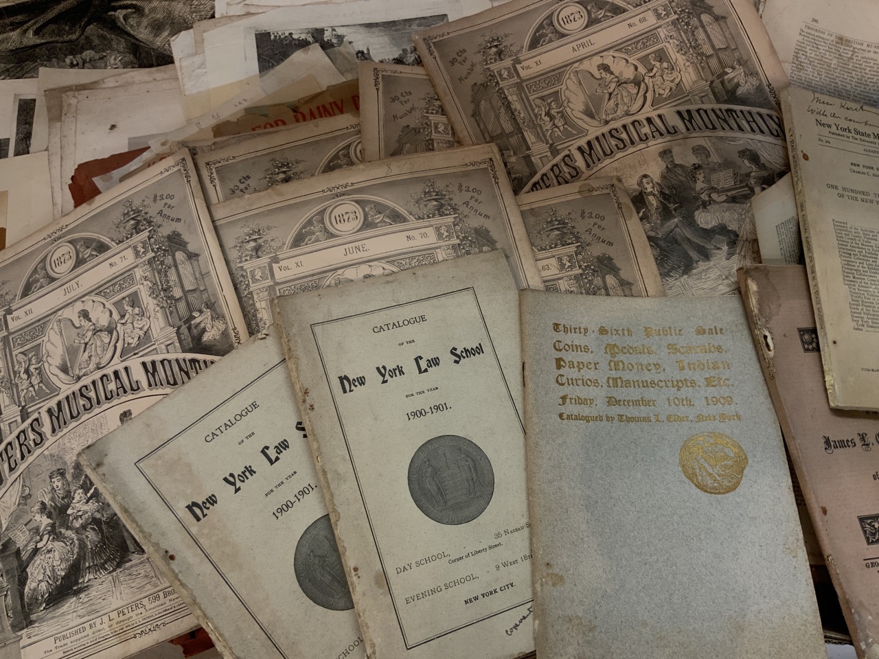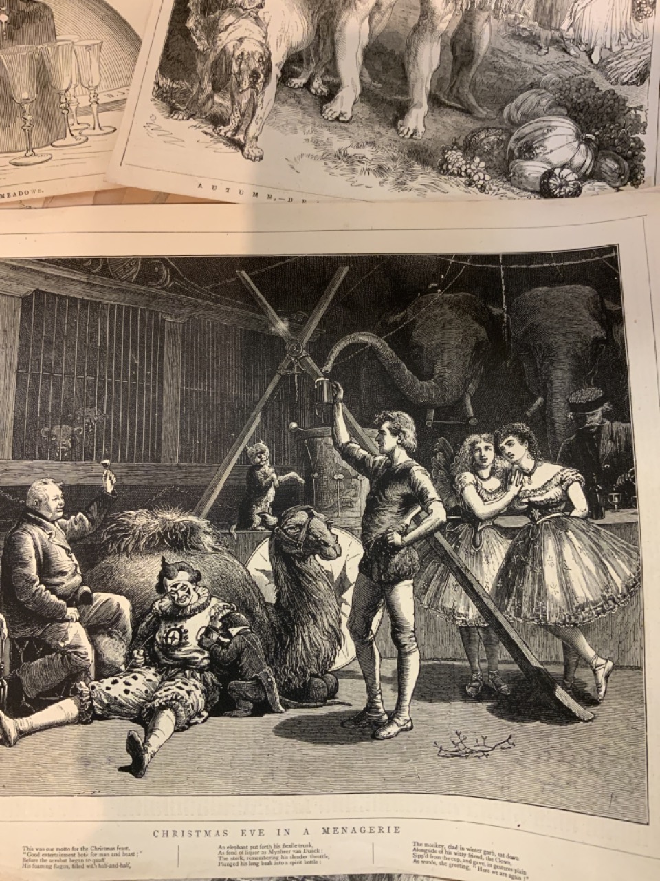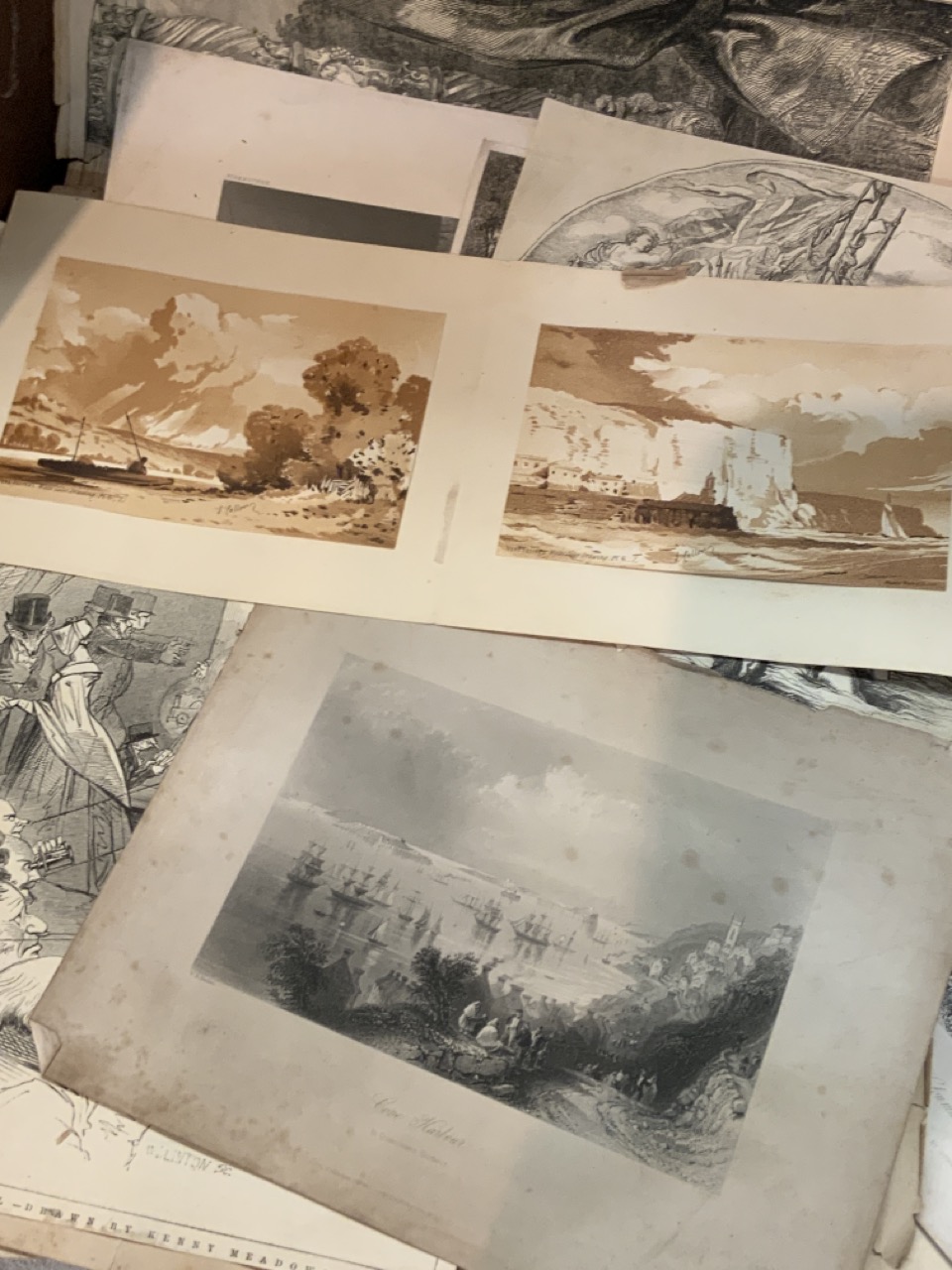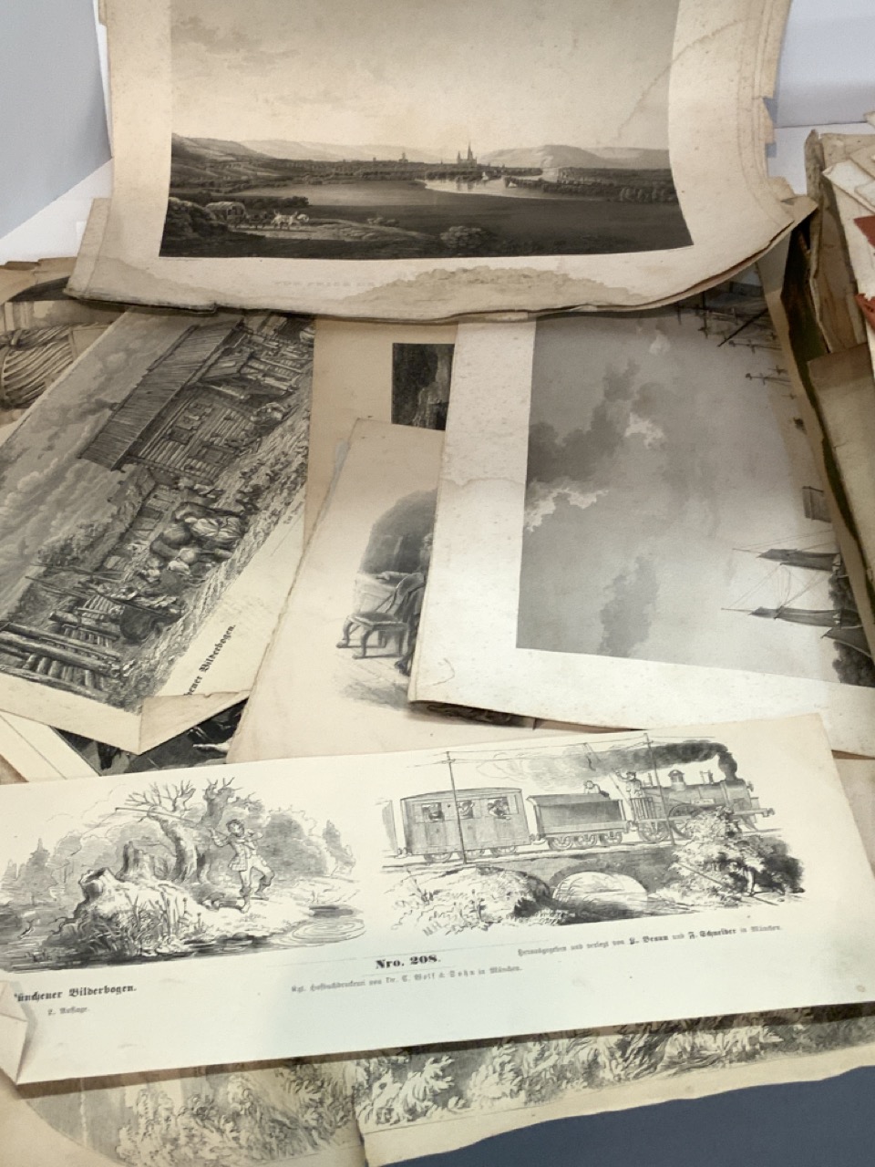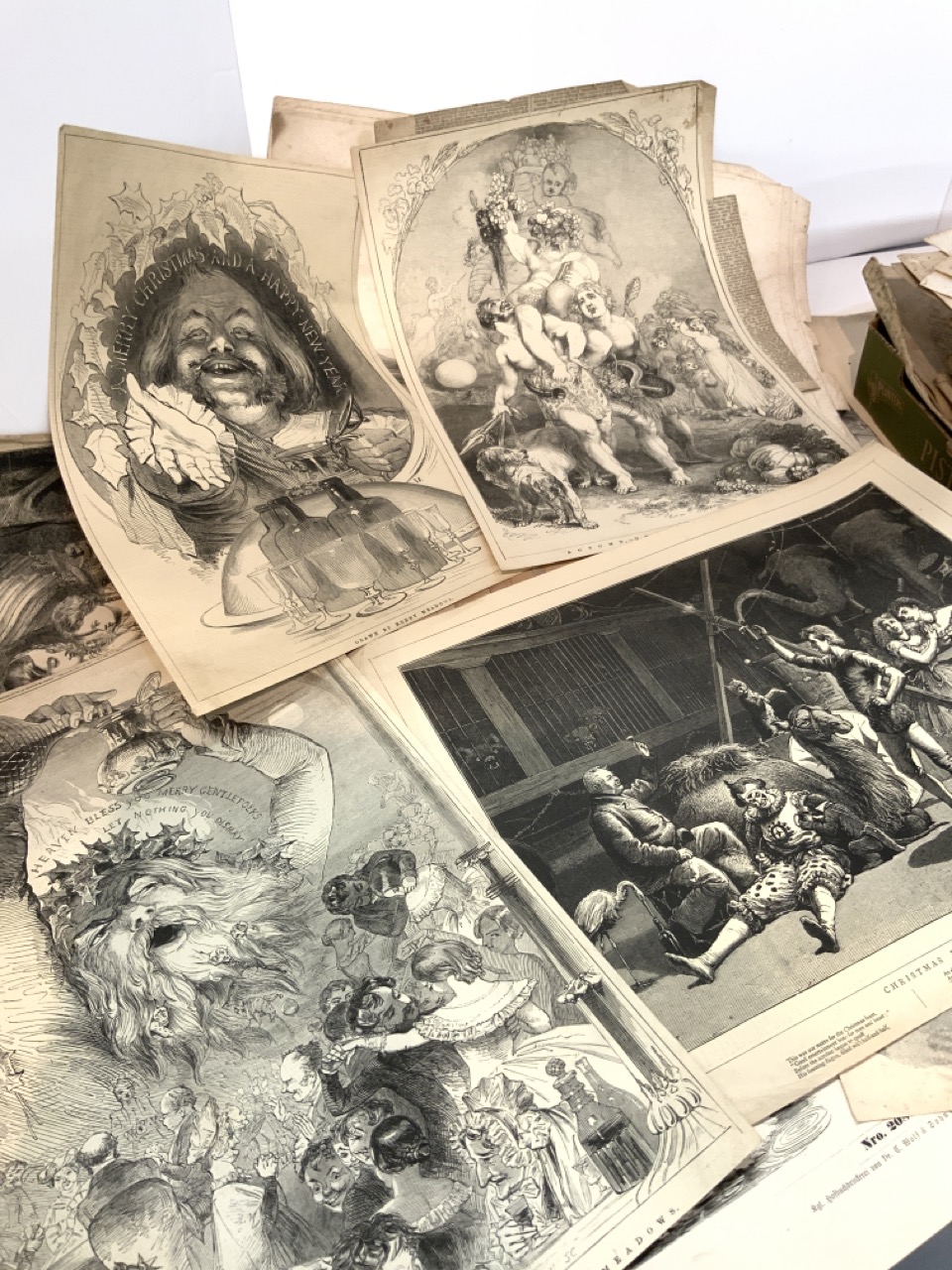 A compiled grouping of engravings, etchings, Christmas related and art related material.