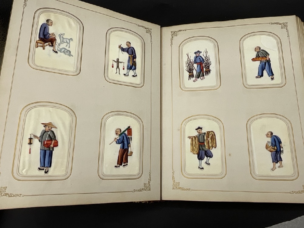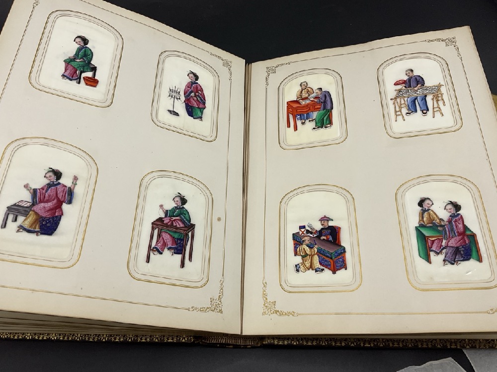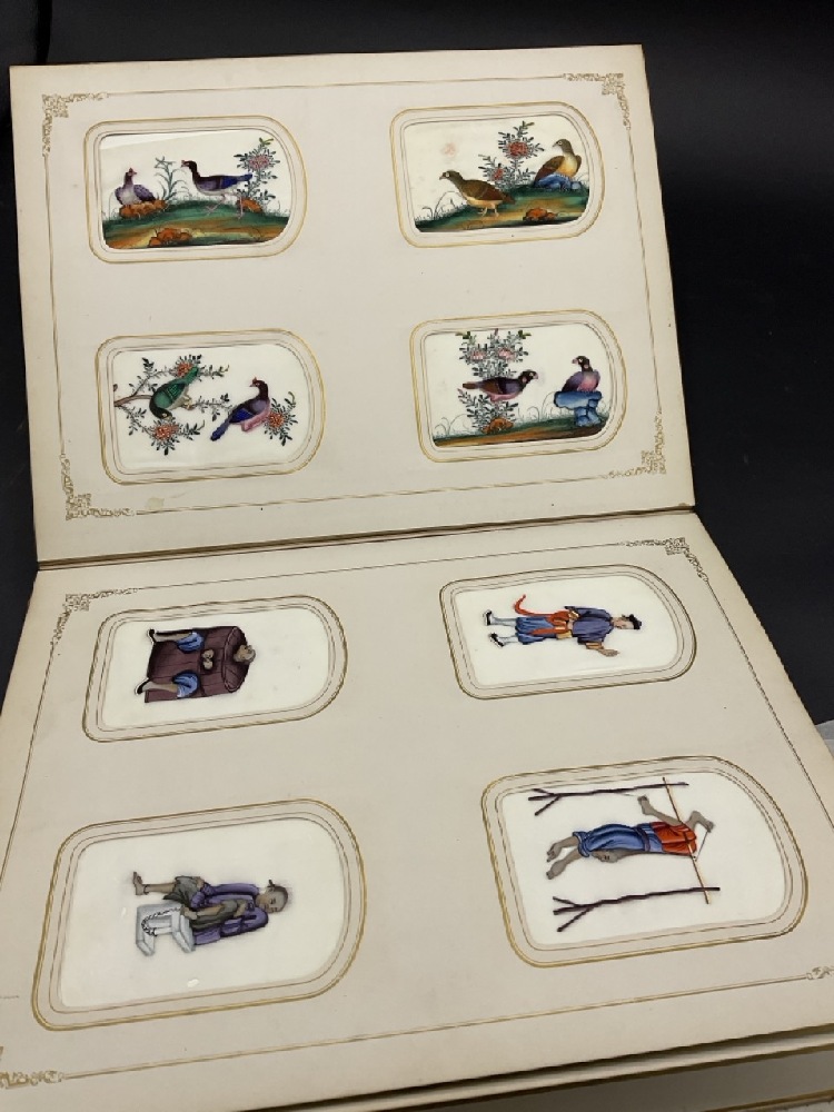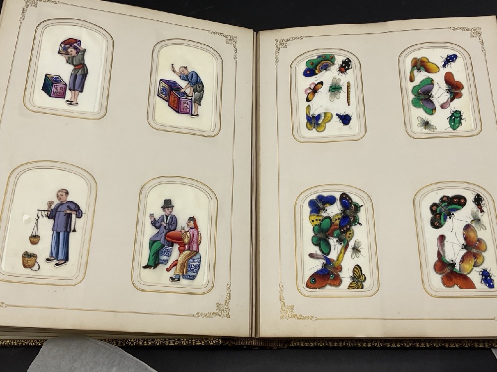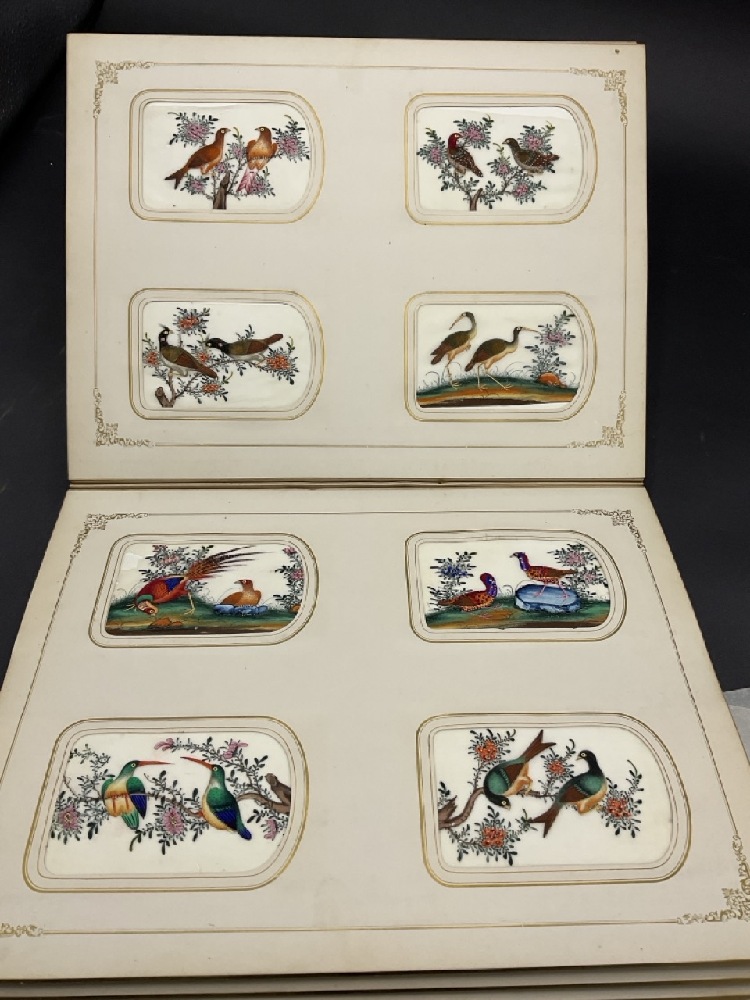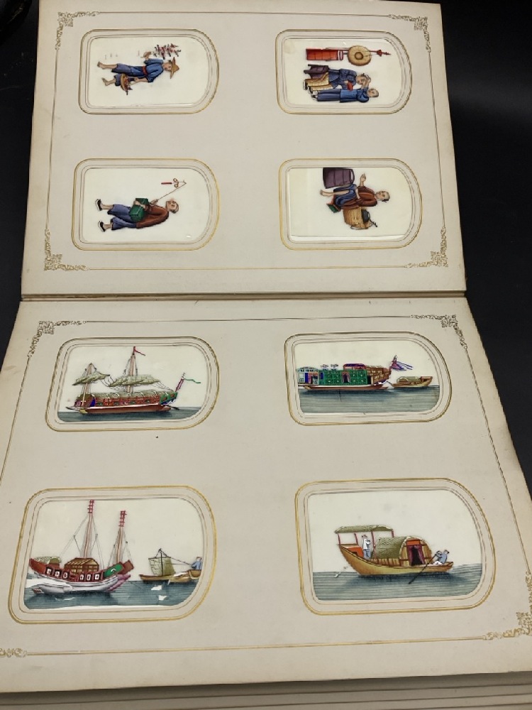 A Victorian Album filled with 120 quantity Chinese Pitch Watercolor Paintings. Including Ships, Birds, People, Torture, Bugs, Scenes and More! Some having wear but more than 90% of album is good. Please see photograph preview. This is an estate find from Prominent family heirlooms. This album remained in one family for over 100 years as collected.