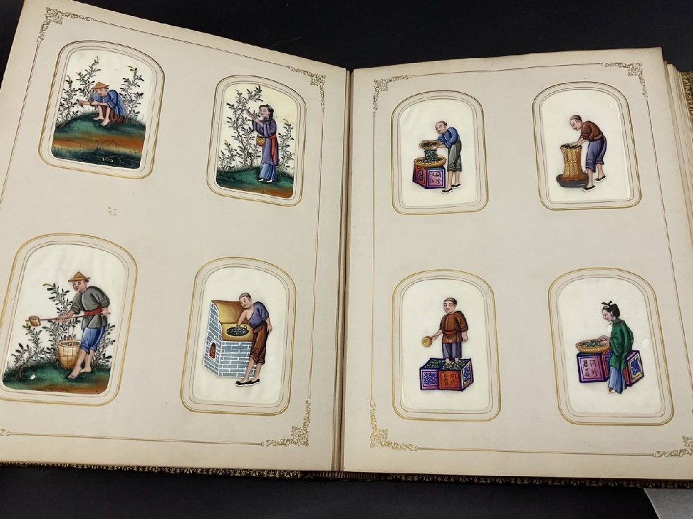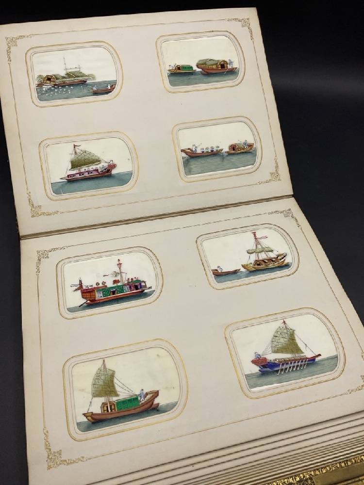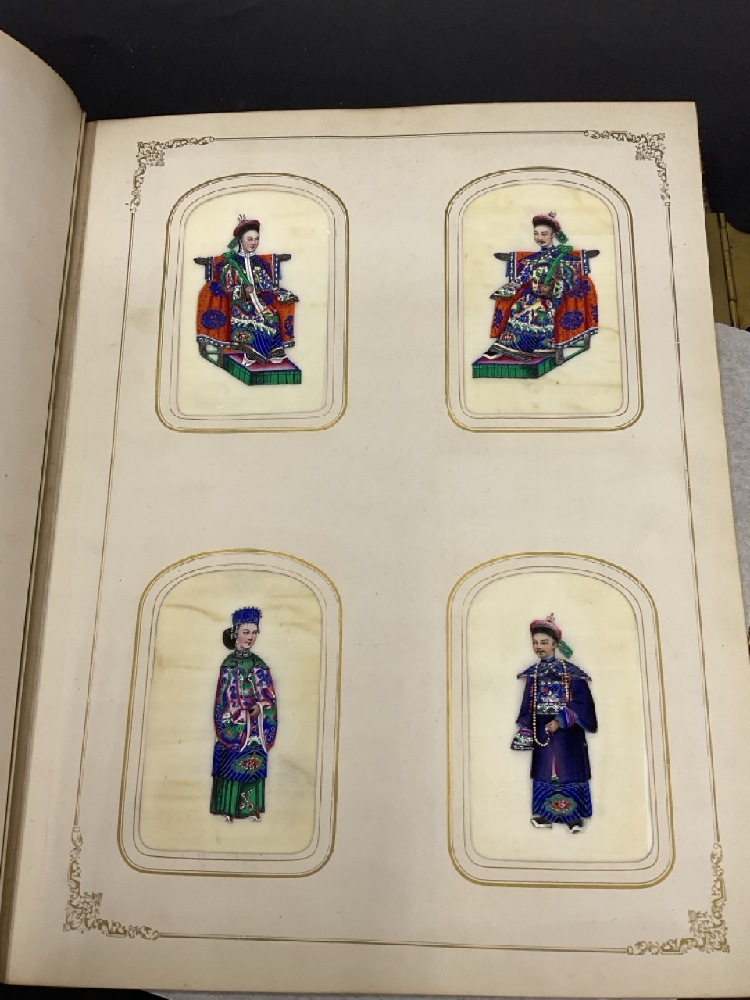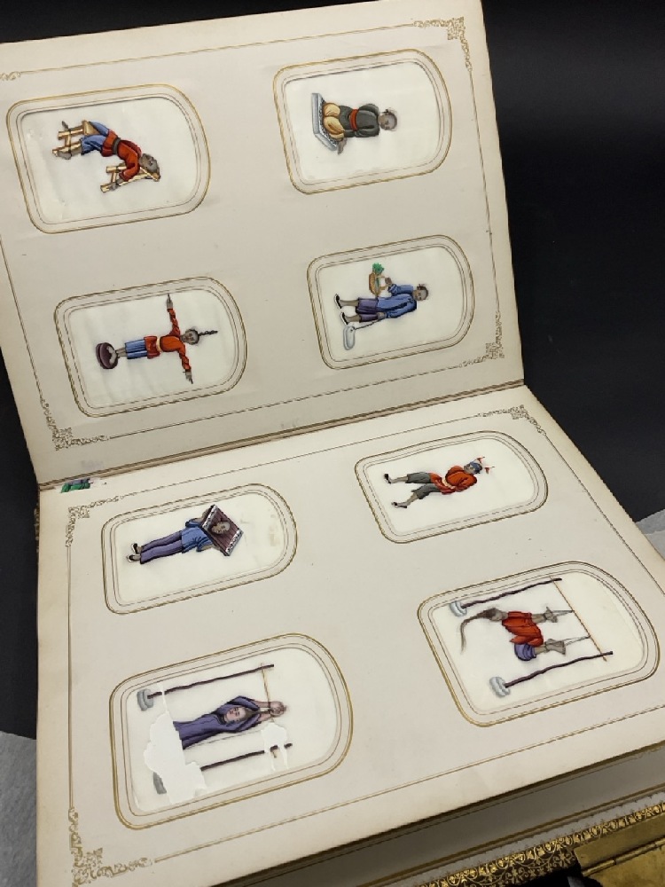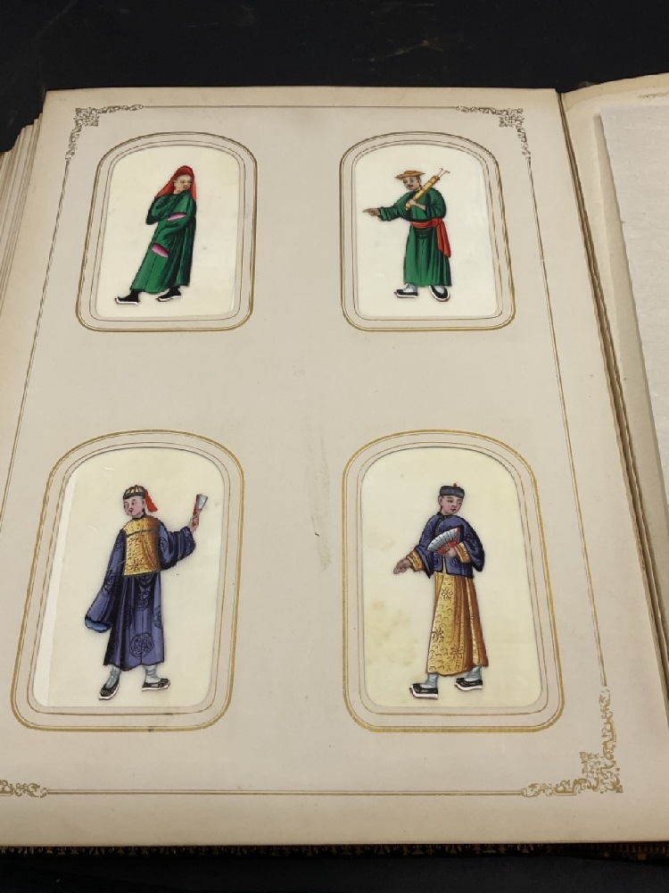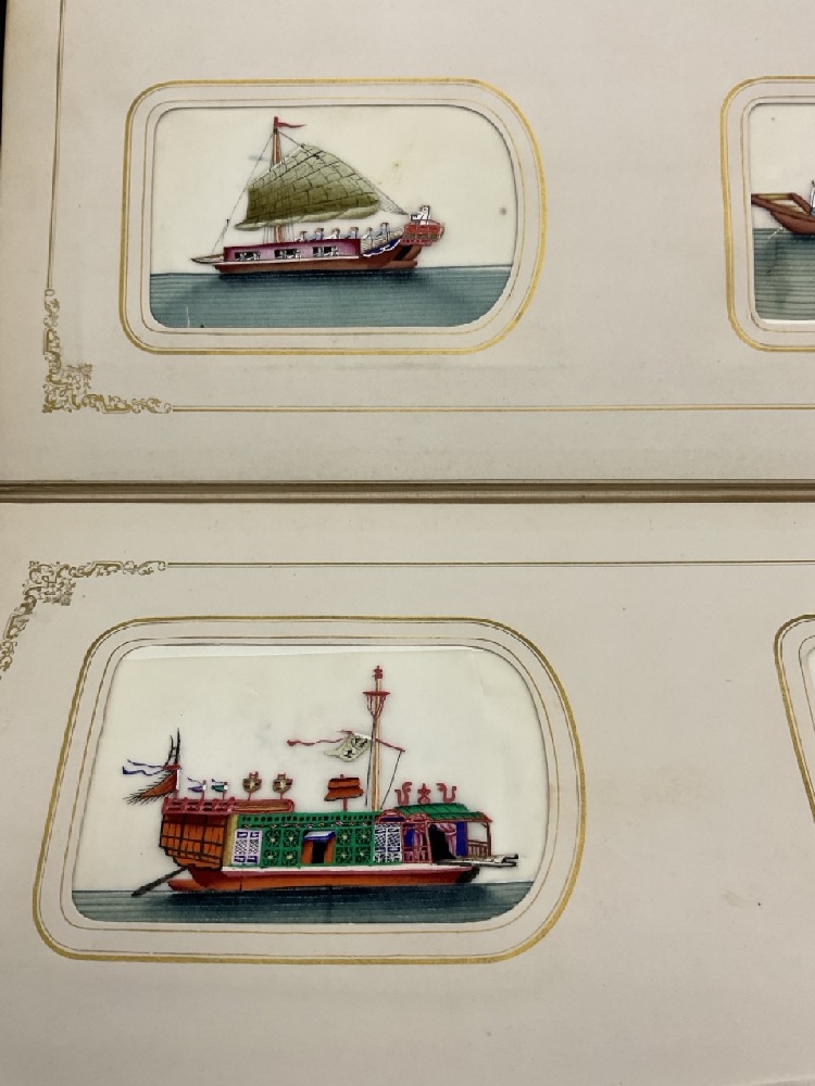 A Victorian Album filled with 120 quantity Chinese Pitch Watercolor Paintings. Including Ships, Birds, People, Torture, Bugs, Scenes and More! Some having wear but more than 90% of album is good. Please see photograph preview. This is an estate find from Prominent family heirlooms. This album remained in one family for over 100 years as collected.